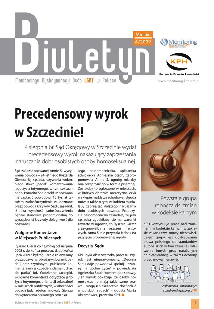 Maj-Sie 6/2009 www.monitoring.kph.org.pl Precedensowy wyrok w Szczecinie! 4 sierpnia br. Sąd Okręgowy w Szczecinie wydał precedensowy wyrok nakazujący zaprzestania naruszania dóbr osobistych osoby homoseksualnej. Sąd zakazał pozwanej Annie S. wyzywania powoda – 24-letniego Ryszarda Giersza, jej sąsiada, używania wobec niego słowa „pedał”, komentowania jego życia intymnego, w tym seksualnego. Ponadto Sąd orzekł, iż pozwana ma zapłacić powodowi 15 tys. zł tytułem zadośćuczynienia za doznane przez powoda krzywdy. Sąd uzasadnił, iż taka wysokość zadośćuczynienia będzie stanowiła proporcjonalną do wyrządzonej krzywdy dolegliwość dla pozwanej. Wulgarne Komentarze w Miejscach Publicznych Ryszard Giersz co najmniej od sierpnia 2008 r. do końca procesu, tj. do końca lipca 2009 r. był regularnie znieważany przez pozwaną, obrażany słowami„pedał”, oraz czynionymi publicznie komentarzami jak: „pedały idą się ruchać do parku” itd. Codzienne zaczepki, wulgarne komentarze dotyczące jego życia intymnego, orientacji seksualnej w miejscach publicznych, w obecności obcych ludzi zdeterminowały Giersza do wytoczenia opisanego procesu. Jego pełnomocniczka, aplikantka adwokacka Agnieszka Stach, zaproponowała Annie S. ugodę: miałaby ona przeprosić go w formie pisemnej. Zostałoby to ogłoszone w miejscach, w których obrażała mężczyznę, czyli w sklepie i na klatce schodowej. Ugoda mówiła także o tym, że kobieta musiałaby zaprzestać dalszego naruszania dóbr osobistych powoda. Propozycja pełnomocniczki zakładała, że jeśli sąsiadka zgodziłaby się na warunki zawarte w ugodzie, to Ryszard Giersz zrezygnowałby z roszczeń finansowych. Anna S. nie przystała jednak na przyjęcie proponowanej ugody. Decyzja Sądu KPH była obserwatorką procesu. Wyrok jest nieprawomocny. „Decyzja Sądu daje powodowi spokój i szansę na godne życie” – powiedziała Agnieszka Stach komentując sprawę. „Ten wyrok pokazuje, że osoby homoseksualne mają takie same prawa i mogą ich skutecznie dochodzić w polskich sądach” – dodała Marta Abramowicz, prezeska KPH. Biuletyn Monitoringu Dyskryminacji Osób LGBT w Polsce Powstaje grupa robocza ds. zmian w kodeksie karnym KPH kontynuuje prace nad zmianami w kodeksie karnym w zakresie zakazu tzw. mowy nienawiści. Celem grupy jest dostosowanie prawa polskiego do standardów europejskich w tym zakresie i włączenie innych grup narażonych na nietolerancję w zakres ochrony przed mową nienawiści. Zgłoszenia i informacje: [email protected] 1 KPH lobbuje na rzecz zmiany kodeksu karnego Prawnicy KPH, w ramach ustaleń II Okrągłego Stołu Organizacji LGBTQ, wypracowali szereg stanowisk prawnych dotyczących konieczności zmian w kodeksie karnym i wprowadzenia zwiększonej ochrony osób prześladowanych m.in. ze względu na ich orientację seksualną lub tożsamość płciową. Grupa Prawna KPH przesłała na ręce Ministra Sprawiedliwości oraz Rzecznika Praw Obywatelskich (RPO), opinie dotyczące nowelizacji art. 119, art. 256 i art. 257 kk (w chwili obecnej penalizujących jedynie zachowania dyskryminacyjne z takich powodów jak przynależność narodowa, etniczna, rasowa, wyznaniowa lub bezwyznaniowość). KPH w swoich opiniach podkreśliła, że wprowadzenie postulowanych rozwiązań byłoby wypełnieniem nie tylko konstytucyjnej zasady równości i niedyskryminacji, zniosłoby obecnie funkcjonującą hierarchię ochrony Poradnik nt. legalizacji związków jednopłciowych za granicą Grupa Prawna KPH opracowała poradnik na temat praktycznych aspektów instytucjonalizowania związków jednopłciowych przez Polki i Polaków za granicą. Poradnik zawiera informacje m.in. na temat prawa obowiązującego w Holandii, Belgii, Niemczech, Czechach, Szwecji i Hiszpanii. Podczas opracowywania publikacji skorzystano z ekspertyzy prawnej przygotowanej dla KPH przez prawników międzynarodowej firmy prawniczej Orrick, Herrington & Sutcliffe LLP z siedzibą w Nowym Jorku, z którą nawiązano kontakt poprzez udział KPH w Forum Pro Bono koordynowanym przez Public Interest Law Institute z siedzibą w Budapeszcie. Poradnik dostępny będzie bezpłatnie na stronie internetowej KPH oraz w formie publikacji drukowanej. 2 Przejawy homofobii w ogólnopolskiej prasie codziennej praw człowieka w Polsce, ale także wdrożyłoby szereg zaleceń i rekomendacji instytucji międzynarodowych (m.in. ONZ, Rady Europy i UE), które nasz kraj zawsze przyjmował bez zastrzeżeń. RPO poparł postulaty organizacji uznając, że takie przepisy byłyby użytecznym instrumentem przeciwdziałania dyskryminacji w Polsce. Co ciekawe, rząd, pomimo negatywnego stanowiska wobec proponowanych zmian, w swoim ostatnim sprawozdaniu z realizacji postanowień Międzynarodowego Paktu Praw Obywatelskich i Politycznych, zawarł informację, że zmiany w Kodeksie karnym będą zaproponowane. KPH wraz z Federacją na Rzecz Kobiet i Planowania Rodziny oraz Centrum Praw Kobiet opracowały i przesłały do ONZ swój raport alternatywny, gdzie m.in. ta sprzeczność została wytknięta polskim władzom. KPH protestuje przeciwko publikacji Rzeczpospolitej Kampania Przeciw Homofobii wystosowała protest przeciwko publikacji gazety Rzeczpospolita z dnia 15 czerwca 2009 roku. Na łamach dziennika ukazał się „satyryczny” rysunek autorstwa Andrzeja Krauzego przedstawiający mężczyznę zwracającego się do kozy słowami: Jeszcze tylko ci panowie wezmą ślub, a zaraz potem my. Graficzny komentarz ukazał się po Paradzie Równości, która miała miejsce 13 czerwca w Warszawie. W ten mało wyszukany sposób dziennik o zasięgu ogólnokrajowym podsumował postulat instytucjonalizacji związków osób tej samej płci zrównując homoseksualność z zoofilią. Żądanie przeprosin i wkroczenie na drogę sądową Publikacja spotkała się ze zdecydowaną reakcją osób skupionych wokół Stowarzyszenia Otwarte Forum, które po publikacji obraźliw