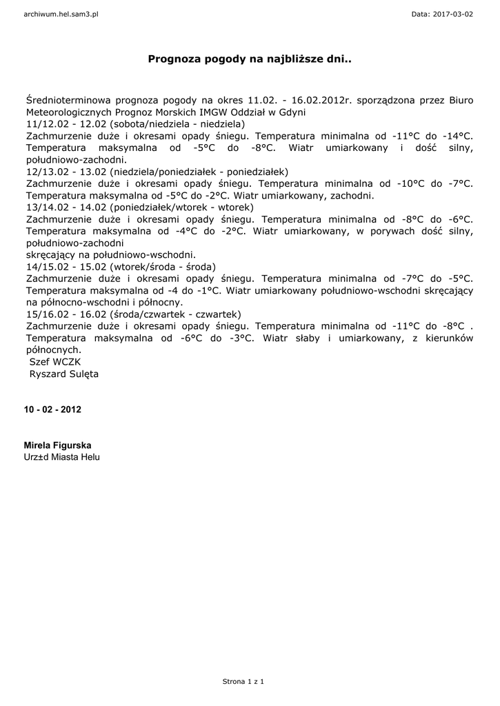 archiwum.hel.sam3.pl Data: 2017-03-02 Prognoza pogody na najbliższe dni.. Średnioterminowa prognoza pogody na okres 11.02. - 16.02.2012r. sporządzona przez Biuro Meteorologicznych Prognoz Morskich IMGW Oddział w Gdyni 11/12.02 - 12.02 (sobota/niedziela - niedziela) Zachmurzenie duże i okresami opady śniegu. Temperatura minimalna od -11°C do -14°C. Temperatura maksymalna od -5°C do -8°C. Wiatr umiarkowany i dość silny, południowo-zachodni. 12/13.02 - 13.02 (niedziela/poniedziałek - poniedziałek) Zachmurzenie duże i okresami opady śniegu. Temperatura minimalna od -10°C do -7°C. Temperatura maksymalna od -5°C do -2°C. Wiatr umiarkowany, zachodni. 13/14.02 - 14.02 (poniedziałek/wtorek - wtorek) Zachmurzenie duże i okresami opady śniegu. Temperatura minimalna od -8°C do -6°C. Temperatura maksymalna od -4°C do -2°C. Wiatr umiarkowany, w porywach dość silny, południowo-zachodni skręcający na południowo-wschodni. 14/15.02 - 15.02 (wtorek/środa - środa) Zachmurzenie duże i okresami opady śniegu. Temperatura minimalna od -7°C do -5°C. Temperatura maksymalna od -4 do -1°C. Wiatr umiarkowany południowo-wschodni skręcający na północno-wschodni i północny. 15/16.02 - 16.02 (środa/czwartek - czwartek) Zachmurzenie duże i okresami opady śniegu. Temperatura minimalna od -11°C do -8°C . Temperatura maksymalna od -6°C do -3°C. Wiatr słaby i umiarkowany, z kierunków północnych. Szef WCZK Ryszard Sulęta 10 - 02 - 2012 Mirela Figurska Urz±d Miasta Helu Strona 1 z 1