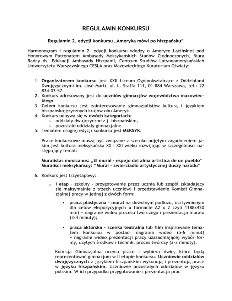 REGULAMIN KONKURSU Regulamin 2. edycji konkursu „Ameryka mówi po hiszpańsku” Harmonogram i regulamin 2. edycji konkursu wiedzy o Ameryce Łacińskiej pod Honorowym Patronatem Ambasady Meksykańskich Stanów Zjednoczonych, Biura Radcy ds. Edukacji Ambasady Hiszpanii, Centrum Studiów Latynoamerykańskich Uniwersytetu Warszawskiego CESLA oraz Mazowieckiego Kuratorium Oświaty: 1. Organizatorem konkursu jest XXII Liceum Ogólnokształcące z Oddziałami Dwujęzycznymi im. José Martí, ul. L. Staffa 111, 01-884 Warszawa, tel.: 22 834-03-57. 2. Konkurs adresowany jest do uczniów gimnazjów województwa mazowieckiego. 3. Celem konkursu jest zainteresowanie gimnazjalistów kulturą i językiem hiszpańskojęzycznych krajów obu Ameryk. 4. Konkurs odbywa się w dwóch kategoriach: o oddziały dwujęzyczne z j. hiszpańskim, o pozostałe oddziały gimnazjalne. 5. Tematem drugiej edycji konkursu jest MEKSYK. Prace konkursowe muszą być związane z szeroko pojętym zagadnieniem jakim jest kultura meksykańska XX i XXI wieku rozwijając w szczególności następujący temat: Muralistas mexicanos: „El mural - espejo del alma artística de un pueblo" Muraliści meksykańscy: “Mural - zwierciadło artystycznej duszy narodu” 6. Konkurs jest trzyetapowy: o I etap – szkolny - przygotowanie przez ucznia lub zespół (składający się maksymalnie z trzech uczniów) i przedstawienie Komisji Gimnazjalnej pracy w jednej z dwóch form: praca plastyczna - mural na dowolnym podłożu, usztywnionym dla celów ekspozycyjnych o formacie A2 x 2 czyli 1188x420 mm) + nagranie wideo procesu twórczego i prezentacja muralu (3-4 minuty); praca aktorska - scenka teatralna lub film inspirowane tematem konkursu w postaci nagrania wideo (5-6 minut) + nagranie wideo prezentacji pracy uzasadniającej wybór formy, użytych środków i technik, proces twórczy (2-3 minuty). Komisja Gimnazjalna ocenia prace i wybiera dwie, które będą reprezentować gimnazjum w II etapie konkursu. Uczniowie oddziałów dwujęzycznych z językiem hiszpańskim wykonują i prezentują prace w języku hiszpańskim. Uczniowie pozostałych oddziałów w języku polskim. W ich przypadku przygotowanie i prezentacja prac z elementami języka hiszpańskiego będzie dodatkowym atutem. o II etap – wojewódzki - ocena nadesłanych przez gimnazja prac przez Komisję Konkursową. Autorzy wybranych prac zostaną zaproszeni do udziału w III etapie. o III etap – finałowy – Test wiedzy o muralistach meksykańskich (30 minut). Bibliografia testu zostanie podana w późniejszym terminie (najpóźniej do 15 stycznia 2017 r .) na stronie Organizatora. Etap finałowy odbędzie się w XXII Liceum Ogólnokształcącym z Oddziałami Dwujęzycznymi im. José Martí w Warszawie. O wyniku końcowym decyduje suma punktów z testu oraz punktów przyznanych za pracę i jej prezentację. 7. Warunki uczestnictwa i przebieg konkursu: do dnia 3 marca 2017 r. gimnazja przesyłają do Organizatora konkursu prace wybrane przez Komisje Gimnazjalne na etapie szkolnym oraz kartę zgłoszenia zgodnie z załączonym wzorem. Kartę można przesłać e-mailem lub faksem; o w połowie marca Komisja Konkursowa ogłasza na stronie internetowej Organizatora listę uczniów i/lub zespołów zakwalifikowanych do III etapu konkursu oraz publikuje datę III etapu; o III etap konkursu odbędzie się na przełomie marca i kwietnia 2017 r. w XXII Liceum Ogólnokształcącym z Oddziałami Dwujęzycznymi im. José Martí, ul. L. Staffa 111 w Warszawie. W ramach finału odbędzie się również: wystawa/projekcja prac konkursowych oraz prelekcja przygotowana przez Ambasadę Meksykańskich Stanów Zjednoczonych. o 8. Zwycięzcy otrzymają nagrody rzeczowe oraz dyplomy. Wszyscy uczestnicy III etapu oraz nauczyciele przygotowujący otrzymają dyplomy uczestnictwa. Organizator zastrzega sobie prawo do niewyłonienia zwycięzców w poszczególnych kategoriach. Mogą również zostać przyznane wyróżnienia. 9. Przewidziana jest nagroda specjalna za najlepszą znajomość języka hiszpańskiego. 10. Prace konkursowe stają się własnością Organizatora konkursu, uczestnicy wyrażają zgodę na publikację prac i zdjęć z III etapu na stronie internetowej Organizatora, Ambasady Meksykańskich Stanów Zjednoczonych oraz Biura Radcy ds. Edukacji Ambasady Hiszpanii. Prace należy dostarczyć do XXII LO na nośniku elektronicznym lub przesłać na podany adres [email protected]. Szczegółowych informacji na temat konkursu udzielają drogą e-mailową przedstawiciele Organizatora, nauczyciele XXII LO, Monika Zwierzyńska-Pióro i Waldemar Kiendziński: e-mail: [email protected] strona internetowa: www.josemarti.pl tel/fax szkoły: (022) 834 03 57 Komisję Gimnazjalną powołuje organizator na szczeblu szkolnym wg. własnych zasad. Komisję Konkursową powołuje Organizator konkursu. Decyzja Komisji Konkursowej jest niepodważalna. KARTA ZGŁOSZENIA Konkurs „Ameryka mówi po hiszpańsku”, II edycja (pieczęć szkoły) Nazwa szkoły: ……………………………………………………............................................. ………………………………………..............................……………………………………………………… ……………………………………………………………………………………..............................………… Dokładny adres: ..........……………………………………………………………………………………………… ………………………………………..............................……………………………………………………… ……………………………………………………………………………………..............................………… Telefon szkoły: .....................................…………………………………………………………… Imię i nazwisko opiekuna…………………