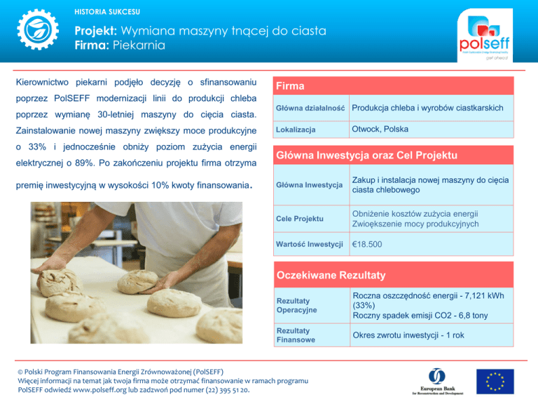 HISTORIA SUKCESU HISTORIE SUKCESÓW Projekt: Wymiana maszyny Projekt: Wymiana obrabiarki dotnącej metaludo ciasta Firma: Firma: Piekarnia Producent gotowych elementów z blach Kierownictwo piekarni podjęło decyzję o sfinansowaniu Przed poprzez PolSEFF modernizacji linii do produkcji chleba modernizacją poprzez wymianę 30-letniej maszyny do cięcia ciasta. Zainstalowanie nowej maszyny zwiększy moce produkcyjne o 33% i jednocześnie obniży poziom zużycia energii elektrycznej o 89%. Po zakończeniu projektu firma otrzyma premię inwestycyjną w wysokości 10% kwoty finansowania. Po Firma modernizacji Główna działalność Produkcja chleba i wyrobów ciastkarskich Lokalizacja Otwock, Polska Główna Inwestycja oraz Cel Projektu Główna Inwestycja Zakup i instalacja nowej maszyny do cięcia ciasta chlebowego Cele Projektu Obniżenie kosztów zużycia energii Zwioększenie mocy produkcyjnych Wartość Inwestycji €18.500 Oczekiwane Rezultaty Rezultaty Operacyjne Roczna oszczędność energii - 7,121 kWh (33%) Roczny spadek emisji CO2 - 6,8 tony Rezultaty Finansowe Okres zwrotu inwestycji - 1 rok © Polski Program Finansowania Energii Zrównoważonej (PolSEFF) Więcej informacji na temat jak twoja firma może otrzymać finansowanie w ramach programu PolSEFF odwiedź www.polseff.org lub zadzwoń pod numer (22) 395 51 20.