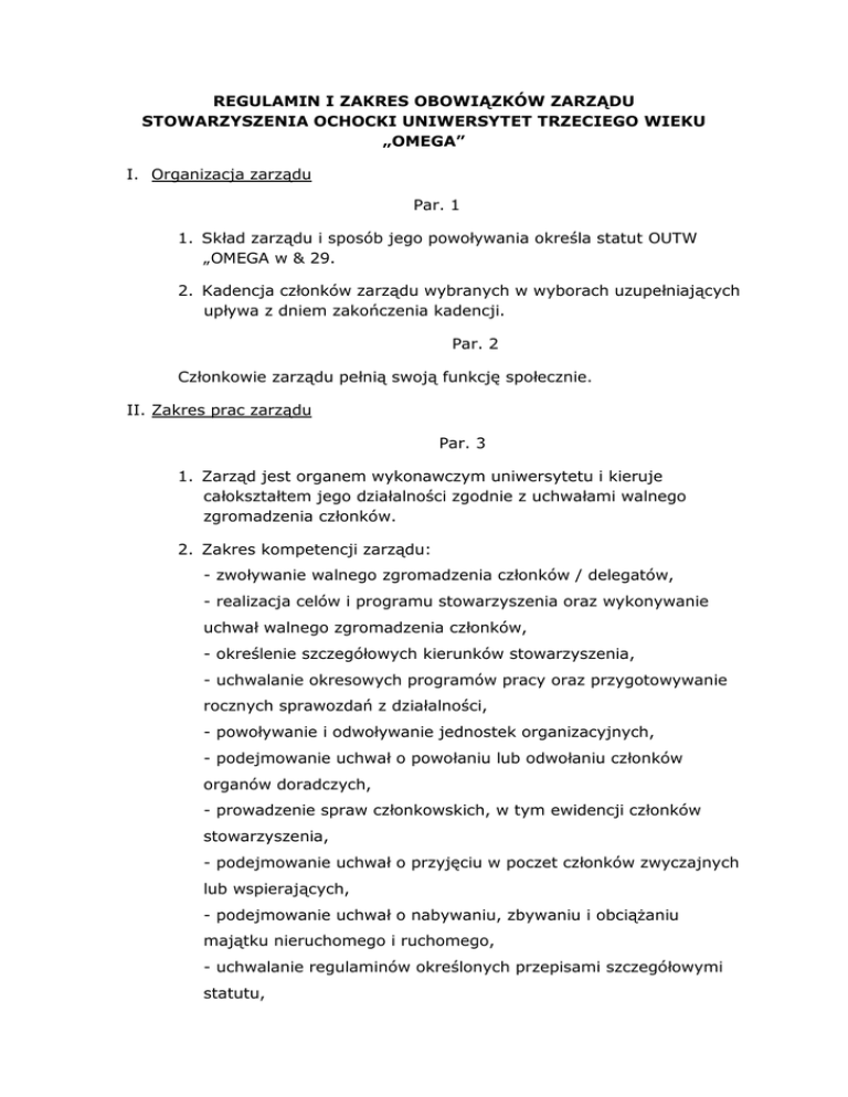 REGULAMIN I ZAKRES OBOWIĄZKÓW ZARZĄDU STOWARZYSZENIA OCHOCKI UNIWERSYTET TRZECIEGO WIEKU „OMEGA” I. Organizacja zarządu Par. 1 1. Skład zarządu i sposób jego powoływania określa statut OUTW „OMEGA w & 29. 2. Kadencja członków zarządu wybranych w wyborach uzupełniających upływa z dniem zakończenia kadencji. Par. 2 Członkowie zarządu pełnią swoją funkcję społecznie. II. Zakres prac zarządu Par. 3 1. Zarząd jest organem wykonawczym uniwersytetu i kieruje całokształtem jego działalności zgodnie z uchwałami walnego zgromadzenia członków. 2. Zakres kompetencji zarządu: - zwoływanie walnego zgromadzenia członków / delegatów, - realizacja celów i programu stowarzyszenia oraz wykonywanie uchwał walnego zgromadzenia członków, - określenie szczegółowych kierunków stowarzyszenia, - uchwalanie okresowych programów pracy oraz przygotowywanie rocznych sprawozdań z działalności, - powoływanie i odwoływanie jednostek organizacyjnych, - podejmowanie uchwał o powołaniu lub odwołaniu członków organów doradczych, - prowadzenie spraw członkowskich, w tym ewidencji członków stowarzyszenia, - podejmowanie uchwał o przyjęciu w poczet członków zwyczajnych lub wspierających, - podejmowanie uchwał o nabywaniu, zbywaniu i obciążaniu majątku nieruchomego i ruchomego, - uchwalanie regulaminów określonych przepisami szczegółowymi statutu, -2- podejmowanie uchwał o przynależności stowarzyszenia do krajowych i międzynarodowych organizacji oraz delegowania przedstawicieli stowarzyszenia do tych organizacji i na spotkania zagraniczne, - określanie wysokości składki członkowskiej, - składanie walnemu zgromadzeniu członków rocznego sprawozdania ze swej działalności. III. Regulamin pracy zarządu Każdy członek zarządu ponosi odpowiedzialność za swoje czynności wynikające z podziału zadań oraz za czynności zarządu jako władzy wykonawczej walnego zgromadzenia członków. Par. 4 1. Do zadań prezesa zarządu należy: - reprezentowanie stowarzyszenia na zewnątrz, - kierowanie pracami zarządu, - przedkładanie walnemu zgromadzeniu członków do akceptacji rocznego sprawozdania z działalności, - koordynowanie pracy stowarzyszenia, - zawieranie porozumień o współpracy z organami administracji i władzami innych organizacji. 2. Wiceprezes zastępuje prezesa w przypadku jego nieobecności (urlop, choroba lub inne uzasadnione wydarzenie) oraz wykonuje czynności wynikające z podziału zadań. 3. Sekretarz zarządu ma obowiązek: - prawidłowego prowadzenia dokumentacji pracy zarządu, - przygotowywania materiałów na najbliższe zebranie zarządu, - prowadzenia dokumentacji statutowej. 4. Skarbnik zarządu jest odpowiedzialny za: - prawidłowe prowadzenie spraw finansowych stowarzyszenia, - przygotowywanie każdego roku zawiadomienia o składce członkowskiej, - pobieranie składki członkowskiej, - analizowanie prawidłowości zapisów w ewidencji członków, - przygotowywanie sprawozdań rocznych z finansów stowarzyszenia -3i prezentowanie go komisji rewizyjnej i walnemu zgromadzeniu członków, - sporządzaniu umów z osobami prowadzącymi zajęcia oraz wypłacania im wynagrodzenia. 5. Członkowie zarządu wykonują czynności wynikające z podziału zadań. Par. 5 1. Posiedzenia zarządu zwołuje prezes, w miare potrzeb, co najmniej raz w miesiącu. 2. Posiedzenia zarządu mogą być zwoływane w trybie pilnym. 3. O terminie i tematyce posiedzenia zarządu członkowie powinni być powiadomieni conajmniej z jednodniowym wyprzedzeniem. Par. 6 1. Dla ważności decyzji podejmowanych na posiedzeniu zarządu wymagana jest obecność co najmniej 50% członków zarządu. 2. Uchwały i postanowienia zarządu zapadają zwykłą większością głosów. 3. Każdemu członkowi zarządu przysługuje jeden głos. Par. 7 Każdy członek zarządu zobowiązany jest do informowania zarządu o stanie realizacji nałożonych zadań. Par. 8 Zebraniu zarządu przewodniczy prezes lub osoba przez niego upoważniona. Par. 9 W posiedzeniu zarządu mogą uczestniczyć: - przewodniczący komisji rewizyjnej, - zaproszeni goście. Par. 10 Z posiedzenia zarządu sporządzany jest protokół. Par. 11 Regulamin wchodzi w życie z dniem uchwalenia przez zarząd.