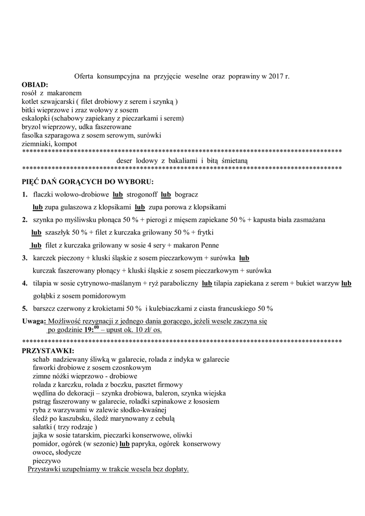 Oferta konsumpcyjna na przyjęcie weselne oraz poprawiny w 2017 r. OBIAD: rosół z makaronem kotlet szwajcarski ( filet drobiowy z serem i szynką ) bitki wieprzowe i zraz wołowy z sosem eskalopki (schabowy zapiekany z pieczarkami i serem) bryzol wieprzowy, udka faszerowane fasolka szparagowa z sosem serowym, surówki ziemniaki, kompot *************************************************************************************** deser lodowy z bakaliami i bitą śmietaną *************************************************************************************** PIĘĆ DAŃ GORĄCYCH DO WYBORU: 1. flaczki wołowo-drobiowe lub strogonoff lub bogracz lub zupa gulaszowa z klopsikami lub zupa porowa z klopsikami 2. szynka po myśliwsku płonąca 50 % + pierogi z mięsem zapiekane 50 % + kapusta biała zasmażana lub szaszłyk 50 % + filet z kurczaka grilowany 50 % + frytki lub filet z kurczaka grilowany w sosie 4 sery + makaron Penne 3. karczek pieczony + kluski śląskie z sosem pieczarkowym + surówka lub kurczak faszerowany płonący + kluski śląskie z sosem pieczarkowym + surówka 4. tilapia w sosie cytrynowo-maślanym + ryż paraboliczny lub tilapia zapiekana z serem + bukiet warzyw lub gołąbki z sosem pomidorowym 5. barszcz czerwony z krokietami 50 % i kulebiaczkami z ciasta francuskiego 50 % Uwaga: Możliwość rezygnacji z jednego dania gorącego, jeżeli wesele zaczyna się po godzinie 19:00 – upust ok. 10 zł/ os. *************************************************************************************** PRZYSTAWKI: schab nadziewany śliwką w galarecie, rolada z indyka w galarecie faworki drobiowe z sosem czosnkowym zimne nóżki wieprzowo - drobiowe rolada z karczku, rolada z boczku, pasztet firmowy wędlina do dekoracji – szynka drobiowa, baleron, szynka wiejska pstrąg faszerowany w galarecie, roladki szpinakowe z łososiem ryba z warzywami w zalewie słodko-kwaśnej śledź po kaszubsku, śledź marynowany z cebulą sałatki ( trzy rodzaje ) jajka w sosie tatarskim, pieczarki konserwowe, oliwki pomidor, ogórek (w sezonie) lub papryka, ogórek konserwowy owoce, słodycze pieczywo Przystawki uzupełniamy w trakcie wesela bez dopłaty. NAPOJE ( bez ograniczeń ) kawa rozpuszczalna, kawa po turecku, herbaty soki Cappy: pomarańczowy, jabłkowy, czarna porzeczka, grejpfrutowy napoje gazowane: Coca-Cola, Fanta, Sprite wody mineralne: Kropla Beskidu gaz. i n/g Uwaga: Napoje i soki z innej firmy – upust 4 zł/os. lub 2,50 zł wesele jednodniowe *************************************************************************************** CIASTA: sernik z brzoskwinią, ciasto makowe, tulipan, jabłecznik ciasto czekoladowe z kremem alkoholowym, piernik, inne. Ciasta uzupełniamy w trakcie wesela bez dopłaty. Produkowane z naturalnych surowców bez polepszaczy i konserwantów. ************************************************************************************** PREZENTY OD FIRMY Szampan na powitanie gości Tort weselny Apartament dla nowożeńców. ( dwie doby ) Księga gości Chleb weselny na powitanie młodej pary ************************************************************************************** POPRAWINY: CZTERY DANIA GORĄCE DO WYBORU: 1. żurek z jajkiem i kiełbasą 2. żeberka w miodzie 100 % + udka 20 % + kopytka z sosem + kapusta kiszona zasmażana 3. pulpety mięsne z ryżem w sosie chińskim lub risotto z ryżem lub gołąbki z sosem pomidorowym lub wieprzowina po dworsku z kaszą gryczaną paloną + surówka 4. bogracz lub strogonoff lub flaki lub zupa gulaszowa z klopsikami lub zupa porowa z klopsikami Świeże przystawki, ciasta, słodycze, owoce, napoje. Możliwość rezygnacji z trzeciego dania ciepłego na poprawinach – upust 5 zł/os. W to miejsce podajemy dania ciepłe z wesela. Uwaga: dzieci do lat 3 - GRATIS, do lat 9 - upust 50 % , zespół, kamerzysta, fotograf – upust 25 % Uwaga : Omawianie imprez od poniedziałku do piątku ( co najmniej z dziesięciodniowym wyprzedzeniem ) w godz. od 900 do 1800 lub telefonicznie. DODATKOWO PŁATNE 1. KREDENS WIEJSKI: szynka wędzona z kością – ok. 5 kg schab staropolski kiełbasa wiejska, kiełbasa pieczona sękacz boczkowy czarne, kaszanka kabanosy tradycyjne, paprykowe smalec firmowy, ogórki kiszone chleb wiejski sok pomidorowy dodatkowo płatne: szynka wędzona z nogą - ok. 8 kg kaczka faszerowana – ok. 2 kg boczek wiejski deska serów 2. GRILL 3. PROSIAK PIECZONY Z NADZIENIEM MIĘSNYM 4. CIASTA NA WYNOS (w pudełkach firmowych) 5. FONTANNA CZEKOLADOWA + owoce i słodycze Można wnosić własne trunki o zawartości alkoholu powyżej 25 % 6. Kawa ekspresowa 7. STÓŁ Z WINAMI ( 7 gatunków ) 8. PIWO ( Tyskie lub Żywiec 0,5 L ) 9. DRINK BAR – Whisky 0,7 L+ Cola-Cola, Gin 0,5 L + Tonic, Żubrówka 0,5 L + Sok Jabłkowy, Martini Bianco 0,5 L, Nalewka Dworska 0,5 L, wina ( 5 gatunków ), cytryna, lód, oliwki 10.DEKORACJA SALI: (upięcie ślubne za młodymi, kwiaty w wazonach, wiązanka kwiatów przed młodymi, upięcie stołów: przed młodymi, do szampana, na oczepiny, czerwony dywan ) 11. KONFETTI 12. SALWY ARMATNIE NA POWITANIE MŁODEJ PARY – trzy wystrzały 13. POKOJE GOŚCINNE PROMOCJE WESELNE 2017r SALA MAGNACKA: Powyżej 110 os pełno płatnych stół wiejski dwu dniowy gratis Powyżej 125 os pełno płatnych dekoracja i stół wiejski dwu dniowy gratis SALA SZLACHECKA: Powyżej 100 os pełno płatnych stół wiejski dwu dniowy gratis Powyżej 115 os pełno płatnych dekoracja i stół wiejski dwu dniowy gratis UWAGA : ORGANIZATOR ZASTRZEGA SOBIE PRAWO DO ZMIANY CEN USŁUG „PŁATNYCH DODATKOWO”, BĘDĄ ONE AKTUALIZOWANE Z POCZĄTKIEM KAŻDEGO ROKU KALENDARZOWEGO