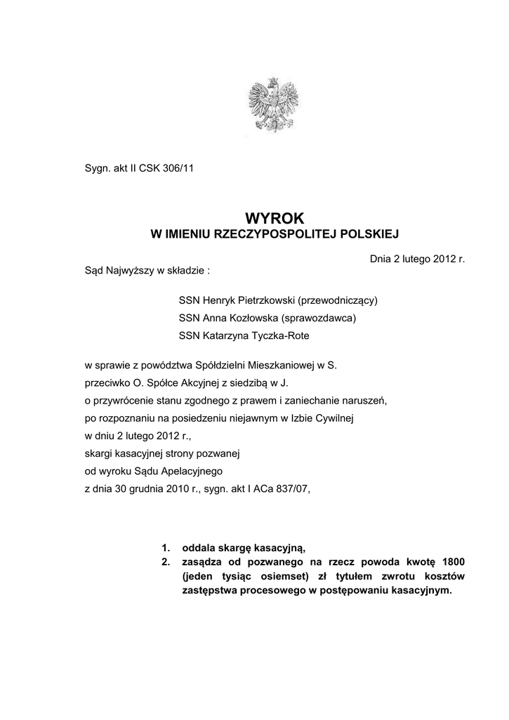Sygn. akt II CSK 306/11 WYROK W IMIENIU RZECZYPOSPOLITEJ POLSKIEJ Dnia 2 lutego 2012 r. Sąd Najwyższy w składzie : SSN Henryk Pietrzkowski (przewodniczący) SSN Anna Kozłowska (sprawozdawca) SSN Katarzyna Tyczka-Rote w sprawie z powództwa Spółdzielni Mieszkaniowej w S. przeciwko O. Spółce Akcyjnej z siedzibą w J. o przywrócenie stanu zgodnego z prawem i zaniechanie naruszeń, po rozpoznaniu na posiedzeniu niejawnym w Izbie Cywilnej w dniu 2 lutego 2012 r., skargi kasacyjnej strony pozwanej od wyroku Sądu Apelacyjnego z dnia 30 grudnia 2010 r., sygn. akt I ACa 837/07, 1. 2. oddala skargę kasacyjną, zasądza od pozwanego na rzecz powoda kwotę 1800 (jeden tysiąc osiemset) zł tytułem zwrotu kosztów zastępstwa procesowego w postępowaniu kasacyjnym. 2 Uzasadnienie Wyrokiem z dnia 11 lipca 2007 r. Sąd Okręgowy w P. nakazał pozwanemu O. S.A. w J. usunięcie elektrycznej linii napowietrznej SN 15 kV znajdującej się na nieruchomości położonej w S. przy ul. A., odraczając termin wykonania tego obowiązku na okres sześciu miesięcy licząc od dnia uprawomocnienia się wyroku. Sąd Okręgowy ustalił, że pozwany jest właścicielem spornej linii, a właścicielem nieruchomości, nad którą jest ona usytuowana jest, na skutek komunalizacji, Gmina S., natomiast powodowej Spółdzielni, w dacie doręczenia pozwanemu odpisu pozwu, do nieruchomości tej przysługiwało prawo wieczystego użytkowania. W toku sprawy powódka zbyła to prawo na rzecz osób fizycznych, jednakże wobec braku zgody pozwanego, osoby te nie wstąpiły do procesu w charakterze powodów. Sporna linia zasila zakład produkcyjny pozwanego, jest jednym z dwóch równorzędnych źródeł tego zasilania; pozwany produkuje opakowania szklane. Nieruchomość powodowej Spółdzielni przeznaczona jest na cele mieszkaniowe, a usytuowanie linii co najmniej utrudnia realizację tego celu. Linia została wzniesiona w latach siedemdziesiątych ubiegłego wieku dla potrzeb Huty Szkła „A.” w P., po uzyskaniu decyzji administracyjnych o lokalizacji szczegółowej i o sposobie wykorzystania terenu dla przebiegu tej linii. W chwili budowy linii nieruchomość stanowiła własność państwową, a Huta Szkła „A.” była przedsiębiorstwem państwowym. Przedsiębiorstwo państwowe zostało zlikwidowane, jego majątek wniesiony do Huty Szkła A. spółki z o.o., a następnie spółka ta została przejęta przez pozwanego. Spółdzielnia pismem z dnia 10 grudnia 2004 r. zwróciła się do pozwanego z prośbą o likwidację linii, pozwany odmówił stwierdzając, że likwidacja nie jest możliwa z uwagi na specyfikę prowadzonej przez niego produkcji, przy czym nie wykluczył możliwości skablowania spornego odcinka, na koszt powódki. W tej sytuacji powódka w dniu 24 czerwca 2005 r. wezwała pozwanego do natychmiastowego usunięcia linii, co nie nastąpiło. W świetle tak ustalonych faktów, Sąd I instancji ocenił powództwo jako uzasadnione. Odnosząc się do zarzutu utraty przez powódkę legitymacji czynnej, a to wobec zbycia prawa użytkowania wieczystego wskazał, że zbycie nastąpiło po doręczeniu pozwanemu odpisu 3 pozwu, co w myśl art. 192 pkt 3 k.p.c. nie ma wpływu na bieg sprawy. Oceniając zaś łączący strony stosunek prawny wywołany posadowieniem na nieruchomości linii, Sąd wskazał, że był to stosunek zbliżony do użyczenia, został jednak skutecznie wypowiedziany pismem z dnia 10 grudnia 2004 r. Powodowi przysługiwało zatem roszczenie negatoryjne, usytuowanie linii elektroenergetycznej na nieruchomości ogranicza bowiem jego uprawnienia wieczystego użytkownika. Za pozbawiony podstaw uznał Sąd zarzut pozwanego nadużycia prawa w dochodzeniu roszczenia. Wskazał, że konstrukcja nadużycia prawa nie może być wykorzystywana dla obezwładnienia prawa przysługującego powodowi, ponadto pozwany nie jest przedsiębiorcą przesyłowym zaspokajającym zbiorowe potrzeby ludności. Jest podmiotem gospodarczym, którego działalność jest nastawiona na osiągnięcie jak największego zysku, ponadto przebudowa linii jest technicznie możliwa i może nastąpić w sposób nie powodujący szczególnych utrudnień w procesie produkcyjnym. Apelacja pozwanego od wyroku Sądu Okręgowego została oddalona przez Sąd Apelacyjny wyrokiem z dnia 30 grudnia 2010 r. Sąd Apelacyjny zaaprobował stanowisko Sądu pierwszej instancji, że zbycie przez powoda prawa wieczystego użytkowania po doręczaniu pozwanemu odpisu pozwu, nie pozbawia powoda legitymacji procesowej czynnej z uwagi na treść art.192 pkt 3 k.p.c. Dokonując częściowo modyfikacji ustaleń faktycznych, Sąd Apelacyjny wskazał, że w chwili wybudowania linii na gruncie, grunt ten stanowił własność osób fizycznych i został przez te osoby sprzedany Skarbowi Państwa w dniu 15 września 1988 r. Budowa linii, pozostająca w zgodzie z przepisami prawa budowlanego, a takimi zezwoleniami legitymował się poprzednik prawny pozwanego, nie mogła być utożsamiana z zezwoleniem właściciela gruntu. Tolerowanie istniejącego stanu rzeczy przez właściciela również nie oznaczało nawiązania stosunku cywilnoprawnego. Bezprawna ingerencja pozwanego w chronioną prawem sferę uprawnień powoda uzasadniała uwzględnienie powództwa. W skardze kasacyjnej od wyroku Sądu Apelacyjnego, opartej na obu podstawach z art. 3983 § 1 k.p.c., pozwany zarzucił naruszenie art. 192 pkt 3 w związku z art. 391 § 1 zd.1 k.p.c. oraz naruszenie art. 222 § 2 w związku z art. 4 140 zd. 1 k.c. i domagał się uchylenia zaskarżonego wyroku i przekazania sprawy Sądowi Apelacyjnemu do ponownego rozpoznania. Sąd Najwyższy zważył, co następuje: Po doręczeniu odpisu pozwu powód sprzedał przysługujące mu prawo wieczystego użytkowania. Stan taki, w ocenie Sądów obu instancji, wyczerpywał sytuację uregulowaną w art. 192 pkt 3 k.p.c., co oznacza, że powód zachował legitymację procesową czynną. Powołany przepis stanowi, że z chwilą 