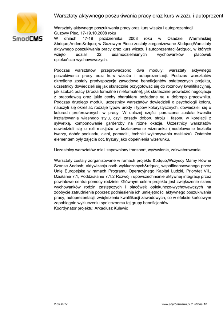 Warsztaty aktywnego poszukiwania pracy oraz kurs wizażu i autoprezent Warsztaty aktywnego poszukiwania pracy oraz kurs wizażu i autoprezentacji Guzowy Piec, 17-19.10.2008 roku W dniach 17-19 października 2008 roku w Osadzie Warmińskiej „Anders” w Guzowym Piecu zostały zorganizowane „Warsztaty aktywnego poszukiwania pracy oraz kurs wizażu i autoprezentacji”, w których wzięło udział 22 usamodzielnianych wychowanków placówek opiekuńczo-wychowawczych. Podczas warsztatów przeprowadzono dwa moduły: warsztaty aktywnego poszukiwania pracy oraz kurs wizażu i autoprezentacji. Podczas warsztatów określone zostały predyspozycje zawodowe beneficjentów ostatecznych projektu, uczestnicy dowiedzieli się jak skutecznie przygotować się do rozmowy kwalifikacyjnej, jak szukać pracy (źródła formalne i nieformalne), jak skutecznie prowadzić negocjacje z pracodawcą oraz jakie cechy charakteru pożądane są u dobrego pracownika. Podczas drugiego modułu uczestnicy warsztatów dowiedzieli o psychologii koloru, nauczyli się określać rodzaje typów urody i typów kolorystycznych, dowiedzieli się o kolorach preferowanych w pracy. W dalszej części poruszona została kwestia kształtowania własnego stylu, czyli zasady doboru stroju i fasonu w korelacji z sylwetką, komponowanie garderoby na różne okazje. Uczestnicy warsztatów dowiedzieli się o roli makijażu w kształtowanie wizerunku (modelowanie kształtu twarzy, dobór podkładu, cieni, pomadki, techniki wykonywania makijażu). Ostatnim elementem były zajęcia dot. fryzury jako dopełnienia wizerunku. Uczestnicy warsztatów mieli zapewniony transport, wyżywienie, zakwaterowanie. Warsztaty zostały zorganizowane w ramach projektu „Wszyscy Mamy Równe Szanse – aktywizacja osób wykluczonych”, współfinansowanego przez Unię Europejską w ramach Programu Operacyjnego Kapitał Ludzki, Priorytet VII., Działanie 7.1, Poddziałanie 7.1.2 Rozwój i upowszechnianie aktywnej integracji przez powiatowe centra pomocy rodzinie. Głównym celem projektu jest zwiększenie szans wychowanków rodzin zastępczych i placówek opiekuńczo-wychowawczych na zdobycie zatrudnienia poprzez podniesienie ich umiejętności aktywnego poszukiwania pracy, autoprezentacji, zwiększenia kwalifikacji zawodowych, co w efekcie końcowym zapobiegnie wykluczeniu społecznemu tej grupy beneficjentów. Koordynator projektu: Arkadiusz Kulewic 2.03.2017 www.pcprbraniewo.pl // strona 1/1