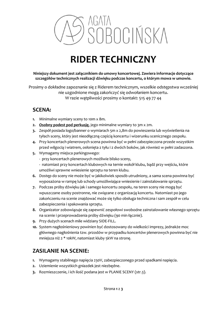 RIDER TECHNICZNY Niniejszy dokument jest załącznikiem do umowy koncertowej. Zawiera informacje dotyczące szczegółów technicznych realizacji dźwięku podczas koncertu, o którym mowa w umowie. Prosimy o dokładne zapoznanie się z Riderem technicznym, wszelkie odstępstwa wcześniej nie uzgodnione mogą zakończyć się odwołaniem koncertu. W razie wątpliwości prosimy o kontakt: 515 49 77 44 SCENA: 1. Minimalne wymiary sceny to 10m x 8m. 2. Osobny podest pod perkusję, jego minimalne wymiary to 3m x 2m. 3. Zespół posiada logo/banner o wymiarach 5m x 2,8m do powieszenia lub wyświetlenia na tyłach sceny, który jest nieodłączną częścią koncertu i wizerunku scenicznego zespołu. 4. Przy koncertach plenerowych scena powinna być w pełni zabezpieczona przede wszystkim przed wilgocią i wiatrem, osłonięta z tyłu i z dwóch boków, jak również w pełni zadaszona. 5. Wymagamy miejsca parkingowego: - przy koncertach plenerowych możliwie blisko sceny, - natomiast przy koncertach klubowych na ternie wokół klubu, bądź przy wejściu, które umożliwi sprawne wniesienie sprzętu na teren klubu. 6. Dostęp do sceny nie może być w jakikolwiek sposób utrudniony, a sama scena powinna być wyposażona w rampę lub schody umożliwiające wniesienie i zainstalowanie sprzętu. 7. Podczas próby dźwięku jak i samego koncertu zespołu, na teren sceny nie mogą być wpuszczane osoby postronne, nie związane z organizacją koncertu. Natomiast po jego zakończeniu na scenie znajdować może się tylko obsługa techniczna i sam zespół w celu zabezpieczenia i spakowania sprzętu. 8. Organizator zobowiązuje się zapewnić zespołowi swobodne zainstalowanie własnego sprzętu na scenie i przeprowadzenia próby dźwięku (90 min łącznie). 9. Przy dużych scenach mile widziany SIDE-FILL. 10. System nagłośnieniowy powinien być dostosowany do wielkości imprezy, jednakże moc głównego nagłośnienia tzw. przodów w przypadku koncertów plenerowych powinna być nie mniejsza niż 2 * 10kW, natomiast kluby 5kW na stronę. ZASILANIE NA SCENIE: 1. Wymagamy stabilnego napięcia 230V, zabezpieczonego przed spadkami napięcia. 2. Uziemienie wszystkich gniazdek jest niezbędne. 3. Rozmieszczenie, i ich ilość podana jest w PLANIE SCENY (str.3). Strona 1 z 3 INPUT LIST KANAŁY INSTRUMENTY 1 STOPA 2 WERBEL (GÓRA) 3 WERBEL (DÓŁ) 4 TOM 1 DYNAMICZNE: SENNHEISER e604, e904 5 TOM 2 DYNAMICZNE: SENNHEISER e604, e904 6 TOM 3 DYNAMICZNE: SENNHEISER e604, e904 7 HI HAT POJEMNOŚCIOWE: SHURE SM 81, AKG C 1000 8 OVER HEAD L POJEMNOŚCIOWE: SHURE SM 81, AKG C 1000 9 OVER HEAD R POJEMNOŚCIOWE: SHURE SM 81, AKG C 1000 10 11 GITARA ELEKTRYCZNA (FRACTAL AXE FX II) MIKROFONY DYNAMICZNE: SHURE BETA 52, SENNHEISER e602, AKG D 112 DYNAMICZNE: SHURE SM 57 DYNAMICZNE: SENNHEISER e904 LINIA/DI-BOX - LEWO: XLR LINIA/DI-BOX - PRAWO: XLR 12 GITARA ELEKTROAKUSTYCZNA LINIA/DI-BOX: JACK MONO 13 GITARA BASOWA LINIA/DI-BOX: XLR 14 WOKAL 15 WOKAL (ZAPASOWY) 16 17 SAMPLER: ROLAND SPD-SX DI-BOX/ WŁASNY BEZPRZEWODOWY SYSTEM: SENNHEISER SKM 5200-II BEZPRZEWODOWY: SHURE lub SENNHEISER LINIA/DI-BOX - LEWO: JACK MONO LINIA/DI-BOX - PRAWO: JACK MONO ----------------------------------------------------------------------------------------W razie niejasności prosimy każdorazowo o kontakt z zespołem. ----------------------------------------------------------------------------------------Tomasz Biniek - tel. 515 49 77 44 email: [email protected] www.agatasobocinska.pl Strona 2 z 3 PLAN SCENY Zespół używa dousznych systemów osobistych SHURE i SENNHEISER !! Potrzebne są 4 niezależne tory odsłuchowe, w tym: MONITORY/UCHO M1: Odsłuch douszny - Wokalistka M2: Odsłuch douszny – Gitarzysta (monitor podłogowy jako backup) M3: Odsłuch douszny – Basista (monitor podłogowy jako backup) M4 – Perkusista (monitor podłogowy) TOR TOR 1 TOR 2 TOR 3 TOR 4 CO W ODSŁUCHU IEM SENNHEISER EW 300 G3: XLR LEWO/XLR PRAWO WOKAL, GITARA ELEKTRYCZNA i ELEKTRO-AKUSTYCZNA, BAS, WERBEL, STOPA, SAMPLER IEM SHURE PSM 900: XLR LEWO/XLR PRAWO WOKAL, GITARA ELEKTRYCZNA i ELEKTRO-AKUSTYCZNA, BAS, STOPA, WERBEL, SAMPLER WOKAL, GITARA ELEKTRYCZNA i ELEKTRO-AKUSTYCZNA, BAS Tomasz Biniek - tel. 515 49 77 44 email: [email protected] www.agatasobocinska.pl Strona 3 z 3
