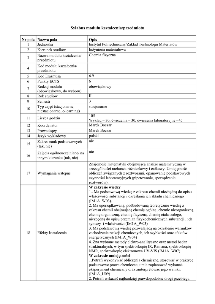 Sylabus modułu kształcenia/przedmiotu Nr pola Nazwa pola 1 Jednostka 2 Kierunek studiów Nazwa modułu kształcenia/ 3 przedmiotu Kod modułu kształcenia/ 4 przedmiotu 5 Kod Erasmusa 6 Punkty ECTS Rodzaj modułu 7 (obowiązkowy, do wyboru) 8 Rok studiów 9 Semestr Typ zajęć (stacjonarne, 10 niestacjonarne, e-learning) 11 Liczba godzin 12 13 14 Koordynator Prowadzący Język wykładowy Zakres nauk podstawowych (tak, nie) 15 16 Zajęcia ogólnouczelniane/ na innym kierunku (tak, nie) 17 Wymagania wstępne 18 Efekty kształcenia Opis Instytut Politechniczny/Zakład Technologii Materiałów Inżynieria materiałowa Chemia fizyczna 6.9 6 obowiązkowy II 3 stacjonarne 105 Wykład – 30, ćwiczenia – 30, ćwiczenia laboratoryjne - 45 Marek Boczar Marek Boczar polski nie nie Znajomość matematyki obejmująca analizę matematyczną w szczególności rachunek różniczkowy i całkowy. Umiejętność obliczeń związanych z roztworami, opanowanie podstawowych czynności laboratoryjnych (pipetowanie, sporządzanie roztworów). W zakresie wiedzy 1.. Ma podstawową wiedzę z zakresu chemii niezbędną do opisu właściwości substancji i określania ich składu chemicznego (IM1A_W03). 2. Ma uporządkowaną, podbudowaną teoretycznie wiedzę z zakresu chemii obejmującą chemię ogólną, chemię nieorganiczną, chemię organiczną, chemię fizyczną, chemię ciała stałego, niezbędną do opisu przemian fizykochemicznych substancji , ich syntezy i właściwości (IM1A_W03) 3. Ma podstawową wiedzę pozwalającą na określenie warunków zachodzenia reakcji chemicznych, ich szybkości oraz efektów energetycznych (IM1A_W04) 4. Zna wybrane metody elektro-analityczne oraz metod badan strukturalnych, w tym spektroskopię IR, Ramana, spektroskopię NMR, spektroskopię elektronową UV-VIS (IM1A_W07) W zakresie umiejętności 1.Potrafi wykonywać obliczenia chemiczne, stosować w praktyce podstawowe prawa chemiczne, umie zaplanować wykonać eksperyment chemiczny oraz zinterpretować jego wyniki. (IM1A_U09) 2. Potrafi wskazać najbardziej prawdopodobne drogi przebiegu 19 20 21 22 23 reakcji pomiędzy substancjami (IM1A_U11) 3.. Potrafi pozyskiwać informacje z literatury, baz danych i innych źródeł; potrafi integrować uzyskane informacje, dokonywać ich interpretacji, a także wyciągać wnioski oraz formułować i uzasadniać opinie (IM1A_U01) 4. . Potrafi wykorzystać metody matematyczne i statystyczne do rozwiązywania zagadnień technicznych i opracowania wyników badań (IM1A_U08) Wykład informacyjny. Ćwiczenia: dyskusja dydaktyczna związana z wykładem, Stosowane metody rozwiązywanie zadań rachunkowych ilustrujących tematykę dydaktyczne wykładu. Ćwiczenia laboratoryjne: praktyczne ćwiczenia laboratoryjne, programowanie z użyciem komputera. Odpowiedzi ustne i kolokwia pisemne (realizowane zgodnie z harmonogramem) dotyczące poszczególnych zagadnień Metody sprawdzania i kryteria poruszanych na wykładzie i ćwiczeniach. oceny efektów kształcenia Kolokwia ustne sprawdzające stopień przygotowania studenta do wykonywania bieżącego ćwiczenia laboratoryjnego, sprawozdania z wykonanych ćwiczeń laboratoryjnych. Forma zaliczenia: Wykład – egzamin pisemny z oceną. Ćwiczenia – zaliczenie z oceną. Ćwiczenia laboratoryjne – zaliczenie z oceną. Warunki zaliczenia: Warunkiem przystąpienia do egzaminu jest uzyskanie zaliczenia z ćwiczeń laboratoryjnych i ćwiczeń. Ocena z ćwiczeń jest średnią ważoną z ocen cząstkowych, przy czym: ocena ze sprawdzianu pisemnego (waga statystyczną 0.5), ocena za prezentowany referat (waga statystyczna 0.35), ocena za odpowiedź ustną (waga statystyczna 0.15). Warunkiem Forma i warunki zaliczenia otrzymania zaliczenia z ćwiczeń jest zaliczenie na ocenę co najmniej dostateczną wszystkich sprawdzianów pisemnych. Ocena z ćwiczenia laboratoryjnego jest sumą ocen cząstkowych z: kolokwium wstępnego (4 pkt.), wykonania ćwiczenia (2 pkt.) i opracowania wyników w formie sprawozdania (4 pkt.). Warunkiem zaliczenia ćwiczenia jest uzyskanie, sumarycznie, co najmniej 5.5 pkt. Uzyskanie 0 pkt. za którąkolwiek z ocen cząstkowych skutkuje niezaliczeniem ćwiczenia. Ćwiczenia, za które student uzyskał 0 pkt. nie można powtarzać. Warunkiem uzyskania zaliczenia z ćwiczeń laboratoryjnych, jest zaliczenie co najmniej jedenastu ćwiczeń. Termodynamika chemiczna. Równowagi w układach jednoskładnikowych wielofazowych i wieloskładnikowych wielofazowych. Ciecze i ich własności fizykochemiczne. Treści kształcenia (skrócony Zjawiska na granicy faz. Kinetyka reakcji chemicznych. Kataliza. opis) Układy zdyspergowane – własności, otrzymywanie i zastosowanie. Elektrochemia – jonika i elektrodyka. Metody badań elektrochemicznych. Elementy spektroskopii molekularnej. Program wykładów. Termodynamiczne funkcje stanu. Zasady termodynamiki. Prawa Hessa i Kirchhoffa. Podstawowe związki między funkcjami termodynamicznymi. Warunki równowagi i samorzutności procesów. Równowaga termodynamiczna w Treści kształcenia (pełny opis) reakcjach chemicznych. Prawo działania mas, zależność stałej równowagi od temperatury i ciśnienia. Równowagi fazowe w układach jednoskładnikowych wielofazowych – prawo ClausiusaClapeyrona. Równowagi fazowe w układach wieloskładnikowych wielofazowych: prawo Raoulta i Henry’ego, współczynnik podziału między dwie fazy ciekłe. Ekstrakcja. Destylacja. Azeotropia. Metody pomiaru masy molowej: z prawa Raoulta, metoda ebuliometryczna i kriometryczna, metoda wiskozymetryczna. Osmoza i ciśnienie osmotyczne. Fizyczny opis stanu ciekłego: gęstość, ściśliwość, pojemność cieplna, lepkość, napięcie powierzchniowe. Dyfuzja w roztworach. Zjawiska powierzchniowe na granicy faz: napięcie międzyfazowe, adhezja, kohezja, flotacja, adsorpcja. Detergenty jonowe i niejonowe. Chromatografia. Wymieniacze jonowe. Kinetyka reakcji chemicznych. Kataliza homo- i heterogeniczna. Koloidy: met