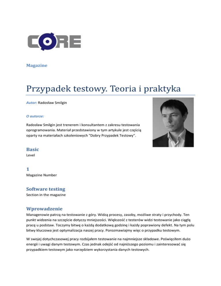 Magazine Przypadek testowy. Teoria i praktyka Autor: Radosław Smilgin O autorze: Radosław Smilgin jest trenerem i konsultantem z zakresu testowania oprogramowania. Materiał przedstawiony w tym artykule jest częścią oparty na materiałach szkoleniowych "Dobry Przypadek Testowy". Basic Level 1 Magazine Number Software testing Section in the magazine Wprowadzenie Managerowie patrzą na testowanie z góry. Widzą procesy, zasoby, możliwe straty i przychody. Ten punkt widzenia na szczęście dotyczy mniejszości. Większośd z testerów widzi testowanie jako ciągłą pracę u podstaw. Toczymy bitwę o każdą dodatkową godzinę i każdy poprawiony defekt. Na tym polu bitwy kluczowa jest optymalizacja naszej pracy. Porozmawiajmy więc o przypadku testowym. W swojej dotychczasowej pracy rozbijałem testowanie na najmniejsze składowe. Poświęciłem dużo energii i uwagi danym testowym. Czas jednak odejśd od najniższego poziomu i zainteresowad się przypadkiem testowym jako narzędziem wykorzystania danych testowych. Przypadek testowy niskiego poziomu Zacznijmy od analizy definicji przypadku testowego na najniższym jego poziomie. "Słownik wyrażeo związanych z testowaniem. Wersja 2.0" definiuje go jako: "Przypadek testowy z konkretnymi wartościami wejściowymi i wynikami oczekiwanymi. Logiczne operatory z przypadków testowych wysokiego poziomu są zamieniane na konkretne wartości, które odpowiadają celom logicznych operatorów.". Oznacza to, że przypadek testowy jest złożeniem danych wejściowych, pewnej operacji logicznej i danych wyjściowych będących oczekiwanym rezultatem. Rysunek 1. Przykładowa wizualizacja przypadku testowego niskiego poziomu Rysunek 1 prezentuje przykład przypadku testowego gdzie na test składają się dane wejściowe (1 i 2), operacja logiczna (suma) oraz dana wyjściowa (3). Komponent "Suma" może mied dowolną implementację: a) może byd usługą sieciową (ang. web service), która w oparciu o dwie dane zwraca ich sumę b) może byd desktopowym kalkulatorem dostępnym z poziomu akcesoriów systemu operacyjnego Windows c) może byd również systemem używanym w samolotach, który w oparciu o dwie zmienne pomiarowe przesyła do kolejnego komponentu ich sumę w celu wyliczenia np. średniej. Dla każdego z powyższych rozwiązao przypadek testowy będzie wyglądał dokładnie tak samo, chod jego wykonania będzie miało zupełnie inną postad. Dla a) będzie to przesłanie danych w specjalnie spreparowanym formacie XML i odebranie podobnego XML-a z wartością dodawania, dla b) przez interfejs klawiatury lub GUI przekażemy dwie zmienne i wymusimy wyświetlenie na ekranie ich sumy, a dla c) przygotujemy przypadek jednostkowy, gdzie specjalnie spreparowany sterownik przekaże nasze zmienne do testowego komponentu. Różne będą również zakresy wykonywanych testów. Systemom a) i b) prawdopodobnie wystarczą pojedyncze przypadki testowe dla danego komponentu. Więcej trzeba będzie przygotowad danych dla systemu c), od którego zależed może bezpieczeostwo lotu. Chod i tu jeden przypadek testowy będzie w zupełności wystarczający, to musi to byd inny przypadek od tego opisanego na początku. Przypadek testowy wysokiego poziomu Przypadek wysokopoziomowy nie zawiera danych testowych, a jedynie pewną informację o operatorach logicznych. Zgodnie z definicją jest to "przypadek testowy bez konkretnych wartości danych wejściowych i oczekiwanych rezultatów. " Rysunek 2. Przykładowa wizualizacja przypadku testowego wysokiego poziomu, gdzie A, B i C są parametrami pod które podstawia się konkretne dane testowe Wracając do naszego komponentu sumującego, który zamontowany jest w samolocie, bardziej właściwy będzie przypadek zobrazowany na rysunku 2. Zakładamy, że potrzebujemy większej ilości danych, aby mied pewnośd, że nie pojawi się awaria. Dla przypadku, który będzie brzmiał: do komponentu "Suma" podaj dwie wartości i sprawdź czy otrzymany rezultat jest zgodny wytycznymi dla implementacji. Wspomniane wytyczne mogą byd wynikiem analizy wymagao i przedstawiad sie w formie np. tabeli. Przykładowa tabela 1. Dana A 1 1,1 Dana B 2 0,2 Dana C 3 1 Komentarz Suma Wartości przecinkowe zaokrąglane są zawsze w dół do pełnej wartości całkowitej -1 -2 0 Wartości ujemne traktowane są jako błędne dane wejściowe, komponent zwraca 0 257 1 0 Wartości większe i równe 257 traktowane są jako błędne dane wejściowe, komponent zwraca 0 ... ... ... ... Tabela 1. Przykładowa dane dla przypadku testowego wysokiego poziomu Wracamy wiec znów do podstaw, czyli danych testowych, których odpowiedni dobór uzupełni przypadek wysokiego poziomu. Przypadek w przykładzie Przeanalizujmy prostą aplikacje z listami rozwijalnymi (rysunek 4) zwracającą ilośd dni przy zadanym miesiącu i roku. Oczywiście przypadek jest jeden zmieniają się jedynie dane. Wybieramy te miesiące, które mają 30 i 31 dni oraz luty dla roku przestępnego i nieprzestępnego. Łącznie 4 zestawy danych. Zgodnie z teorią klas równoważności daje nam to 100% pokrycia klas miesięcy i lat. Rysunek 4. Interfejs z listą wybieralną dla aplikacji zwracającej ilośd dni miesiąca Co jednak jeśli interfejs będzie miał pola tekstowe (rysunek 5). Rysunek 5. Interfejs z polami tekstowymi dla aplikacji zwracającej ilośd dni miesiąca Przypadek się komplikuje. Jeśli założymy, że nie ma walidacji musimy sobie zadad wiele pytao odnośnie danych akceptowalnych. Nie ma większych wątpliwości odnośnie roku, jeśli uwzględnimy realne granice jego podawania np. z przedziału <-9999; 9999>. Trudnośd pojawia się z miesiącem. Które dane są rozpoznawalne przez system: "STYCZEO", "styczeo", "1", "01", "sty", czy może "I"? A może wszystkie? Pole tekstowe wymagają więc dodatkowej obsługi komunikatami błędów. Oprócz czterech podstawowych danych wejściowych musimy również przygotowad dane dla każdego, możliwego komunikatu błędu. Składowe p