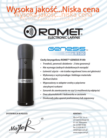 Wysoka jakość...Niska cena Wysoka jakość...niska cena Wysoka jakość...niska cena TM Seria R100 Cechy laryngofonu ROMET® GENESIS R100: • Trwałość, pewność działania - 2 lata gwarancji • Nie wymaga żadnych dodatkowych narzędzi • Łatwość użycia – nie trzeba regulować tonu ani głośności • Wykonany z wytrzymałego i lekkiego materiału DuPont Delrin • Wyposażony w adapter oralny z pięcioma sterylnymi rurkami • Sznurek do zawieszania na szyi (z możliwością odpięcia) • Dwa akumulatorki i ładowarka w zestawie • Doskonały jako aparat podstawowy lub zapasowy DYSTRYBUCJA W POLSCE: KONTAKT: Ma-Je-R Sp . z o. o. ul. Czarnieckiego 53 01-541 Warszawa tel. 22 869 93 60 fax 22 839 90 21 [email protected] www.majer.com.pl SERIA GENESIS R100 - INSTRUKCJA OBSŁUGI SERIA GENESIS R100 - instrukcja obsługi 1. Naciśnij przycisk On/OFF. Brzęczący dźwięk oznacza, że bateria jest naładowana w stopniu umożliwiającym rozmowę, a urządzenie gotowe do użycia 2. Przyciśnij krtań elektroniczną Romet do szyi i spróbuj odnaleźć miejsce, w którym głos jest najlepiej słyszalny. UWAGA: to miejsce może znajdować się na szyi; w okolicach ust (z adapterem oralnym). U każdego użytkownika właściwe miejsce może się znajdować gdzie indziej w zależności od grubości skóry i ilości otrzymanych naświetlań. Przyciśnij aby włączyć Puść przycisk aby wyłączyć 3. Ćwicz mowę przed lustrem powtarzając słowa i proste zdania aż do uzyskania zadowalającego efektu. Nagrywaj swój głos, odtwarzaj aby usłyszeć jak brzmi. Powtarzaj ćwiczenia wielokrotnie. Nie próbuj przekręcać głowicy membrany (górna część aparatu). Wymiana baterii w GENESIS R100 : Odkręć nakrętkę baterii I umieść baterię 9V we właściwym miejscu podajnika na baterie . Nie musisz uważać na znaki +,-. Pola elektryczne są odwracalne. Wystarczy włożyć baterię i zakręcić nakrętkę aby automatycznie uzyskać zasilanie aparatu. Zaczep do sznurka Model R100 zawiera: 2 akumulatorki 700mAh, ładowarka, adapter oralny i 5 rurek, pasek. DYSTRYBUCJA W POLSCE: KONTAKT: Ma-Je-R Sp . z o. o. ul. Czarnieckiego 53 01-541 Warszawa tel. 22 869 93 60 fax 22 839 90 21 [email protected] www.majer.com.pl