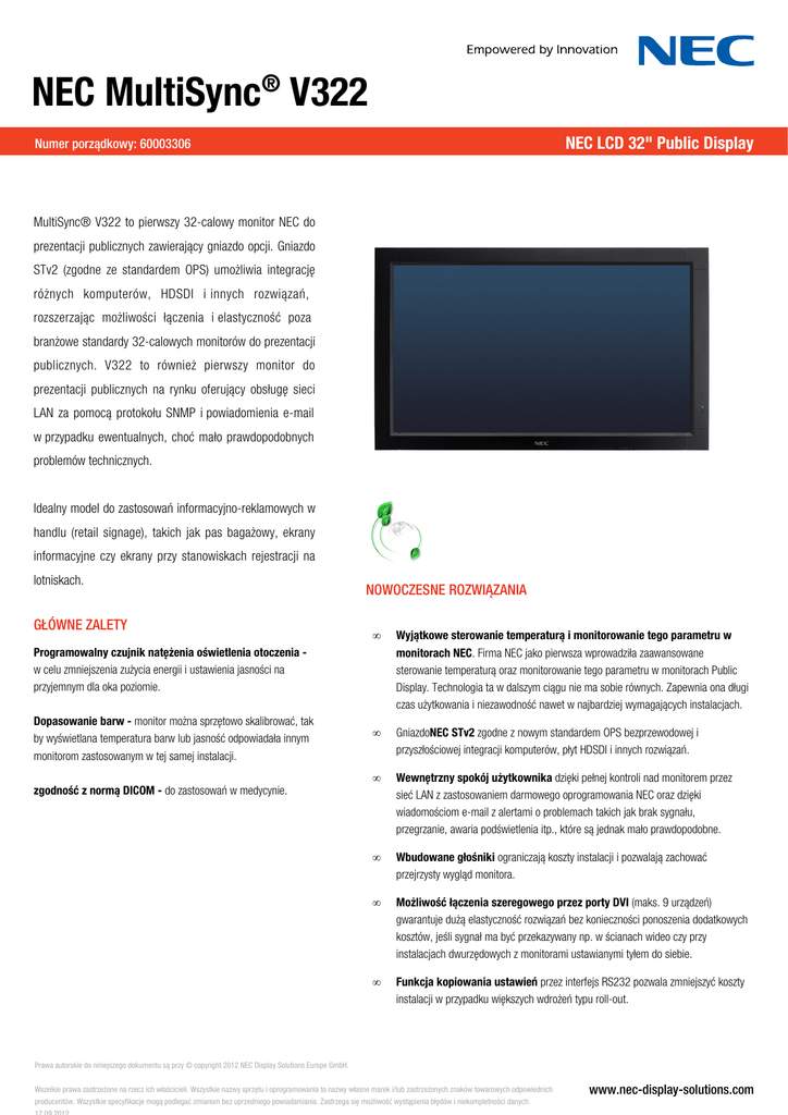 NEC MultiSync® V322 NEC LCD 32" Public Display Numer porządkowy: 60003306 MultiSync® V322 to pierwszy 32-calowy monitor NEC do prezentacji publicznych zawierający gniazdo opcji. Gniazdo STv2 (zgodne ze standardem OPS) umożliwia integrację różnych komputerów, HDSDI i innych rozwiązań, rozszerzając możliwości łączenia i elastyczność poza branżowe standardy 32-calowych monitorów do prezentacji publicznych. V322 to również pierwszy monitor do prezentacji publicznych na rynku oferujący obsługę sieci LAN za pomocą protokołu SNMP i powiadomienia e-mail w przypadku ewentualnych, choć mało prawdopodobnych problemów technicznych. Idealny model do zastosowań informacyjno-reklamowych w handlu (retail signage), takich jak pas bagażowy, ekrany informacyjne czy ekrany przy stanowiskach rejestracji na lotniskach. GŁÓWNE ZALETY NOWOCZESNE ROZWIĄZANIA • Wyjątkowe sterowanie temperaturą i monitorowanie tego parametru w monitorach NEC. Firma NEC jako pierwsza wprowadziła zaawansowane sterowanie temperaturą oraz monitorowanie tego parametru w monitorach Public Display. Technologia ta w dalszym ciągu nie ma sobie równych. Zapewnia ona długi czas użytkowania i niezawodność nawet w najbardziej wymagających instalacjach. • GniazdoNEC STv2 zgodne z nowym standardem OPS bezprzewodowej i przyszłościowej integracji komputerów, płyt HDSDI i innych rozwiązań. • Wewnętrzny spokój użytkownika dzięki pełnej kontroli nad monitorem przez sieć LAN z zastosowaniem darmowego oprogramowania NEC oraz dzięki wiadomościom e-mail z alertami o problemach takich jak brak sygnału, przegrzanie, awaria podświetlenia itp., które są jednak mało prawdopodobne. • Wbudowane głośniki ograniczają koszty instalacji i pozwalają zachować przejrzysty wygląd monitora. • Możliwość łączenia szeregowego przez porty DVI (maks. 9 urządzeń) gwarantuje dużą elastyczność rozwiązań bez konieczności ponoszenia dodatkowych kosztów, jeśli sygnał ma być przekazywany np. w ścianach wideo czy przy instalacjach dwurzędowych z monitorami ustawianymi tyłem do siebie. • Funkcja kopiowania ustawień przez interfejs RS232 pozwala zmniejszyć koszty instalacji w przypadku większych wdrożeń typu roll-out. Programowalny czujnik natężenia oświetlenia otoczenia w celu zmniejszenia zużycia energii i ustawienia jasności na przyjemnym dla oka poziomie. Dopasowanie barw - monitor można sprzętowo skalibrować, tak by wyświetlana temperatura barw lub jasność odpowiadała innym monitorom zastosowanym w tej samej instalacji. zgodność z normą DICOM - do zastosowań w medycynie. Prawa autorskie do niniejszego dokumentu są przy © copyright 2012 NEC Display Solutions Europe GmbH. Wszelkie prawa zastrzeżone na rzecz ich właścicieli. Wszystkie nazwy sprzętu i oprogramowania to nazwy własne marek i/lub zastrzeżonych znaków towarowych odpowiednich producentów. Wszystkie specyfikacje mogą podlegać zmianom bez uprzedniego powiadamiania. Zastrzega się możliwość wystąpienia błędów i niekompletności danych. www.nec-display-solutions.com NEC MultiSync® V322 Dane techniczne NEC MultiSync® V322 WYŚWIETLACZ Rodzaj panelu S-PVA z podświetleniem CCFL Użyteczna powierzchnia [cale/cm] 697.7 x 392.3 Wielkość ekranu [cale/cm] 31.5 / 80 Proporcje obrazu 16:9 Jasność (przy wysyłce) [cd/m2] 340, (450 max) Kontrast 3000:1 Kąty widzenia [°] 178 poziomo / 178 pionowo (CR 10:1) Czas reakcji [ms] 8 (grey-to-grey) Częstotliwość odświeżania obrazu [Hz] 60 CZĘSTOTLIWOŚĆ SYNCHRONIZACJI 1. Power (AC in) Częstotliwość pozioma [kHz] 31,5 - 91,1 (cyfrowa i analogowa) 2. Main switch (on/off) Częstotliwość pionowa [Hz] 50 - 85 ROZDZIELCZOŚĆ 3. LAN with SNMP 4. Remote Control in / out 5. External control RS-232 in / out 6. DisplayPort in Rozdzielczość natywna 1366 x 768 przy 60 Hz Obsługiwane przez wejścia cyfrowe i analogowe (PC) 1024 x 768; 1280 x 1024; 1280 x 720; 1280 x 768; 1280 x 800; 1280 x 960; 1360 x 768; 1366 x 786; 1400 x 1050; 1600 x 1200; 1680 x 1050; 1920 x 1080; 640 x 480; 720 x 400; 720 x 576; 800 x 600 Obsługiwane przez wejścia cyfrowe (wideo) 1280 x 720p (50)16:9; 1920 x 1080i (59.94/60)16:9; 1920 x 1080p (23.97/24) 16:9; 1920 x 1080p (25)16:9; 1920 x 1080p (29.97/30)16:9; 1920 x 1080p (50) 16:9; 1920 x 1080p (59.94/60)16:9; 720 x 480p (59.94/60)16:9; 720 x 576p (50) 16:9 7. DVI in / out 8. HDMI in MOŻLIWOŚCI PODŁĄCZANIA 9. RGB in Wejścia wideo analogowe D-Sub15 (PC RGB, sygnał komponentowy, S-Video, sygnał zespolony) sygnał zespolony (BNC) Wejścia wideo cyfrowe 1 x DVI-D (z HDCP); 1 x HDMI 1.3 (HDCP); 1 x DisplayPort (HDCP) Wejścia audio analogowe 1 x 3,5 mm jack Wejścia audio cyfrowe Interfejs DisplayPort; 1x HDMI Kontrola wejścia przewód zdalnego sterowania (jack 3,5 mm); RS232; Sieć LAN 100 Mbit Wyjścia wideo cyfrowe 1 x DVI-D (HDCP) Wyjścia audio analogowe 3,5mm jack Kontrola wyjścia przewód zdalnego sterowania (jack 3,5 mm); RS232 Funkcje pilota LAN z SNMP; RS-232C (9-pin D-sub) Input and Output; Zdalne sterowanie przez podczerwień (czujnik wewn./zewn. (opcjonalnie)) 10. Composite in 11. Audio out 12. Audio in CECHY SPECJALNE Bardzo szybka zmiana wejść sygnałowych, Funkcje wygaszacza ekranu, Kopiowanie ustawień monitora przez złącze RS232, Menu SLOT OPCJI Rodzaj slot STv2 (kompatybilność z normą OPS firm Intel i NEC) Prąd rozruchowy [A] max. 10 Pobór mocy [W] max. 61 kalibracja barw, Możliwość zmiany priorytetu złączy wideo, Obsługa Napięcie/Prąd [V/A] 16/4 DICOM, Opcjonalny zewnętrzny programowany czujnik natężenia PARAMETRY ELEKTRYCZNE OSD z możliwością obrotu do trybu portretowego, możliwa sprzętowa oświetlenia otoczenia, Pamięć ustawień matrycy, PIN jako zabezpieczenie przed kradzieżą, różne opcje wyświetlania obrazu w obrazie, Scheduler (funkcja planowania włączania/wyłączania), TitleMatrix (10 x 10), Ustawianie nazwy wejścia, zaawansowane sterowanie wentylatorem