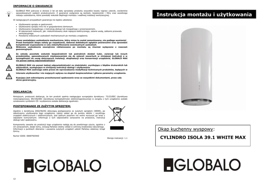 INFORMACJE O GWARANCJI GLOBALO MAX pokrywa w okresie 2 lat od daty sprzedaży produktu wszystkie koszty napraw usterek, ewidentnie spowodowanych wadami produkcyjnymi. Z gwarancji wyłączone są żarówki, bezpieczniki i filtry oraz wszelkiego rodzaju uszkodzenia, które powstały wskutek błędnego montażu i wadliwej instalacji wentylacyjnej. Instrukcja montażu i użytkowania W następujących przypadkach gwarancja nie będzie udzielana: Użytkowanie sprzętu w gastronomii. Użytkowanie sprzętu inne niż w gospodarstwie domowym. Użytkowania niezgodnego z instrukcją obsługi lub niezgodnego z przeznaczeniem. W zdarzeniach losowych, jak: niekontrolowany skok napięcia elektrycznego, zalanie wodą, zatkanie przewodu wentylacyjnego. Powstania widocznych uszkodzeń mechanicznych po montażu urządzenia. Towar posiadający uszkodzenia mechaniczne, który mimo to został zamontowany, nie podlega wymianie! Przed montażem okapu należy go rozpakować, dokonać dokładnych oględzin powierzchni oraz sprawdzić kompletność wyposażenia w celu zidentyfikowania ewentualnych uszkodzeń. Widoczne uszkodzenia zewnętrzne reklamowane po montażu są również wyłączone z roszczeń gwarancyjnych. Za szkody powstałe wskutek bezpośrednich lub pośrednich działań ludzi, zwierząt lub innych przedmiotów, spowodowanych niestosowaniem się do zaleceń zawartych w niniejszej instrukcji a w szczególności do uwag dotyczących instalacji, eksploatacji oraz konserwacji urządzenia, GLOBALO MAX nie ponosi żadnej odpowiedzialności! GLOBALO MAX nie ponosi żadnej odpowiedzialności za nieścisłości, wynikające z błędów drukarskich lub edytorskich, występujące w niniejszej instrukcji obsługi i użytkowania. GLOBALO MAX zastrzega sobie prawo do wprowadzania modyfikacji technicznych produktów, będących w interesie użytkownika i nie mających wpływu na stopień bezpieczeństwa i główne parametry urządzenia. Kupujący jest zobowiązany przechowywać opakowanie wraz ze wszystkimi dokumentami, przez cały okres gwarancyjny. DEKLARACJA: Niniejszym, producent deklaruje, że ten produkt spełnia następujące europejskie dyrektywy: 73/23/EEC (dyrektywa niskonapięciowa); 89/336/EEC (dyrektywa kompatybilności elektromagnetycznej) w związku z tym urządzenie zostało oznakowane symbolem CE i wystawiona została deklaracja zgodności. POSTĘPOWANIE ZE ZUŻYTYM SPRZĘTEM: Zgodnie z dyrektywą 2002/96/EG dotyczącą postępowania ze zużytym sprzętem (WEEE), po zakończeniu użytkowania tego urządzenia, należy oddać go do punktu zbiórki i recyklingu urządzeń elektrycznych i elektronicznych, pod żadnym pozorem nie wolno wyrzucać go wraz z odpadami komunalnymi. Informuje o tym odpowiednie oznaczenie na produkcie, instrukcji obsługi lub/i opakowaniu. Komponenty zawarte do produkcji tego urządzenia nadają się do powtórnego użycia, zgodnie z ich oznaczeniem, dzięki temu, wnoszą Państwo istotny wkład w ochronę środowiska naturalnego. Informacji o punktach zbierania i usuwania zużytych urządzeń udzieli Państwu właściwy Urząd Gminy. Okap kuchenny wyspowy: Numer GIOS: E0007925WZ Wersja instrukcji: 1.1 12 CYLINDRO ISOLA 39.1 WHITE MAX Spis treści Serwis Uruchomienie Tryb pracy z wyciągiem lub z wewnętrznym obiegiem powietrza Wyjęcie metalowego filtra Czyszczenie metalowego filtra Montaż przewodu odprowadzającego Wskazówki do poprawnej instalacji okap Ważne informacje Przyłącze elektryczne Wskazania bezpieczeństwa przy użytkowaniu Wskazania bezpieczeństwa przy konserwacji i czyszczeniu okapu Konserwacja i czyszczenie Okresy międzykonserwacyjne Dane techniczne CYLINDRO ISOLA 39.1 WHITE MAX: 4 5 5 5 5 5 6 6 6 7 7 7 7 Obsługa okapu Panel obsługi Jaki stopień wydajności należy wybrać? Sterowanie elektroniczne Włączanie i wyłączanie silnika okapu Włączanie i wyłączanie oświetlenia Regulacja prędkości Timer 8 8 8 8 8 8 8 8 Wymiana filtra z węglem aktywnym Jak radzić sobie z problemami w eksploatacji Okap w ogóle nie funkcjonuje Wydajność jest niewystarczająca / podwyższony szum eksploatacyjny 9 9 9 9 Montaż okapu 10 Dane techniczne 11 Informacje o gwarancji Deklaracja Postępowanie ze zużytym sprzętem 12 12 12 szerokość: 39 cm głębokość: 39 cm wysokość: 86,5 – 116,5 cm sterowanie: elektroniczne Soft Touch z wyświetlaczem dodatki: timer - wyłącznik czasowy 10-90 min. zakres prędkości: 4 – stopniowy wydajność: I-270, II-350, III-460, IV-820 m3/h głośność: I-38, II-45, III-52, IV-59 dB tryb pracy: wyciąg lub pochłaniacz pobór mocy: max 212 W oświetlenie: halogenowe 4x3W filtr przeciwtłuszczowy: aluminiowy, wzmacniany wykonanie: stal lakierowana na kolor biały średnica wylotu: Ø 15 cm + redukcja Ø 12 cm turbina zewnętrzna: okap może pracować z turbiną zewnętrzną gwarancja: 2 lata *Błędne podłączenie przewodu wentylacyjnego powoduje spadek wydajności urządzenia, każde załamanie rury o 90 stopni powoduje spadek wydajności o około 10%. Każdy dodatkowy metr rury lub płaskiego kanału powoduje spadek wydajności o kolejne 5%. Zredukowanie średnicy przewodu poprzez redukcję pola przekroju poprzecznego - powoduje spadek wydajności urządzenia. Aby zachować fabryczne parametry urządzenia, należy tak planować montaż aby nie zmniejszać pola powierzchni wylotu turbiny okapu. Zamontowanie filtra węglowego w okapie obniża jego wydajność o około 25-30%. Każde stłumienie pracy silnika, spowoduje jego przyśpieszenie oraz zwiększenie głośności pracy! W ekstremalnych przypadkach, przy długotrwałej pracy na najwyższym stopniu prędkości i przy znacznie stłumionym ciągu, może doprowadzić nawet do spalenia silnika elektrycznego okapu. UWAGA: - MINIMALNA ŚREDNICA PRZEWODU WENTYLACYJNEGO TO Ø 120 mm LUB ODPOWIADAJĄCY TEMU PRZEKRÓJ KWADRATOWY LUB PROSTOKĄTNY - W PRZYPADKU ZMNIEJSZENIA PRZEKROJU PRZEWODU, OKAP BĘDZIE PRACOWAŁ GŁOŚNO! - ZANIM ZAMONTUJESZ OKAP SPRAWDŹ JEGO POPRAWNE DZIA