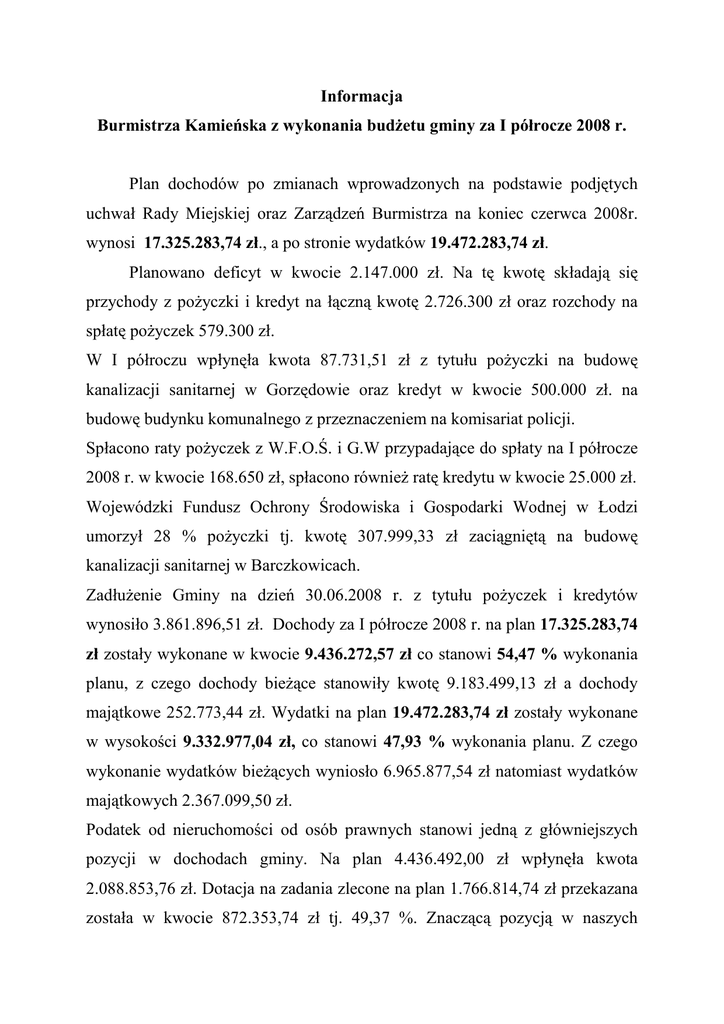 Informacja Burmistrza Kamieńska z wykonania budŜetu gminy za I półrocze 2008 r. Plan dochodów po zmianach wprowadzonych na podstawie podjętych uchwał Rady Miejskiej oraz Zarządzeń Burmistrza na koniec czerwca 2008r. wynosi 17.325.283,74 zł., a po stronie wydatków 19.472.283,74 zł. Planowano deficyt w kwocie 2.147.000 zł. Na tę kwotę składają się przychody z poŜyczki i kredyt na łączną kwotę 2.726.300 zł oraz rozchody na spłatę poŜyczek 579.300 zł. W I półroczu wpłynęła kwota 87.731,51 zł z tytułu poŜyczki na budowę kanalizacji sanitarnej w Gorzędowie oraz kredyt w kwocie 500.000 zł. na budowę budynku komunalnego z przeznaczeniem na komisariat policji. Spłacono raty poŜyczek z W.F.O.Ś. i G.W przypadające do spłaty na I półrocze 2008 r. w kwocie 168.650 zł, spłacono równieŜ ratę kredytu w kwocie 25.000 zł. Wojewódzki Fundusz Ochrony Środowiska i Gospodarki Wodnej w Łodzi umorzył 28 % poŜyczki tj. kwotę 307.999,33 zł zaciągniętą na budowę kanalizacji sanitarnej w Barczkowicach. ZadłuŜenie Gminy na dzień 30.06.2008 r. z tytułu poŜyczek i kredytów wynosiło 3.861.896,51 zł. Dochody za I półrocze 2008 r. na plan 17.325.283,74 zł zostały wykonane w kwocie 9.436.272,57 zł co stanowi 54,47 % wykonania planu, z czego dochody bieŜące stanowiły kwotę 9.183.499,13 zł a dochody majątkowe 252.773,44 zł. Wydatki na plan 19.472.283,74 zł zostały wykonane w wysokości 9.332.977,04 zł, co stanowi 47,93 % wykonania planu. Z czego wykonanie wydatków bieŜących wyniosło 6.965.877,54 zł natomiast wydatków majątkowych 2.367.099,50 zł. Podatek od nieruchomości od osób prawnych stanowi jedną z główniejszych pozycji w dochodach gminy. Na plan 4.436.492,00 zł wpłynęła kwota 2.088.853,76 zł. Dotacja na zadania zlecone na plan 1.766.814,74 zł przekazana została w kwocie 872.353,74 zł tj. 49,37 %. Znaczącą pozycją w naszych dochodach jest podatek dochodowy od osób fizycznych. W pozycji tej na plan 2.159.579 zł wpłynęła kwota 1.003.589 zł, co stanowi 46,47 %. Pozostałe podatki i opłaty lokalne: - pozostała działalność /rolnictwo/ - plan 18.430,74 zł wpłynęła kwota 37.820,74 zł. W kwocie tej znajdują się wpływy ze sprzedaŜy działek rolnych 26.390 zł, dotacja na zwrot rolnikom podatku akcyzowego zawartego w cenie oleju napędowego w kwocie 11.430,74 zł, - drogi gminne na plan 8.000 zł wpłynęło 0 zł, - drogi wewnętrzne na plan 7.000 zł wpłynęło 0 zł, - opłata za wieczyste uŜytkowanie na plan 700 zł wpłynęła kwota 183 zł, - dochody z najmu dzierŜawy składników majątkowych na plan 10.000 zł wpłynęła kwota 9.365,10 zł, - wpływy ze sprzedaŜy składników majątkowych na plan 728.000 zł wpłynęła kwota 226.383,44 zł, - odsetki od nieterminowych wpłat na plan 0 zł wpłynęło 14,35 zł były to wpływy za koszty upomnień, - dotacja celowa z Urzędu Wojewódzkiego/ zadania zlecone/ na plan 74.750 zł wpłynęła kwota 40.250 zł. Otrzymaliśmy równieŜ w związku z realizacją zadań z zakresu administracji rządowej (za dowody osobiste) na plan 758 zł kwotę 324,02 zł stanowiącą 5 % dochodów uzyskiwanych na rzecz budŜetu państwa, - wpływy z najmu dzierŜawy składników majątkowych /administracja samorządowa/ na plan 12.000 zł wpłynęła kwota 5.051,79 zł, - wpływy z usług na plan 300 zł wykonanie wynosiło 0 zł, - wpływy z róŜnych dochodów na plan 4.000 zł wpłynęła kwota 129,55 zł, - promocja gminy na plan 34.500 zł wpłynęła kwota 37.500 zł za: usługę rozpowszechniania informacji na temat BOT Kopalni Węgla Brunatnego Bełchatów S.A. podczas X Dni Kamieńska kwota wpływu 3.000 zł, 2 darowizna w kwocie 34.500 zł z Elektrowni Wiatrowej, KWB Bełchatów i firmy Amest na Dni Kamieńska oraz na wydanie ksiąŜki, - dotacje celowe z naczelnych organów władzy państwowej /uzupełnienie list wyborczych/ plan 885 zł wpłynęła kwota 454 zł, - dotacja na wybory do rad gmin na plan 3.687 zł wpłynęła kwota 3.687 zł, - wpływy z róŜnych dochodów w (OSP) wpłynęła kwota 312,02 zł wpływ dotyczy zwrotu za rozmowy telefoniczne z 2007 r. - dotacja celowa na obronę cywilną /zadania zlecone/ plan 600 zł wpłynęła kwota 600 zł, - podatek od działalności gospodarczej osób fizycznych plan 4.000zł wykonanie 890,44 zł, - wpływy z podatków od osób prawnych : od nieruchomości, rolnego, leśnego, od środków transportowych, od spadków i darowizn, opłaty eksploatacyjnej, podatku od czynności cywilnoprawnych, odsetek od nieterminowych wpłat z tytułu podatków i opłat na plan 4.488.792 zł wpłynęła kwota 2.120.764,57 zł, - wpływy z podatków od osób fizycznych: od nieruchomości, rolnego, leśnego, od środków transportowych, od spadków i darowizn, z opłaty targowej, opłaty eksploatacyjnej, podatku od czynności cywilnoprawnych, odsetek od nieterminowych wpłat z tytułu podatków i opłat na plan 786.500 zł wpłynęła kwota 390.307,90 zł, - wpływy z opłaty skarbowej na plan 25.000zł wpłynęła kwota 13.194 zł, - wpływy z opłaty za zajęcie pasa drogowego na plan 5.000 zł wpłynęła kwota 3.151,75 zł - udziały gmin w podatkach stanowiących dochód budŜetu państwa na plan 2.179.579 zł wpłynęła kwota 1.183.793,13 zł, - pobór podatków – na plan 14.000 zł wpłynęły odsetki od nieterminowych wpłat kwota 8.448,21 zł, oraz 178,10 zł z tytułu kosztów upomnień, 3 - część oświatowej subwencji ogólnej na plan 5.849.084 zł przekazana została kwota 3.599.440 zł, - część wyrównawcza subwencji ogólnej dla gmin na plan 476.695 zł wpłynęła kwota 238.350 zł, - róŜne rozliczenia finansowe /odsetki bankowe/ na plan 40.000zł wykonanie wyniosło 21.330,66 zł, - wpływ środków z tytułu najmu i dzierŜawy w szkołach podstawowych na plan 0 zł wykonanie wynosiło 130 zł, - dotacja na nauczanie języka angielskiego na plan 19.740 zł otrzymaliśmy kwotę 17.273 zł, - do