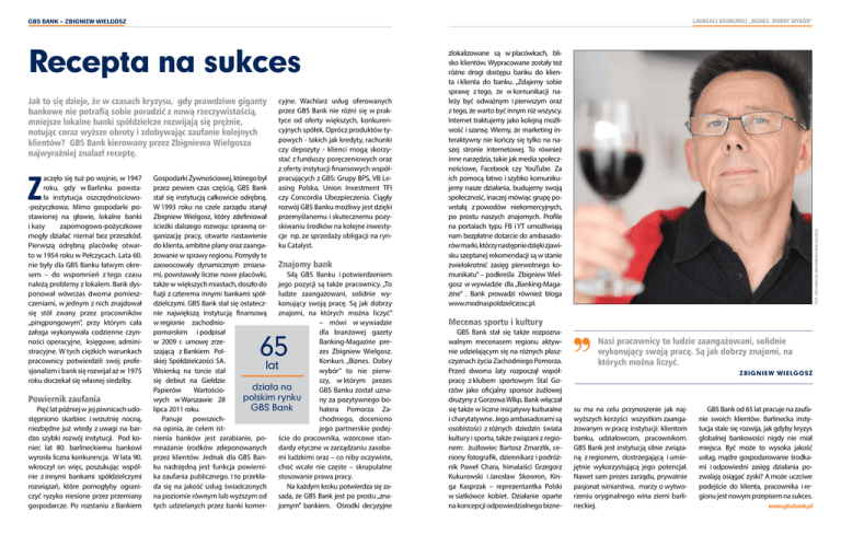 Laureaci konkursu „Biznes. dobry wybór” GBS Bank – zbigniew wielgosz Jak to się dzieje, że w czasach kryzysu, gdy prawdziwe giganty bankowe nie potrafią sobie poradzić z nową rzeczywistością, mniejsze lokalne banki spółdzielcze rozwijają się prężnie, notując coraz wyższe obroty i zdobywając zaufanie kolejnych klientów? GBS Bank kierowany przez Zbigniewa Wielgosza najwyraźniej znalazł receptę. Z aczęło się tuż po wojnie, w 1947 roku, gdy w Barlinku powstała instytucja oszczędnościowo-pożyczkowa. Mimo gospodarki postawionej na głowie, lokalne banki i kasy zapomogowo-pożyczkowe mogły działać niemal bez przeszkód. Pierwszą odrębną placówkę otwarto w 1954 roku w Pełczycach. Lata 60. nie były dla GBS Banku łatwym okresem – do wspomnień z tego czasu należą problemy z lokalem. Bank dysponował wówczas dwoma pomieszczeniami, w jednym z nich znajdował się stół zwany przez pracowników „pingpongowym”, przy którym cała załoga wykonywała codzienne czynności operacyjne, księgowe, administracyjne. W tych ciężkich warunkach pracownicy potwierdzili swój profesjonalizm i bank się rozwijał aż w 1975 roku doczekał się własnej siedziby. Powiernik zaufania Pięć lat później w jej piwnicach udostępniono skarbiec i wrzutnię nocną, niezbędne już wtedy z uwagi na bardzo szybki rozwój instytucji. Pod koniec lat 80. barlineckiemu bankowi wyrosła liczna konkurencja. W lata 90. wkroczył on więc, poszukując wspólnie z innymi bankami spółdzielczymi rozwiązań, które pomogłyby ograniczyć ryzyko niesione przez przemiany gospodarcze. Po rozstaniu z Bankiem cyjne. Wachlarz usług oferowanych przez GBS Bank nie różni się w praktyce od oferty większych, konkurencyjnych spółek. Oprócz produktów typowych - takich jak kredyty, rachunki czy depozyty - klienci mogą skorzystać z funduszy poręczeniowych oraz z oferty instytucji finansowych współpracujących z GBS: Grupy BPS, VB Leasing Polska, Union Investment TFI czy Concordia Ubezpieczenia. Ciągły rozwój GBS Banku możliwy jest dzięki przemyślanemu i skutecznemu pozyskiwaniu środków na kolejne inwestycje np. ze sprzedaży obligacji na rynku Catalyst. Gospodarki Żywnościowej, którego był przez pewien czas częścią, GBS Bank stał się instytucją całkowicie odrębną. W 1993 roku na czele zarządu stanął Zbigniew Wielgosz, który zdefiniował ścieżki dalszego rozwoju: sprawną organizację pracy, otwarte nastawienie do klienta, ambitne plany oraz zaangażowanie w sprawy regionu. Pomysły te zaowocowały dynamicznym zmianaZnajomy bank Siłą GBS Banku i potwierdzeniem mi, powstawały liczne nowe placówki, jego pozycji są także pracownicy. „To także w większych miastach, doszło do fuzji z czterema innymi bankami spółludzie zaangażowani, solidnie wydzielczymi. GBS Bank stał się ostateczkonujący swoją pracę. Są jak dobrzy nie największą instytucją finansową znajomi, na których można liczyć” w regionie zachodnio– mówi w wywiadzie pomorskim i podpisał dla branżowej gazety w 2009 r. umowę zrzeBanking-Magazine prezes Zbigniew Wielgosz. szającą z Bankiem Polskiej Spółdzielczości SA. Konkurs „Biznes. Dobry lat Wisienką na torcie stał wybór” to nie pierwsię debiut na Giełdzie szy, w którym prezes działa na Papierów WartościoGBS Banku został uznapolskim rynku wych w Warszawie 28 ny za pozytywnego boGBS Bank lipca 2011 roku. hatera Pomorza ZaPanuje powszechchodniego, doceniono na opinia, że celem istjego partnerskie podejnienia banków jest zarabianie, poście do pracownika, wzorcowe stanmnażanie środków zdeponowanych dardy etyczne w zarządzaniu zasobaprzez klientów. Jednak dla GBS Banmi ludzkimi oraz – co niby oczywiste, ku nadrzędną jest funkcja powiernichoć wcale nie częste – skrupulatne ka zaufania publicznego. I to przekłastosowanie prawa pracy. da się na jakość usług świadczonych Na każdym kroku potwierdza się zana poziomie równym lub wyższym od sada, że GBS Bank jest po prostu „znatych udzielanych przez banki komerjomym” bankiem. Ośrodki decyzyjne 65 FOT. Archiwum zbigniewa wielgosza Recepta na sukces zlokalizowane są w placówkach, blisko klientów. Wypracowane zostały też różne drogi dostępu banku do klienta i klienta do banku. „Zdajemy sobie sprawę z tego, że w komunikacji należy być odważnym i pierwszym oraz z tego, że warto być innym niż wszyscy. Internet traktujemy jako kolejną możliwość i szansę. Wiemy, że marketing interaktywny nie kończy się tylko na naszej stronie internetowej. To również inne narzędzia, takie jak media społecznościowe, Facebook czy YouTube. Za ich pomocą łatwo i szybko komunikujemy nasze działania, budujemy swoją społeczność, inaczej mówiąc grupę powstałą z powodów niekomercyjnych, po prostu naszych znajomych. Profile na portalach typu FB i YT umożliwiają nam bezpłatne dotarcie do ambasadorów marki, którzy następnie dzięki zjawisku szeptanej rekomendacji są w stanie zwielokrotnić zasięg pierwotnego komunikatu” – podkreśla Zbigniew Wielgosz w wywiadzie dla „Banking-Magazine” . Bank prowadzi również bloga www.modnaspoldzielczosc.pl. Mecenas sportu i kultury GBS Bank stał się także rozpoznawalnym mecenasem regionu aktywnie udzielającym się na różnych płaszczyznach życia Zachodniego Pomorza. Przed dwoma laty rozpoczął współpracę z klubem sportowym Stal Gorzów jako oficjalny sponsor żużlowej drużyny z Gorzowa Wlkp. Bank włączał się także w liczne inicjatywy kulturalne i charytatywne. Jego ambasadorami są osobistości z różnych dziedzin świata kultury i sportu, także związani z regionem: żużlowiec Bartosz Zmarzlik, ceniony fotografik, dziennikarz i podróżnik Paweł Chara, himalaiści Grzegorz Kukurowski i Jarosław Skowron, Kinga Kasprzak – reprezentantka Polski w siatkówce kobiet. Działanie oparte na koncepcji odpowiedzialnego bizne- Nasi pracownicy to ludzie 