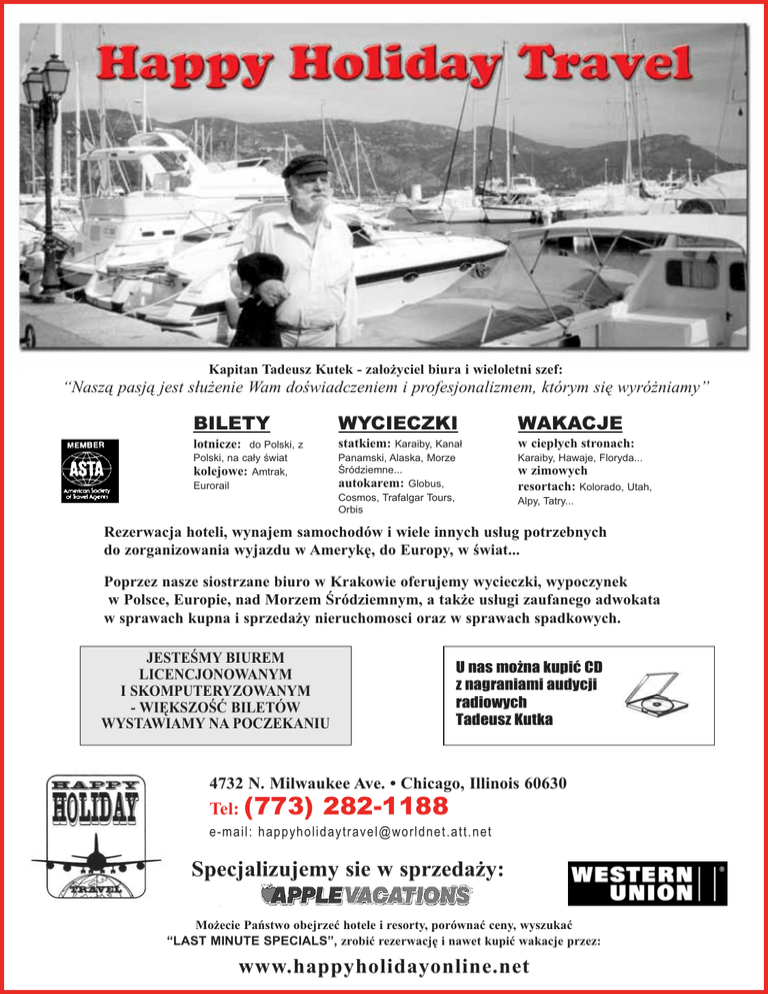 Kapitan Tadeusz Kutek - założyciel biura i wieloletni szef: “Naszą pasją jest służenie Wam doświadczeniem i profesjonalizmem, którym się wyróżniamy” BILETY WYCIECZKI WAKACJE lotnicze: do Polski, z Polski, na cały świat kolejowe: Amtrak, Eurorail statkiem: Karaiby, Kanał Panamski, Alaska, Morze Śródziemne... autokarem: Globus, Cosmos, Trafalgar Tours, Orbis w ciepłych stronach: Karaiby, Hawaje, Floryda... w zimowych resortach: Kolorado, Utah, Alpy, Tatry... Rezerwacja hoteli, wynajem samochodów i wiele innych usług potrzebnych do zorganizowania wyjazdu w Amerykę, do Europy, w świat... Poprzez nasze siostrzane biuro w Krakowie oferujemy wycieczki, wypoczynek w Polsce, Europie, nad Morzem Śródziemnym, a także usługi zaufanego adwokata w sprawach kupna i sprzedaży nieruchomosci oraz w sprawach spadkowych. JESTEŚMY BIUREM LICENCJONOWANYM I SKOMPUTERYZOWANYM - WIĘKSZOŚĆ BILETÓW WYSTAWIAMY NA POCZEKANIU U nas można kupić CD z nagraniami audycji radiowych Tadeusz Kutka 4732 N. Milwaukee Ave. • Chicago, Illinois 60630 Tel: (773) 282-1188 e-mail: [email protected] Specjalizujemy sie w sprzedaży: Możecie Państwo obejrzeć hotele i resorty, porównać ceny, wyszukać “LAST MINUTE SPECIALS”, zrobić rezerwację i nawet kupić wakacje przez: www.happyholidayonline.net