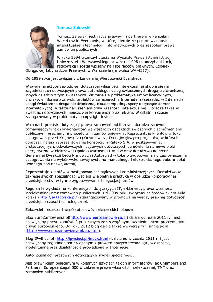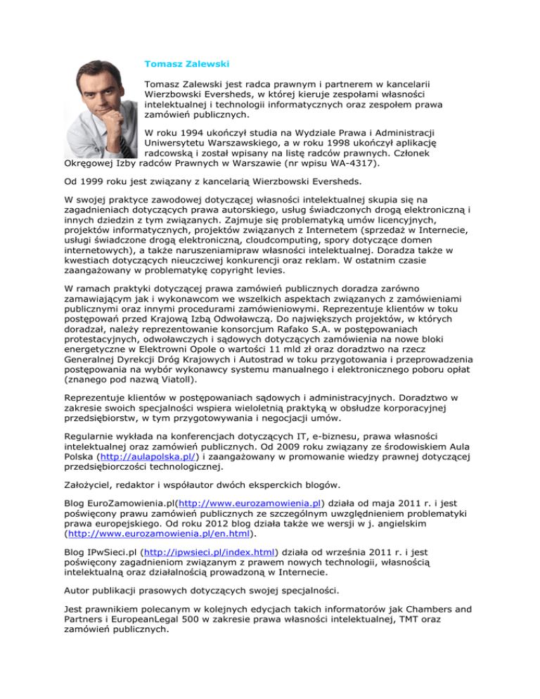Tomasz Zalewski Tomasz Zalewski jest radca prawnym i partnerem w kancelarii Wierzbowski Eversheds, w której kieruje zespołami własności intelektualnej i technologii informatycznych oraz zespołem prawa zamówień publicznych. W roku 1994 ukończył studia na Wydziale Prawa i Administracji Uniwersytetu Warszawskiego, a w roku 1998 ukończył aplikację radcowską i został wpisany na listę radców prawnych. Członek Okręgowej Izby radców Prawnych w Warszawie (nr wpisu WA-4317). Od 1999 roku jest związany z kancelarią Wierzbowski Eversheds. W swojej praktyce zawodowej dotyczącej własności intelektualnej skupia się na zagadnieniach dotyczących prawa autorskiego, usług świadczonych drogą elektroniczną i innych dziedzin z tym związanych. Zajmuje się problematyką umów licencyjnych, projektów informatycznych, projektów związanych z Internetem (sprzedaż w Internecie, usługi świadczone drogą elektroniczną, cloudcomputing, spory dotyczące domen internetowych), a także naruszeniamipraw własności intelektualnej. Doradza także w kwestiach dotyczących nieuczciwej konkurencji oraz reklam. W ostatnim czasie zaangażowany w problematykę copyright levies. W ramach praktyki dotyczącej prawa zamówień publicznych doradza zarówno zamawiającym jak i wykonawcom we wszelkich aspektach związanych z zamówieniami publicznymi oraz innymi procedurami zamówieniowymi. Reprezentuje klientów w toku postępowań przed Krajową Izbą Odwoławczą. Do największych projektów, w których doradzał, należy reprezentowanie konsorcjum Rafako S.A. w postępowaniach protestacyjnych, odwoławczych i sądowych dotyczących zamówienia na nowe bloki energetyczne w Elektrowni Opole o wartości 11 mld zł oraz doradztwo na rzecz Generalnej Dyrekcji Dróg Krajowych i Autostrad w toku przygotowania i przeprowadzenia postępowania na wybór wykonawcy systemu manualnego i elektronicznego poboru opłat (znanego pod nazwą Viatoll). Reprezentuje klientów w postępowaniach sądowych i administracyjnych. Doradztwo w zakresie swoich specjalności wspiera wieloletnią praktyką w obsłudze korporacyjnej przedsiębiorstw, w tym przygotowywania i negocjacji umów. Regularnie wykłada na konferencjach dotyczących IT, e-biznesu, prawa własności intelektualnej oraz zamówień publicznych. Od 2009 roku związany ze środowiskiem Aula Polska (http://aulapolska.pl/) i zaangażowany w promowanie wiedzy prawnej dotyczącej przedsiębiorczości technologicznej. Założyciel, redaktor i współautor dwóch eksperckich blogów. Blog EuroZamowienia.pl(http://www.eurozamowienia.pl) działa od maja 2011 r. i jest poświęcony prawu zamówień publicznych ze szczególnym uwzględnieniem problematyki prawa europejskiego. Od roku 2012 blog działa także we wersji w j. angielskim (http://www.eurozamowienia.pl/en.html). Blog IPwSieci.pl (http://ipwsieci.pl/index.html) działa od września 2011 r. i jest poświęcony zagadnieniom związanym z prawem nowych technologii, własnością intelektualną oraz działalnością prowadzoną w Internecie. Autor publikacji prasowych dotyczących swojej specjalności. Jest prawnikiem polecanym w kolejnych edycjach takich informatorów jak Chambers and Partners i EuropeanLegal 500 w zakresie prawa własności intelektualnej, TMT oraz zamówień publicznych. Od 2012 roku Tomasz Zalewski jest arbitrem Sądu Arbitrażowego Rynku Audiowizualnego przy Krajowej Izbie Producentów Audiowizualnych w Warszawie. Inicjator i menadżer programu pro bono dla przedsiębiorców technologicznych InternetStartUp (http://www.internetstartup.pl/, w ramach którego kancelaria Wierzbowski Eversheds wspiera nieodpłatnie przedsiębiorców w projektach związanych z Internetem i nowymi technologiami. Dwukrotnie nominowany w konkursie Prawnik Pro Bono 2008 i 2009 za pomoc organizacjom pozarządowym dotyczącym prawa zamówień publicznych. Pomysłodawca pierwszej w Polsce aplikacji mobilnej prawniczej (premiera – styczeń 2013) – anglojęzycznego przewodnika po polskim prawie zamówień publicznych Procurement Explorer (http://aplikacja.procurementexplorer.pl/). Koordynator praktyki zamówień publicznych w Europie w ramach sieci Eversheds International. telefon: +48 22 50 50 796 telefonkomórkowy: +48 502 18 45 96 e-mail: [email protected] Twitter: @tomasz_zalewski LinkedIn: pl.linkedin.com/in/tomaszzalewski/