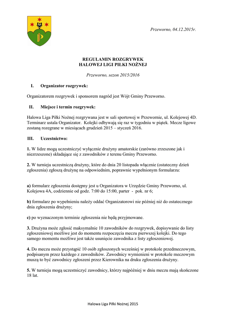 Przeworno, 04.12.2015r. REGULAMIN ROZGRYWEK HALOWEJ