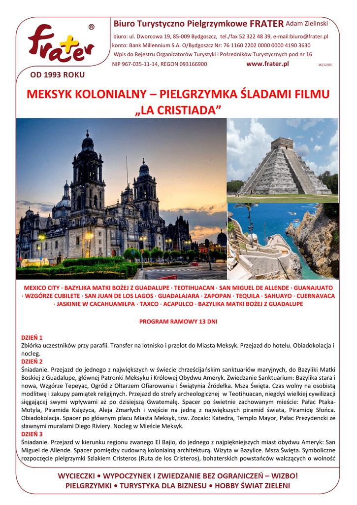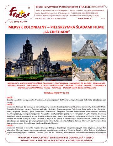 Biuro Turystyczno Pielgrzymkowe FRATER Adam Zielinski biuro: ul. Dworcowa 19, 85-009 Bydgoszcz, tel./fax 52 322 48 39, e-mail:[email protected] konto: Bank Millennium S.A. O/Bydgoszcz Nr: 76 1160 2202 0000 0000 4190 3630 Wpis do Rejestru Organizatorów Turystyki i Pośredników Turystycznych pod nr 16 NIP 967-035-11-14, REGON 093166900 www.frater.pl 16/12/05 MEKSYK KOLONIALNY – PIELGRZYMKA ŚLADAMI FILMU „LA CRISTIADA” MEXICO CITY · BAZYLIKA MATKI BOŻEJ Z GUADALUPE · TEOTIHUACAN · SAN MIGUEL DE ALLENDE · GUANAJUATO · WZGÓRZE CUBILETE · SAN JUAN DE LOS LAGOS · GUADALAJARA · ZAPOPAN · TEQUILA · SAHUAYO · CUERNAVACA · JASKINIE W CACAHUAMILPA · TAXCO · ACAPULCO · BAZYLIKA MATKI BOŻEJ Z GUADALUPE PROGRAM RAMOWY 13 DNI DZIEŃ 1 Zbiórka uczestników przy parafii. Transfer na lotnisko i przelot do Miasta Meksyk. Przejazd do hotelu. Obiadokolacja i nocleg. DZIEŃ 2 Śniadanie. Przejazd do jednego z największych w świecie chrześcijańskim sanktuariów maryjnych, do Bazyliki Matki Boskiej z Guadalupe, głównej Patronki Meksyku i Królowej Obydwu Ameryk. Zwiedzanie Sanktuarium: Bazylika stara i nowa, Wzgórze Tepeyac, Ogród z Ołtarzem Ofiarowania i Świątynia Źródełka. Msza Święta. Czas wolny na osobistą modlitwę i zakupy pamiątek religijnych. Przejazd do strefy archeologicznej w Teotihuacan, niegdyś wielkiej cywilizacji sięgającej swymi wpływami aż po dzisiejszą Gwatemalę. Spacer po świetnie zachowanym mieście: Pałac PtakaMotyla, Piramida Księżyca, Aleja Zmarłych i wejście na jedną z największych piramid świata, Piramidę Słońca. Obiadokolacja. Spacer po głównym placu Miasta Meksyk, tzw. Zocalo: Katedra, Templo Mayor, Pałac Prezydencki ze sławnymi muralami Diego Riviery. Nocleg w Mieście Meksyk. DZIEŃ 3 Śniadanie. Przejazd w kierunku regionu zwanego El Bajio, do jednego z najpiękniejszych miast obydwu Ameryk: San Miguel de Allende. Spacer pomiędzy cudowną kolonialną architekturą. Wizyta w Bazylice. Msza Święta. Symboliczne rozpoczęcie pielgrzymki Szlakiem Cristeros (Ruta de los Cristeros), bohaterskich powstańców walczących o wolność Biuro Turystyczno Pielgrzymkowe FRATER Adam Zielinski biuro: ul. Dworcowa 19, 85-009 Bydgoszcz, tel./fax 52 322 48 39, e-mail:[email protected] konto: Bank Millennium S.A. O/Bydgoszcz Nr: 76 1160 2202 0000 0000 4190 3630 Wpis do Rejestru Organizatorów Turystyki i Pośredników Turystycznych pod nr 16 NIP 967-035-11-14, REGON 093166900 www.frater.pl 16/12/05 religijną. W 1926 roku zostało zatwierdzone prawo o rozdziale Kościoła od Państwa, co zaowocowało zawieszeniem kultu chrześcijanskiego i prześladowaniem wierzących. W odpowiedzi tysiące Meksykanów rozpoczęło tzw. Cristiada, wojnę w obronie swoich praw. Wśród ofiar znajdowało się wielu księży, dziś świętych i błogosławionych. Przejazd do Guanajuato na obiadokolację i nocleg. DZIEŃ 4 Śniadanie. Zwiedzanie Guanajuato. Miasto to, podczas epoki kolonialnej, wzbogaciło się na wydobyciu złota i srebra, co odzwierciedla się w pięknej architekturze i sztuce. Na początku XIX wieku było miejscem pierwszej bitwy powstańców pod wodzą ks. Miguela Hidalgo przeciwko Hiszpanom. Podczas Cristiady było miejscem bohaterskiego oporu katolików przeciwko rządom Prezydenta Callesa. Spacer po mieście i podziwianie wspaniałej architektury kolonialnej, barokowych kościołów i zacienionych placów: Teoatro Juarez, La Alhondiga de Granaditas. Wizyta w mrożącym krew w żyłach Muzeum Mumii. Wjazd na wzgórze Cubilete, gdzie znajduje się mierząca 20 metrów, najwyższa w Meksyku, figura Chrystusa Króla. Obiadokolacja i nocleg w okolicach Lagos Moreno. DZIEŃ 5 Śniadanie. Zwiedzanie jednego z najważniejszych, po Guadalupe, Sanktuariów Maryjnych Meksyków w San Juan de los Lagos. W Sanktuarium tym, podczas jednej z pielgrzymek do Meksyku przebywał i odprawiał Mszę Świętą błogosławiony Jan Paweł II. Msza Święta. Zwiedzanie Guadalajary, trzeciego pod względem wielkości miasta Meksyku, stolicy stanu Jalisco. Spacer po mieście i zwiedzanie między innymi Teatru Degollado y Hospicjum Cabanas. Obiadokolacja i nocleg w Guadalajara. DZIEŃ 6 Śniadanie. Wizyta w Sanktuarium Matki Boskiej Oczekującej w Zapopan, na przedmieściach Guadalajara. Jest to drugie pod względem odwiedzających je pielgrzymów sanktuarium w Meksyku. Co roku pielgrzymuje tam ponad 5 milionów wiernych. Przejazd do miejscowości Tequila znanej z produkcji narodowego trunku Meksykanów o tej samej nazwie. Zapoznanie się z procesem produkcji, degustacja i możliwość zakupu. Powrót do Guadalajary na obiadokolację i nocleg. DZIEŃ 7 Śniadanie. Przejazd do Sahuayo w stanie Michoacan, gdzie znajduje się miejsce narodzin jednego z najmłodszych męczenników La Cristiady, Błogosławionego José Sanchez del Rio, który oddał życie za Chrystusa w wieku 15 lat. Wizyta w kościele Św. Jakuba Apostoła, gdzie był chrzczony. Msza Święta. Obiadokolacja i nocleg w Mieście Meksyk. DZIEŃ 8 Śniadanie. Przejazd do “miasta wiecznej wiosny” Cuernavaca. Wizyta w jednym z pierwszych kościołów katedralnych na terenie dzisiejszego Meksyku, spacer po mieście. Zwiedzanie jednego z największych w Meksyku systemu jaskiń w Cacahuamilpa. Ponad godzinny spacer po jaskini i podziwianie stalaktytów, stalagmitów, stalagnatów i innych formacji skalnych. Przejazd do Taxco, zakwaterowanie w pięknym, starym hotelu z widokiem na miasto. Obiadokolacja i nocleg. DZIEŃ 9 Śniadanie. Zwiedzanie sławnego ze sztuki jubilerskiej “srebrnego miasta” Taxco. Wjazd na punkty widokowe, spacer ulicami miasta, zwiedzanie przepięknego kolonialnego kościoła Santa Prisca. Msza Święta. Przejazd w kierunku „perły Pacifiku” Acapulco. Zakwaterowanie w hotelu all inclusive z bezpośrednim dostępem do morza. DZIEŃ 10 - 11 Wypoczynek all inclusive w Acapulco. DZIEŃ 12 Śniadanie. Przejazd do Bazyliki Matki Bożej w Guadalupe. Msza św. Pożegnanie Sankt