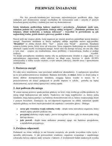 PIERWSZE ŚNIADANIE Nie bez powodu śniadanie jest nazywane najważniejszym posiłkiem dnia. Jego zadaniem jest dostarczenie energii niezbędnej do rozruszania ciała i umysłu. Z pustym brzuchem gorzej myślimy i trudniej jest nam się skoncentrować. Istotę śniadania podkreślają ludowe mądrości i przysłowia. „Śniadanie zjedz sam, obiadem podziel się z przyjacielem, kolację oddaj wrogowi”. „Śniadanie powinno być książęce, obiad królewski, a kolacja żebracza” - wszystkie te powiedzenia są jak najbardziej trafne, jeżeli chodzi o pierwszy posiłek w dniu. Nawet jeśli nie czujesz głodu, twój organizm po nocnej przerwie potrzebuje nowej dostawy energii. Znaczenie śniadania w diecie najlepiej oddaje angielska nazwa tego posiłku. "Breakfast" to zbitka dwóch słów: "fast" – pościć oraz "break" – przerwać. Śniadanie oznacza koniec postu, który trwa od wieczora. Nocą organizm funkcjonuje na zwolnionych obrotach i spala resztki wczorajszej energii. Jeżeli rano nie dostaje świeżej, nie ma siły. Daje o tym znać – czujesz się rozdrażniona, masz problemy z koncentracją, trudno ci podjąć większy wysiłek. To dzięki porządnemu śniadaniu mamy siłę na podejmowanie działań w ciągu dnia. I co najważniejsze zapewniamy sobie zdrowie na długi czas, bowiem w około 30-50% zmniejszamy u siebie ryzyko otyłości, a tym samym cukrzycy, chorób serca i spowolnienia metabolizmu. 1. Dostarcza energii Po całej nocy niejedzenia, rano powinnaś naładować akumulatory. A najlepszym sposobem na to jest pełnowartościowe śniadanie. Badania dowiodły, że dzieci, które co dzień jedzą w domu dobrze skomponowane śniadania, osiągają lepsze wyniki w nauce, bo w przeciwieństwie do dzieci jadających te posiłki dopiero w szkole, potrafią się lepiej skoncentrować, są też mniej agresywne i mniej ospałe. 2. Jest paliwem dla mózgu W czasie nocnej przerwy spada poziom glukozy we krwi, więc trzeba go szybko podnieść, by mózg mógł funkcjonować jak należy. Naukowcy nie mają wątpliwości: ci, którzy jedzą śniadanie, mają lepszą pamięć i są bardziej skoncentrowani niż ci, którzy rozpoczynają dzień z pustym brzuchem. Zmniejsza się też odporność organizmu na chłód, natomiast spadek stężenia glukozy we krwi może prowadzić do ospałości i zawrotów głowy. Dlatego: zaraz gdy wstaniesz wypij szklankę wody - dzięki temu nawodnisz organizm, który utracił zapasy płynów podczas snu. przygotuj ulubiony ciepły napój - jest to szczególnie ważne, gdy za oknem pada śnieg lub leje deszcz. jedz powoli - dzięki temu unikniesz porannej zgagi, nie będziesz przejedzona, a metabolizm przyspieszy. 3. Zwiększa odporność Podatność na różne infekcje to nie kwestia szczęścia, ale przede wszystkim trybu życia i sposobu odżywiania. A jak powszechnie wiadomo, organizm wyspanego i najedzonego człowieka łatwiej odpiera ataki wirusów i bakterii. Z wieloletnich badań naukowych wynika ponadto, że jedzenie śniadań poprawia odporność i zapobiega otyłości i próchnicy. Specjaliści podkreślają, że dzieci zaczynające dzień od zdrowego posiłku przyzwyczajają się do jedzenia mniejszych porcji, za to regularnie, mają niższy poziom cholesterolu we krwi i rzadziej skarżą się na bóle brzucha. W pustych żołądkach dzieci nie jadających śniadań wydziela się zaś nadmierna ilość kwasu, który podrażnia śluzówkę, zaburzając pracę układu pokarmowego. 4. Chroni przed otyłością I to nie tylko dlatego, że po upływie kilku godzin nie rzucasz się na byle co i nie podjadasz bez ustanku. Dzięki śniadaniu metabolizm przyśpiesza, a więc organizm szybciej spala kalorie i na bieżąco produkuje energię potrzebną do codziennych obowiązków. Poza tym według najnowszych badań dzienny bilans kaloryczny osób jedzących śniadanie jest znacznie niższy niż tych, którzy pomijają ten posiłek. 5. …to ważny poranny rytuał Pozwala łagodnie „wejść” w nowy dzień. Jedząc, rozmawiając, sięgając po kanapkę czy kubek kakao masz czas, by się dobudzić i rozruszać. A poza tym to świetny moment, by spędzić trochę czasu z rodziną, dla której w ciągu dnia nie mamy zbyt wiele czasu. Śniadanie ma dostarczyć energii: 1. Aby śniadanie spełniło swoje zadanie, musi być odpowiednio skomponowane. Ma dostarczyć sporej dawki węglowodanów złożonych, które łagodnie podnoszą poziom cukru we krwi i dostarczają energii na długo. Nie dają wprawdzie takiego jej zastrzyku jak słodycze, ale dzięki nim organizm funkcjonuje wydajniej przez dłuższy czas, a głód pojawia się później niż po zjedzeniu czegoś typowo słodkiego. Idealnym źródłem węglowodanów złożonych jest pieczywo pełnoziarniste, (dostarcza także witamin, magnezu, cynku i błonnika), niesłodzone płatki śniadaniowe (obfitujące też w błonnik). 2. Kolejnym składnikiem dobrego śniadania powinny być produkty zawierające białko i wapń – niesłodzony jogurt, zupa mleczna, kefir, żółty ser, twarożek. Nie wolno zapominać o warzywach bogatych w witaminy – dobrym dodatkiem do kanapki będzie plasterek pomidora, liść sałaty, pokrojona papryka. 3. Śniadanie mogą uzupełnić owoce dodane do jogurtu (banany, truskawki, maliny, pomarańcze). 4. Menu warto wzbogacić o jajka, np. na miękko czy w postaci jajecznicy. Jajka zawierają m.in. witaminy z grupy B (ich niedobór objawia się u dzieci zaburzeniami funkcji neurologicznych, jak znużenie czy nerwowość), a także żelazo (przeciwdziała anemii, poprawia koncentrację). 5. Świetnym dodatkiem będą kiełki i orzechy bogate w witaminy i mikroelementy (np. jeden orzech brazylijski pokrywa całodzienne zapotrzebowanie na selen). W śniadaniu nie ma miejsca na dosładzane płatki zbożowe, tłuste wędliny , fast foody czy słodkie desery „ mleczne”. Należy bowiem pamiętać, że nadmiar cukru eliminuje niektóre witaminy z pożywienia –obniża wię