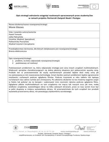 Opis strategii wdrożenia osiągnięć naukowych opracowanych przez studenta/ów w ramach projektu Partnerski Związek Nauki i Postępu Nazwa działania/nazwa rozwiązania/strategii Movie Glasses Imię i nazwisko autora/autorów Paweł Tomasik Julita Pałczyoska Uczelnia, Wydział, Specjalnośd Politechnika Poznaoska Wydział Inżynierii Zarządzania Przedsiębiorstwo lub branża, dla których dedykowane jest rozwiązanie/strategia Branża elektroniczna Opis rozwiązania/strategii: 1. problem, na który odpowiada rozwiązanie/strategia 2. podstawowy cel realizacji Podstawowym problemem na, który odpowiada strategia jest cena innych urządzeo multimedialnych. Większośd sprzętów charakteryzujących się dobrą jakością okupiona jest jednocześnie wysoką ceną. Produkt ten w przeciwieostwie do wyżej wymienionych posiadad będzie dośd niską cenę jak na zastosowaną w nim nowoczesną technologię. Innym bardzo ważnym problemem będzie ograniczenie możliwości ruchowych podczas oglądania filmów. Podczas trzymanie w reku tabletu lub laptopa na kolanach nasz zakres ruchów jest zmniejszony. Po założeniu okularów na nos możemy wygonie usiąśd w fotelu lub położyd się na kanapie i wykonywad inne czynności rękoma podczas oglądania filmu. Oglądanie plików multimedialnych na tym urządzeniu nie męczy tak naszych oczu jak inne, małej wielkości urządzenia, wyświetlające obraz na kilku calowych ekranach, przez co nasz wzrok musi byd w pełni skupiony w miejscu wyświetlania obrazu. W przeciwieostwie do tych urządzeo ten produkt wyświetla przestrzenny obraz, nie powodujący dyskomfortu wzrokowego. 1 61-713 Poznań, al. Niepodległości 18, tel. 61 64 75 326 www.naukaipostep.pl www.umww.pl Projekt „Partnerski Związek Nauki i Postępu” współfinansowany ze środków Unii Europejskiej w ramach Europejskiego Funduszu Społecznego Elementy innowacyjne rozwiązania/strategii (jeśli istnieją) Produkt ten, sam w sobie będzie innowacyjny dzięki temu, iż będzie on prawdziwą nowością na rynku. Do tej pory żadne z wyprodukowanych urządzeo nie charakteryzowało się zbliżoną funkcjonalnością. Innowacyjnością tego urządzenia będzie sposób jego działania. Mimo iż okulary umieścimy na nosie, a obraz wyświetlany będzie tuż przed naszymi oczami, nie uniemożliwi nam to kontaktu z otoczeniem, dzięki minimalizacji obrazu. Kolejną innowacyjnością będzie możliwośd obejrzenia filmów w formacie 3D w każdym miejscu w którym się znajdziemy. Będzie to produkt, który nie odstaje od aktualnych trendów, ponieważ coraz więcej filmów tworzonych jest właśnie w tym formacie. Urządzenie to systematycznie będzie unowocześniane, aby nie pozostawało w tyle lecz wiodło prym w danym sektorze rynku. Spodziewane korzyści dla przedsiębiorstwa wdrażającego rozwiązanie/strategię Pierwszą podstawową korzyścią dla przedsiębiorstwa, które wdroży nasz pomysł będzie pozyskanie bardzo szerokiej grupy klientów- będą to również osoby , które wcześniej korzystały z urządzeo konkurencyjnych firm. Kolejną z korzyści będzie otwarcie się firmy na nowe horyzonty dzięki wprowadzeniu an rynek urządzenia przekraczającego aktualne bariery technologiczne. Inną bardzo ważną korzyścią będzie sprzedaż oscylująca w granicy 35 tysięcy sztuk sprzętu, która wiąże się z zyskiem finansowym wynoszącym ponad 120 tysięcy złotych, w pierwszym roku od pojawienia się produktu na rynku. Kolejną bardzo ważną korzyścią dla tego przedsiębiorstwa będzie możliwośd rozszerzenia dotychczas produkowanego asortymentu o nowy produkt jak również przejście do nowych segmentów rynku. Produkt ten umocni również dotychczasową pozycje przedsiębiorstwa na rynku oraz poprawi rozpoznawalnośd marki. Jednocześnie, uprzejmie prosimy o wyrażenie zgody na przetwarzanie danych osobowych zgodnie z ustawą z dnia 29 sierpnia 1997 r. o ochronie danych osobowych z późn. zmianami przez Samorząd Województwa Wielkopolskiego i Politechnikę Poznańską w celu umieszczenia opisów osiągnięć naukowych na stronie www.naukaipostep.pl. 2 61-713 Poznań, al. Niepodległości 18, tel. 61 64 75 326 www.naukaipostep.pl www.umww.pl Projekt „Partnerski Związek Nauki i Postępu” współfinansowany ze środków Unii Europejskiej w ramach Europejskiego Funduszu Społecznego