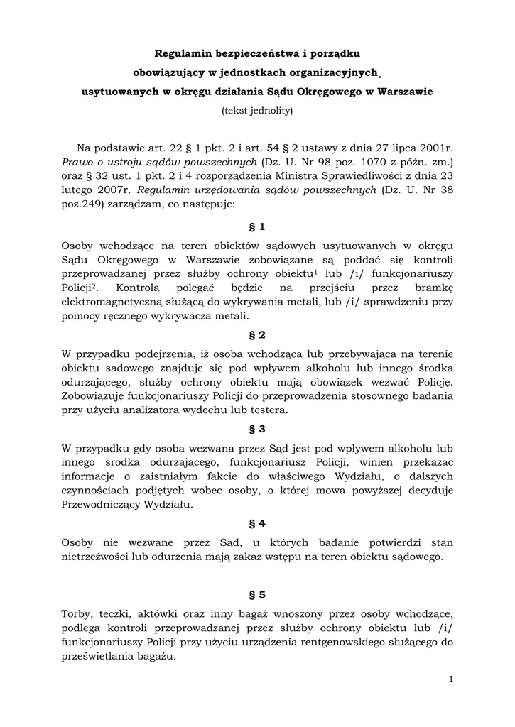 Regulamin bezpieczeństwa i porządku obowiązujący w jednostkach organizacyjnych¸ usytuowanych w okręgu działania Sądu Okręgowego w Warszawie (tekst jednolity) Na podstawie art. 22 § 1 pkt. 2 i art. 54 § 2 ustawy z dnia 27 lipca 2001r. Prawo o ustroju sądów powszechnych (Dz. U. Nr 98 poz. 1070 z późn. zm.) oraz § 32 ust. 1 pkt. 2 i 4 rozporządzenia Ministra Sprawiedliwości z dnia 23 lutego 2007r. Regulamin urzędowania sądów powszechnych (Dz. U. Nr 38 poz.249) zarządzam, co następuje: §1 Osoby wchodzące na teren obiektów sądowych usytuowanych w okręgu Sądu Okręgowego w Warszawie zobowiązane są poddać się kontroli przeprowadzanej przez służby ochrony obiektu1 lub /i/ funkcjonariuszy Policji2. Kontrola polegać będzie na przejściu przez bramkę elektromagnetyczną służącą do wykrywania metali, lub /i/ sprawdzeniu przy pomocy ręcznego wykrywacza metali. §2 W przypadku podejrzenia, iż osoba wchodząca lub przebywająca na terenie obiektu sadowego znajduje się pod wpływem alkoholu lub innego środka odurzającego, służby ochrony obiektu mają obowiązek wezwać Policję. Zobowiązuję funkcjonariuszy Policji do przeprowadzenia stosownego badania przy użyciu analizatora wydechu lub testera. §3 W przypadku gdy osoba wezwana przez Sąd jest pod wpływem alkoholu lub innego środka odurzającego, funkcjonariusz Policji, winien przekazać informacje o zaistniałym fakcie do właściwego Wydziału, o dalszych czynnościach podjętych wobec osoby, o której mowa powyższej decyduje Przewodniczący Wydziału. §4 Osoby nie wezwane przez Sąd, u których badanie potwierdzi stan nietrzeźwości lub odurzenia mają zakaz wstępu na teren obiektu sądowego. §5 Torby, teczki, aktówki oraz inny bagaż wnoszony przez osoby wchodzące, podlega kontroli przeprowadzanej przez służby ochrony obiektu lub /i/ funkcjonariuszy Policji przy użyciu urządzenia rentgenowskiego służącego do prześwietlania bagażu. 1 §6 W przypadku gdy obiekt nie został wyposażony w urządzenie, o którym mowa w § 5, kontrola bagażu, winna zostać przeprowadzona wizualnie lub przy użyciu innych dostępnych środków. §7 Z obowiązku poddania się czynnościom sprawdzającym wymienionym w § 1, § 5 i § 6 zwolnieni są: pracownicy resortu sprawiedliwości, organów ścigania, służb ochrony państwa, Prokuratorii Generalnej oraz adwokaci, radcy prawni¸ rzecznicy patentowi i notariusze, podczas korzystania z wejść służbowych po wcześniejszym okazaniu ważnej legitymacji służbowej. §8 W przypadku wejść wyposażonych w czytniki kart magnetycznych osoby wymienione w § 7, winny posłużyć się kartą uprawniającą do korzystania z wejść służbowych. §9 Prezes właściwego Sądu lub osoba przez niego upoważniona może zawiesić czasowo lub na stałe, korzystanie z przywileju, o którym mowa w § 7 i § 8. § 10 Bagaż osób wychodzących, w tym również pracowników administracji i obsługi Sądu może zostać poddany kontroli zgodnej z § 5 i § 6 jeżeli zachodzi podejrzenie, że wynoszone jest mienie lub dokumentacja sądowa. § 11 1. Zabrania się wnoszenia na teren obiektów sądowych broni, amunicji, materiałów wybuchowych, miotaczy gazu, paralizatorów elektrycznych, materiałów żrących, łatwopalnych, narkotyków, alkoholu oraz wszystkich innych przedmiotów, które według oceny służby ochrony lub/i/ Policji, mogą stanowić zagrożenie dla życia lub zdrowia osób przebywających na terenie obiektu. 2. Dozwolone jest wnoszenie i posiadanie na terenie obiektów sądowych w okręgu Sądu Okręgowego w Warszawie przedmiotów niezbędnych w postępowaniu przed sądem. 3. Przedmioty zbędne zdawane są do depozytu sądowego przy wejściu do obiektów sądowych w okręgu Sądu Okręgowego Warszawie. 2 § 12 Przedmioty i narzędzia uznane przez służby ochrony obiektu lub /i/ funkcjonariuszy Policji za niebezpieczne (z wyjątkiem broni palnej) oraz bagaż mogący stanowić utrudnienie w poruszaniu się innych osób po terenie obiektu sądowego, służby ochrony obiektu mają obowiązek przejąć w depozyt z zachowaniem ustalonych procedur i przechować do czasu opuszczenia obiektu przez osobę deponującą, w wyznaczonym i odpowiednio zabezpieczonym do tego celu miejscu. § 13 Broń palną na terenie obiektów sądowych mogą posiadać jedynie osoby wykonujące, zadania służbowe wymagające jej posiadania. § 14 Ekipy telewizyjne i filmowe oraz dziennikarze i fotoreporterzy, wchodzą na teren obiektów sadowych w godzinach urzędowania Sądu wejściem dla interesantów po okazaniu „Legitymacji prasowej” i poddaniu się kontroli określonej w § 1, § 5 i § 6. § 15 Sąd może zezwolić przedstawicielom radia, telewizji, filmu dokonywanie za pomocą aparatury utrwaleń obrazu i dźwięku rozprawy, gdy uzasadniony interes społeczny za tym dokonywanie tych czynności nie będzie utrudniać prowadzenia ważny interes uczestnika postępowania temu się nie sprzeciwia. i prasy na z przebiegu przemawia, rozprawy, a § 16 Sąd może określić warunki, od których uzależnia wydanie zezwolenia, o którym mowa w § 15. § 17 Po godzinach urzędowania Sądu wejście przedstawicieli mediów na teren obiektu sądowego uwarunkowane jest otrzymaniem zgody Prezesa właściwego Sądu lub przewodniczącego składu orzekającego. § 18 Przedstawiciele mediów oraz publiczność przed wejściem na salę rozpraw mogą zostać poddani ponownej kontroli przez służby ochrony obiektu lub /i/ Policję. Ze względów bezpieczeństwa Prezes właściwego Sądu lub osoba przez niego upoważniona ma prawo wprowadzić system przepustek. § 19 3 Wokół sal rozpraw, w których toczyć się będą rozprawy „o podwyższonym stopniu ryzyka” lub o wyłączonej jawności, mogą zostać wyznaczone strefy po których poruszać się mogą, jedynie służby ochrony obiektu. Policja oraz funkcjonariusze służb ochrony państwa i osoby wezwane przez Sąd na rozprawę. § 20 O