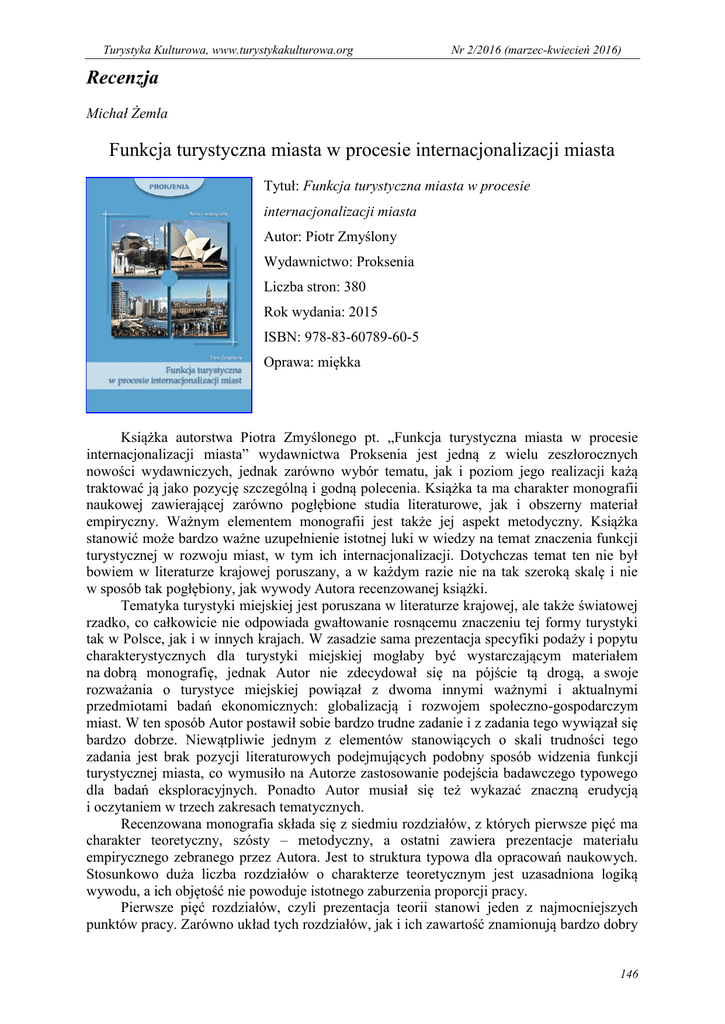 Turystyka Kulturowa, www.turystykakulturowa.org Nr 2/2016 (marzec-kwiecień 2016) Recenzja Michał Żemła Funkcja turystyczna miasta w procesie internacjonalizacji miasta Tytuł: Funkcja turystyczna miasta w procesie internacjonalizacji miasta Autor: Piotr Zmyślony Wydawnictwo: Proksenia Liczba stron: 380 Rok wydania: 2015 ISBN: 978-83-60789-60-5 Oprawa: miękka Książka autorstwa Piotra Zmyślonego pt. „Funkcja turystyczna miasta w procesie internacjonalizacji miasta” wydawnictwa Proksenia jest jedną z wielu zeszłorocznych nowości wydawniczych, jednak zarówno wybór tematu, jak i poziom jego realizacji każą traktować ją jako pozycję szczególną i godną polecenia. Książka ta ma charakter monografii naukowej zawierającej zarówno pogłębione studia literaturowe, jak i obszerny materiał empiryczny. Ważnym elementem monografii jest także jej aspekt metodyczny. Książka stanowić może bardzo ważne uzupełnienie istotnej luki w wiedzy na temat znaczenia funkcji turystycznej w rozwoju miast, w tym ich internacjonalizacji. Dotychczas temat ten nie był bowiem w literaturze krajowej poruszany, a w każdym razie nie na tak szeroką skalę i nie w sposób tak pogłębiony, jak wywody Autora recenzowanej książki. Tematyka turystyki miejskiej jest poruszana w literaturze krajowej, ale także światowej rzadko, co całkowicie nie odpowiada gwałtowanie rosnącemu znaczeniu tej formy turystyki tak w Polsce, jak i w innych krajach. W zasadzie sama prezentacja specyfiki podaży i popytu charakterystycznych dla turystyki miejskiej mogłaby być wystarczającym materiałem na dobrą monografię, jednak Autor nie zdecydował się na pójście tą drogą, a swoje rozważania o turystyce miejskiej powiązał z dwoma innymi ważnymi i aktualnymi przedmiotami badań ekonomicznych: globalizacją i rozwojem społeczno-gospodarczym miast. W ten sposób Autor postawił sobie bardzo trudne zadanie i z zadania tego wywiązał się bardzo dobrze. Niewątpliwie jednym z elementów stanowiących o skali trudności tego zadania jest brak pozycji literaturowych podejmujących podobny sposób widzenia funkcji turystycznej miasta, co wymusiło na Autorze zastosowanie podejścia badawczego typowego dla badań eksploracyjnych. Ponadto Autor musiał się też wykazać znaczną erudycją i oczytaniem w trzech zakresach tematycznych. Recenzowana monografia składa się z siedmiu rozdziałów, z których pierwsze pięć ma charakter teoretyczny, szósty – metodyczny, a ostatni zawiera prezentacje materiału empirycznego zebranego przez Autora. Jest to struktura typowa dla opracowań naukowych. Stosunkowo duża liczba rozdziałów o charakterze teoretycznym jest uzasadniona logiką wywodu, a ich objętość nie powoduje istotnego zaburzenia proporcji pracy. Pierwsze pięć rozdziałów, czyli prezentacja teorii stanowi jeden z najmocniejszych punktów pracy. Zarówno układ tych rozdziałów, jak i ich zawartość znamionują bardzo dobry 146 Turystyka Kulturowa, www.turystykakulturowa.org Nr 2/2016 (marzec-kwiecień 2016) warsztat naukowy i erudycję Autora. W sytuacji, gdy Autor w swojej rozprawie sięga po podstawy teoretyczne do trzech pól badawczych ekonomii: ekonomiki turystyki, globalizacji i ekonomiki i zarządzania miastami, najbardziej oczywistym i najprostszym rozwiązaniem byłoby zamieszczenie na początku pracy trzech rozdziałów, w których zawarte zostałyby niezbędne informacje z każdego z tych zakresów. Autor pokusił się jednak o zastosowanie dużo bardziej wymagającej struktury, zgodnej z logiką kumulatywną badań eksploracyjnych. Zatem minimum podstawowych pojęć z każdej z trzech dziedzin zostało zamieszczone w rozdziale pierwszym, natomiast każdy kolejny rozdział jest zestawieniem wniosków z poprzedniego z nowymi założeniami, nowym podejściem, nową koncepcją itp. Trudność takiego podejścia polega głównie na tym, że jedynie rozdział pierwszy zawiera typowy „bierny” przegląd literatury, natomiast każdy kolejny wymaga nie tylko umiejętnego zestawiania rozmaitych koncepcji, ale także znacznych umiejętności interpretacyjnych. Treść Rozdziałów 2-5, a zwłaszcza bardzo udana próba prezentacji znaczenia funkcji turystycznej miasta w najważniejszych koncepcjach rozwojowych miast przekonują, że Autor nie tylko cechuje się znakomitym oczytaniem, ale także znakomicie czuje się w dyskusji i interpretacji dorobku literaturowego. Zwieńczeniem dyskusji na bazie przeglądu dostępnej literatury jest Rozdział piąty, który doprowadza Autora do najważniejszych założeń badawczych wykorzystanych następnie w badaniach empirycznych. Jak wspomniano wcześniej, ostatni, siódmy rozdział monografii ma charakter empiryczny. Autor dokonał ciekawego zestawienia i obróbki statystycznej danych wtórnych. Dane te dotyczą największych miast Polski i pochodzą z Banku Danych Lokalnych GUS. Metoda analizy, która pozwoliła Autorowi na wyciągnięcie wniosków odnośnie stanu internacjonalizacji funkcji turystycznej tych miast jest w pełni przekonująca. Na szczególną uwagę zasługuje fakt, że badania przeprowadzono dla dwóch momentów w czasie: lat 2002 i 2012, co pozwoliło uchwycić różnice, które zaszły w przeciągu tych 10 lat. Tematyka funkcji turystycznej miasta, jakkolwiek zaprezentowana bardzo szeroko w recenzowanej monografii, zawiera w sobie wciąż bardzo wiele nieodkrytych pól badawczych i nierozwiązanych problemów metodologicznych. Przykładem takiego problemu jest kwestia granic administracyjnych współczesnych miast. Jest to problem ważny, na który Autor zwraca uwagę w Podsumowaniu, jednak uważam, że warto go wraz z rozmaitymi konsekwencjami omówić nieco szerzej. Granice administracyjne w obszarach silnie zurbanizowanych zawsze będą w pewnym stopniu sztuczną „linią na mapie”, a analiza procesów zachodzących w jego ramach nie będzie wtedy pełnym odzwierciedleniem procesów rzeczywiście zachodzących. P