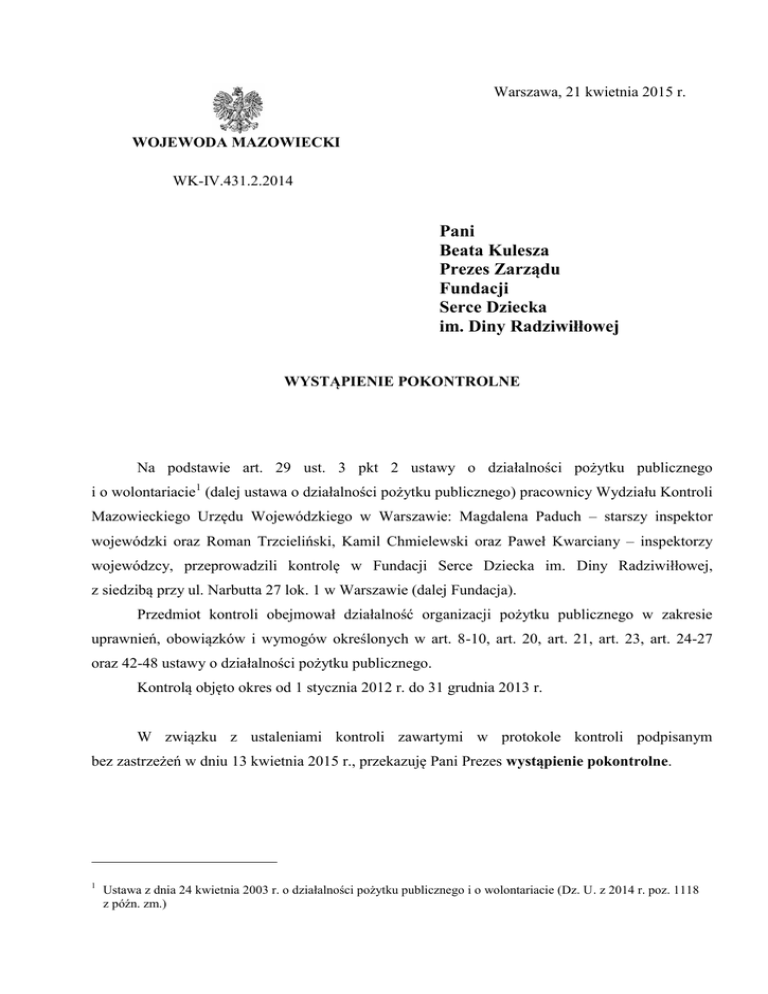 Warszawa, 21 kwietnia 2015 r. WOJEWODA MAZOWIECKI WK-IV.431.2.2014 Pani Beata Kulesza Prezes Zarządu Fundacji Serce Dziecka im. Diny Radziwiłłowej WYSTĄPIENIE POKONTROLNE Na podstawie art. 29 ust. 3 pkt 2 ustawy o działalności pożytku publicznego i o wolontariacie1 (dalej ustawa o działalności pożytku publicznego) pracownicy Wydziału Kontroli Mazowieckiego Urzędu Wojewódzkiego w Warszawie: Magdalena Paduch – starszy inspektor wojewódzki oraz Roman Trzcieliński, Kamil Chmielewski oraz Paweł Kwarciany – inspektorzy wojewódzcy, przeprowadzili kontrolę w Fundacji Serce Dziecka im. Diny Radziwiłłowej, z siedzibą przy ul. Narbutta 27 lok. 1 w Warszawie (dalej Fundacja). Przedmiot kontroli obejmował działalność organizacji pożytku publicznego w zakresie uprawnień, obowiązków i wymogów określonych w art. 8-10, art. 20, art. 21, art. 23, art. 24-27 oraz 42-48 ustawy o działalności pożytku publicznego. Kontrolą objęto okres od 1 stycznia 2012 r. do 31 grudnia 2013 r. W związku z ustaleniami kontroli zawartymi w protokole kontroli podpisanym bez zastrzeżeń w dniu 13 kwietnia 2015 r., przekazuję Pani Prezes wystąpienie pokontrolne. 1 Ustawa z dnia 24 kwietnia 2003 r. o działalności pożytku publicznego i o wolontariacie (Dz. U. z 2014 r. poz. 1118 z późn. zm.) I. Zakres prowadzonej działalności pożytku publicznego Zgodnie z § 8 ust. 4 statutu Fundacji w okresie objętym kontrolą organizacja mogła prowadzić nieodpłatną działalność pożytku publicznego. Zakres działalności nieodpłatnej pożytku publicznego został określony w statucie Fundacji, zgodnie z wymogiem art. 10 ust. 3 ustawy o działalności pożytku publicznego. Na podstawie dowodów finansowo–księgowych oraz informacji wskazanych w sprawozdaniach merytorycznych dotyczących działalności organizacji ustalono, że Fundacja w okresie objętym kontrolą nie prowadziła działalności odpłatnej pożytku publicznego. W zakresie prowadzonej działalności pożytku publicznego nie stwierdzono, aby działalność ta stanowiła działalność odpłatną w rozumieniu art. 8 ust. 1 ustawy o działalności pożytku publicznego. Prowadzona działalność statutowa należała do sfery zadań publicznych określonych w art. 4 ust. 1 pkt 1 i 6 ustawy o działalności pożytku publicznego i obejmowała w szczególności zadania z zakresu pomocy społecznej, w tym pomocy rodzinom i osobom w trudnej sytuacji życiowej oraz wyrównywanie szans tych rodzin i osób oraz ochrony i promocji zdrowia. Działalność nieodpłatna pożytku publicznego prowadzona była przez Fundację na rzecz określonej grupy społecznej wyodrębnionej ze względu na szczególnie trudną sytuację życiową (dzieci z chorobami serca), zgodnie z dyspozycją określoną w art. 20 ust. 1 pkt 1 ustawy o działalności pożytku publicznego. II. Działalność gospodarcza prowadzona przez Fundację Zgodnie z § 38 ust. 1 w związku z § 39 statutu Fundacja mogła prowadzić działalność gospodarczą, z której dochód przeznaczany był na realizację celów statutowych. Fundacja prowadziła działalność gospodarczą w zakresie sprzedaży książek, gazet o tematyce zdrowotnej, działalności wydawniczej i poligraficznej, doradztwa oraz reklamy itp. Przychód z prowadzonej działalności gospodarczej w latach 2012–2013 stanowił odpowiednio 0,1% oraz 0,08% wszystkich przychodów z działalności Fundacji w danym roku kalendarzowym – zatem prowadzona działalność gospodarcza, zgodnie z art. 20 ust. 1 pkt 2 ustawy o działalności pożytku publicznego, miała charakter działalności dodatkowej w stosunku do prowadzonej działalności pożytku publicznego. 2 III. Spełnienie wymogów dotyczących działalności organizacji pożytku publicznego Sposób wykorzystania nadwyżki przychodów nad kosztami Zgodnie z § 8 ust. 5 w związku z § 38 ust. 2 statutu dochód z działalności Fundacji (nadwyżka przychodów nad kosztami) każdorazowo przeznaczany jest na działalność pożytku publicznego, zgodnie z wymogiem określonym w art. 20 ust. 1 pkt 3 ustawy o działalności pożytku publicznego. Spełnienie przez członków organu zarządzającego oraz członków organu kontroli wymogów dotyczących pełnionych funkcji Organem kierującym i reprezentującym Fundację jest Zarząd Fundacji. Zgodnie z § 30 w związku z § 36 statutu Fundacji w jednostce kontrolowanej funkcjonuje Komisja Rewizyjna, jako statutowy kolegialny organ nadzoru, odrębny od organu zarządzającego i niepodlegający mu w zakresie wykonywania kontroli. Komisja Rewizyjna przynajmniej raz w roku przeprowadza kontrolę statutową i finansową działalności Fundacji oraz przedkłada do wiadomości Radzie Fundacji zatwierdzone sprawozdanie finansowe i merytoryczne z jej działalności za poprzedni rok obrotowy. Funkcjonowanie niezależnego organu nadzoru wypełnia wymóg określony w art. 20 ust. 1 pkt 4 ustawy o działalności pożytku publicznego. Żadna z osób będących członkiem Zarządu oraz Rady Fundacji nie znajdowała się w ewidencji Krajowego Rejestru Karnego, spełniając tym samym wymóg niekaralności, o którym mowa w art. 20 ust. 1 pkt 4 lit. b oraz pkt 5 ww. ustawy. Zgodnie ze złożonymi oświadczeniami osoby wchodzące w skład Komisji Rewizyjnej nie pozostawały w stosunku małżeństwa, pokrewieństwa, powinowactwa lub podległości służbowej z osobami będącymi członkami Zarządu Fundacji. Nie stwierdzono naruszenia, określonego art. 20 ust. 1 pkt 4 lit. a ustawy o działalności pożytku publicznego, zakazu powiązań pomiędzy członkami organu nadzoru a członkami organu zarządzającego. Członkowie Komisji Rewizyjnej nie pobierali wynagrodzenia za pracę w Komisji oraz nie otrzymywali zwrotu uzasadnionych kosztów związanych z pełnioną funkcją. Wszyscy członkowie ujawnieni w KRS, w okresie objętym kontrolą brali udział w pracach organu. Stwierdzono, że statut Fundacji zawierał zapisy, o których mowa w a