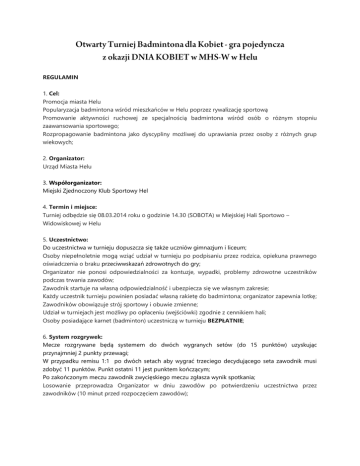 REGULAMIN 1. Cel: Promocja miasta Helu Popularyzacja badmintona wśród mieszkańców w Helu poprzez rywalizację sportową Promowanie aktywności ruchowej ze specjalnością badmintona wśród osób o różnym stopniu zaawansowania sportowego; Rozpropagowanie badmintona jako dyscypliny możliwej do uprawiania przez osoby z różnych grup wiekowych; 2. Organizator: Urząd Miasta Helu 3. Współorganizator: Miejski Zjednoczony Klub Sportowy Hel 4. Termin i miejsce: Turniej odbędzie się 08.03.2014 roku o godzinie 14.30 (SOBOTA) w Miejskiej Hali Sportowo – Widowiskowej w Helu 5. Uczestnictwo: Do uczestnictwa w turnieju dopuszcza się także uczniów gimnazjum i liceum; Osoby niepełnoletnie mogą wziąć udział w turnieju po podpisaniu przez rodzica, opiekuna prawnego oświadczenia o braku przeciwwskazań zdrowotnych do gry; Organizator nie ponosi odpowiedzialności za kontuzje, wypadki, problemy zdrowotne uczestników podczas trwania zawodów; Zawodnik startuje na własną odpowiedzialność i ubezpiecza się we własnym zakresie; Każdy uczestnik turnieju powinien posiadać własną rakietę do badmintona; organizator zapewnia lotkę; Zawodników obowiązuje strój sportowy i obuwie zmienne; Udział w turniejach jest możliwy po opłaceniu (wejściówki) zgodnie z cennikiem hali; Osoby posiadające karnet (badminton) uczestniczą w turnieju BEZPŁATNIE; 6. System rozgrywek: Mecze rozgrywane będą systemem do dwóch wygranych setów (do 15 punktów) uzyskując przynajmniej 2 punkty przewagi; W przypadku remisu 1:1 po dwóch setach aby wygrać trzeciego decydującego seta zawodnik musi zdobyć 11 punktów. Punkt ostatni 11 jest punktem kończącym; Po zakończonym meczu zawodnik zwycięskiego meczu zgłasza wynik spotkania; Losowanie przeprowadza Organizator w dniu zawodów po potwierdzeniu uczestnictwa przez zawodników (10 minut przed rozpoczęciem zawodów); 7. Punktacja Zawodnik wygrywający mecz 2:0 otrzymuje 3 pkt Zawodnik przegrywający mecz 0:2 otrzymuje 0 pkt Zawodnik wygrywający mecz 2:1 otrzymuje 2 pkt Zawodnik przegrywający mecz 1:2 otrzymuje 1 pkt O kolejności zajętych miejsc decyduje suma wszystkich punktów zdobyta w turnieju. 8. Sędziowie: Organizator nie przewiduje wystawienia sędziów lotkowych, serwisowych i liniowych, za przebieg każdego meczu odpowiedzialny będzie w całości organizator prowadzący zawody; 9. Nagrody: W zależności od pozyskania sponsora możliwe są dodatkowe nagrody rzeczowe; Za zajęcie I miejsca organizator przewiduje (puchar, medal, dyplom) Za zajęcie II, III miejsca organizator przewiduje (medal i dyplom) Za pozostałe miejsca organizator przewiduje dyplomy uczestnictwa 10. Zapisy: Zgłoszenia imienne przyjmuje Norbert Górski do dnia 06 marca 2014r w dwóch formach: telefonicznie kom.: 694-533-389 mailowo: [email protected] W zgłoszeniu należy podać imię i nazwisko, numer telefonu; Uczestnicy są zobowiązani potwierdzić swój udział na 10 minut przed rozpoczęciem turnieju; 11. Postanowienia organizacyjne: Każdy zawodnik zobowiązany jest do zapoznania się i przestrzegania regulaminu pod groźbą dyskwalifikacji; Przed meczem każda para ma prawo do 2 minutowej rozgrzewki; Za rzeczy zgubione podczas zawodów organizator nie odpowiada; Organizator zastrzega sobie prawo do ostatecznej interpretacji regulaminu i zasad gry; Organizator zastrzega sobie prawo do korzystania ze zdjęć z wizerunkiem uczestników zawodów w celach promocyjno – marketingowych;