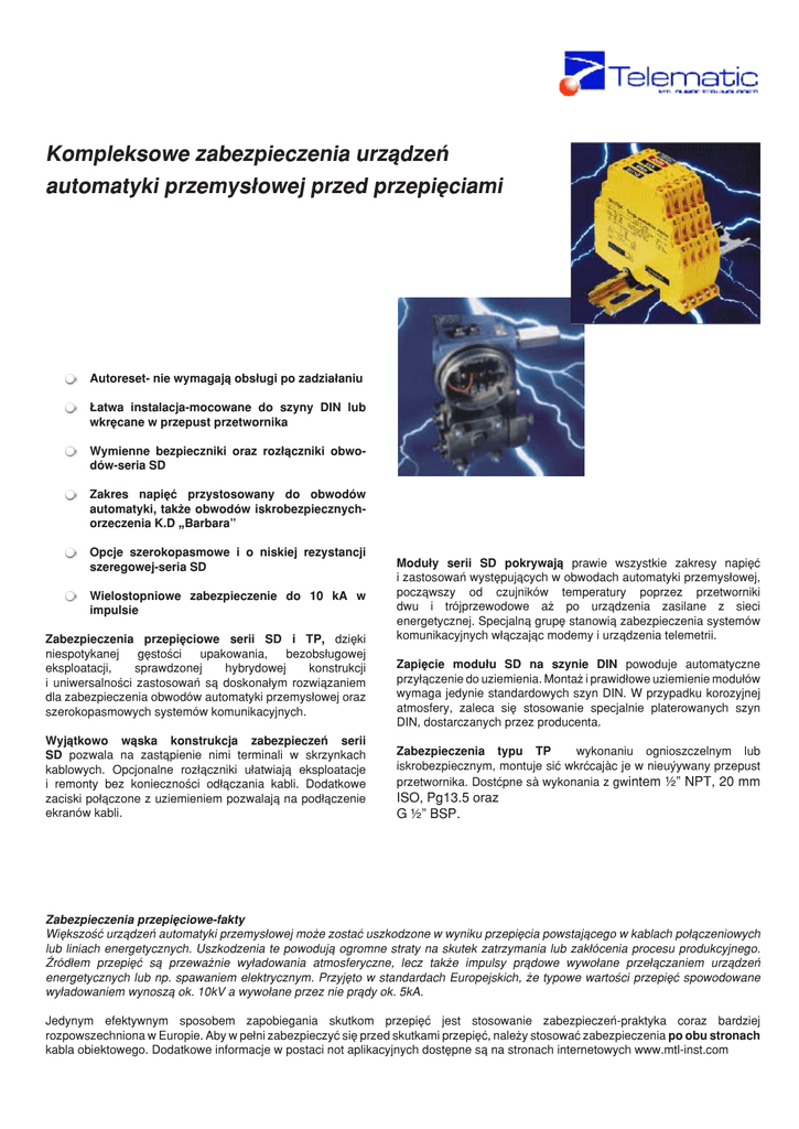 Kompleksowe zabezpieczenia urządzeń automatyki przemysłowej przed przepięciami Autoreset- nie wymagają obsługi po zadziałaniu Łatwa instalacja-mocowane do szyny DIN lub wkręcane w przepust przetwornika Wymienne bezpieczniki oraz rozłączniki obwodów-seria SD Zakres napięć przystosowany do obwodów automatyki, także obwodów iskrobezpiecznychorzeczenia K.D „Barbara” Opcje szerokopasmowe i o niskiej rezystancji szeregowej-seria SD Wielostopniowe zabezpieczenie do 10 kA w impulsie Zabezpieczenia przepięciowe serii SD i TP, dzięki niespotykanej gęstości upakowania, bezobsługowej eksploatacji, sprawdzonej hybrydowej konstrukcji i uniwersalności zastosowań są doskonałym rozwiązaniem dla zabezpieczenia obwodów automatyki przemysłowej oraz szerokopasmowych systemów komunikacyjnych. Wyjątkowo wąska konstrukcja zabezpieczeń serii SD pozwala na zastąpienie nimi terminali w skrzynkach kablowych. Opcjonalne rozłączniki ułatwiają eksploatacje i remonty bez konieczności odłączania kabli. Dodatkowe zaciski połączone z uziemieniem pozwalają na podłączenie ekranów kabli. Moduły serii SD pokrywają prawie wszystkie zakresy napięć i zastosowań występujących w obwodach automatyki przemysłowej, począwszy od czujników temperatury poprzez przetworniki dwu i trójprzewodowe aż po urządzenia zasilane z sieci energetycznej. Specjalną grupę stanowią zabezpieczenia systemów komunikacyjnych włączając modemy i urządzenia telemetrii. Zapięcie modułu SD na szynie DIN powoduje automatyczne przyłączenie do uziemienia. Montaż i prawidłowe uziemienie modułów wymaga jedynie standardowych szyn DIN. W przypadku korozyjnej atmosfery, zaleca się stosowanie specjalnie platerowanych szyn DIN, dostarczanych przez producenta. Zabezpieczenia typu TP wykonaniu ognioszczelnym lub iskrobezpiecznym, montuje sić wkrćcajŕc je w nieuýywany przepust przetwornika. Dostćpne sŕ wykonania z gwintem ˝” NPT, 20 mm ISO, Pg13.5 oraz G ˝” BSP. Zabezpieczenia przepięciowe-fakty Większość urządzeń automatyki przemysłowej może zostać uszkodzone w wyniku przepięcia powstającego w kablach połączeniowych lub liniach energetycznych. Uszkodzenia te powodują ogromne straty na skutek zatrzymania lub zakłócenia procesu produkcyjnego. Źródłem przepięć są przeważnie wyładowania atmosferyczne, lecz także impulsy prądowe wywołane przełączaniem urządzeń energetycznych lub np. spawaniem elektrycznym. Przyjęto w standardach Europejskich, że typowe wartości przepięć spowodowane wyładowaniem wynoszą ok. 10kV a wywołane przez nie prądy ok. 5kA. Jedynym efektywnym sposobem zapobiegania skutkom przepięć jest stosowanie zabezpieczeń-praktyka coraz bardziej rozpowszechniona w Europie. Aby w pełni zabezpieczyć się przed skutkami przepięć, należy stosować zabezpieczenia po obu stronach kabla obiektowego. Dodatkowe informacje w postaci not aplikacyjnych dostępne są na stronach internetowych www.mtl-inst.com Typowe zastosowania zabezpieczeń serii SD Seria SD pokrywa większość potrzeb na zabezpieczenia przepięciowe w obwodach automatyki przemysłowej aż do napięć 250V. Możliwość łatwego rozłączania obwodów poprzez wymienny bezpiecznik lub odłącznik ułatwia wszelkie prace konserwacyjne i remontowe obwodów obiektowych. Zalety wymiennych bezpieczników uwidaczniają się zwłaszcza w przypadku zasilania szeregu urządzeń obiektowych z jednego źródła napięcia. Awaria jednego z urządzeń nie powoduje zakłóceń w zasilaniu pozostałych. Wersja zabezpieczeń obwodów iskrobezpiecznych, oznaczona X nie posiada wymiennych bezpieczników i odłączników z uwagi na wymagania norm iskrobezpieczeństwa. Sekcja ta przedstawia typowe zastosowania zabezpieczeń serii SD w obwodach automatyki przemysłowej. Uwaga: zabezpieczenia należy stosować po obu stronach kabla łączącego urządzenie obiektowe i sterujące Wejścia Analogowe-AI np. rzetworniki dwuprzewodowe, konwencjonalne oraz z HART Zabezpieczenia zalecane dla tych zastosowań to SD32 lub SD55 w zależności od napięć zasilających przetwornik. Dla obwodów iskrobezpiecznych należy stosować zabezpieczenia SD32X lub SD55X, które nie posiadają opcji wymiennych bezpieczników czy odłączników. Analogowe wyjścia przetworniki I/P –AO, np. Dla tych zastosowań rekomenduje się SD16, SD32 lub SD55 w zależności od napięcia w linii. Obwody iskrobezpieczne wymagają stosowania zabezpieczeń z końcówką X. Wejścia dwustanowe-DI np. styki oraz czujniki zbliżeniowe Dla tych zastosowań rekomenduje się SD07, SD16, SD32 lub SD55 w zależności od napięcia w linii. Obwody iskrobezpieczne wymagają stosowania zabezpieczeń z końcówką X. Wyjścia dwustanowe-DO np. lampy, syrenki, zawory indukcyjne Czujniki temperatury RTD i THC Dla tych zastosowań rekomenduje się SD32 lub SD32X dla obwodów iskrobezpiecznych. Dla tego zastosowania należy użyć zabezpieczeń SD RTD. Telefonia i Telemetria (PSTN) Moduł SD PSTN został specjalnie zaprojektowany do zastosowań w telemetrii i telefonii. Niskonapięciowe czujniki mV, przepływomierze, źródła milivoltowe Dla tego typu urządzeń odpowiednimi będą zabezpieczenia Typu SD07 lub SD16 lub w przypadku obwodów iskrobezpiecznych SD07X i SD16X. Zasilanie napięciem sieciowym, np. zawory lub silniki Zalecanym modułem jest tu SD275X Zabezpieczanie przetworników standardowych i z HART Zabezpieczanie szerokopasmowych magistrali komunikacyjnych Przetworniki i czujniki są szeroko stosowane na obiektach, gdzie zagrożenie uszkodzeniem na skutek przepięcia jest szczególnie wysokie. Zalecanym rozwiązaniem jest zabezpieczenie przepięciowe typu TP w wersji iskrobezpiecznej lub ognioszczelnej, które można wkręcić do nie używanego przepustu kablowego przetwornika. Zabezpieczenie TP posiada atesty urządzenia o budowie przeciwwybuchowej w tym i KD „Barbara”. Dostępne jest z gwintami ˝” NPT; 20 mm ISO; Pg 13,5 oraz 