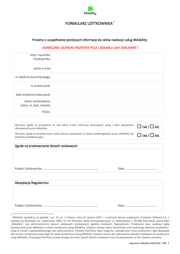 FORMULARZ UŻYTKOWNIKA * Prosimy o uzupełnienie poniższych informacji do celów realizacji usług 4Mobility: [ KONIECZNIE UZUPEŁNIJ WSZYSTKIE POLA I ZESKANUJ CAŁY DOKUMENT ] imię i nazwisko Użytkownika adres e-mail nr telefonu komórkowego nr prawa jazdy data wydania prawa jazdy adres zamieszkania (ulica, nr, kod, miasto) PESEL Wyrażam zgodę na przesyłanie na mój adres e-mail informacji dotyczących usług i ofert specjalnych oferowanych przez 4Mobility: TAK / NIE Wyrażam zgodę na przetwarzanie moich danych osobowych w celach marketingowych przez 4Mobility lub podmioty współpracujące: TAK / NIE Zgoda na przetwarzanie danych osobowych: Podpis Użytkownika: …………..…………………………………………..……… Data: ………………………………….. Akceptacja Regulaminu: Podpis Użytkownika: …………..………………………………………..………… Data: ………………………………….. * 4Mobility oświadcza, że zgodnie z art. 23 ust. 1 Ustawy z dnia 29 sierpnia 1997 r. o ochronie danych osobowych, E-Solution Software S.A. z siedzibą we Wrocławiu (ul. Kobierzycka 20BA, 51-315 Wrocław, adres korespondencyjny: ul. Mokotowska 1, 00-640 Warszawa) zwana dalej „4Mobility”, jest administratorem danych osobowych przekazanych zgodnie niniejszym Regulaminem. Przekazane dane osobowe będą przetwarzane przez 4Mobility w celach świadczenia usług 4Mobility, zawarcia umowy najmu Samochodu oraz marketingu własnych produktów i usług w ramach usprawiedliwionego celu administratora. Ponadto Pani/Pana dane mogą być udostępniane innym podmiotom, gdy obowiązek taki wynika z przepisów prawa bądź do celów świadczenia Usług 4Mobility. Podanie danych jest dobrowolne jednakże niezbędne do świadczenia usług 4Mobility. Przysługuje Pani/Panu prawo dostępu do treści swoich danych osobowych oraz ich poprawiania, w tym również usunięcia. Regulamin 4Mobility 28072016 | str. 1 Regulamin korzystania z usług 4Mobility (dalej: „Regulamin”) §1 Niniejszy Regulamin określa zasady świadczenia na rzecz Klientów usług 4Mobility przez E-Solution Software S.A., spółka akcyjna, z siedzibą we Wrocławiu (ul. Kobierzycka 20BA, 51 - 315 Wrocław; adres korespondencyjny: ul. Mokotowska 1, 00-640 Warszawa), Polska, wpisaną do Rejestru Przedsiębiorców prowadzonego przez Sąd Rejonowy dla Wrocławia-Fabrycznej we Wrocławiu, VI Wydział Gospodarczy Krajowego Rejestru Sądowego pod numerem 0000562846, o numerze REGON: 020920021 oraz NIP: 8971756182, z kapitałem zakładowym w wysokości 140.000,00 zł (dalej: 4Mobility). Świadczenie usług 4Mobility polega na najmie samochodów lub dostępie do systemu rezerwacyjnego 4Mobility. §2 Definicje Użyte w niniejszym Regulaminie pojęcia oznaczają: 1. Klient – przedsiębiorca lub inny podmiot publiczny lub samorządowy, który zawarł z 4Mobility odrębną umowę generalną o świadczenie usług 4Mobility, wyłącznie w celu prowadzonej przez siebie działalności gospodarczej i w tym celu korzysta z usług 4Mobility w zakresie przewidzianym dla pracowników lub innych osób upoważnionych przez Klienta w tej umowie. 2. Użytkownik - osoba fizyczna: a) upoważniona przez Klienta do korzystania z usług 4Mobility w celach prowadzonej przez niego działalności gospodarczej, lub b) osoba indywidualna korzystająca z usług 4Mobility dla celów prywatnych. 3. Umowa Generalna – odrębna umowa zawarta pomiędzy Klientem a 4Mobility, której przedmiotem jest świadczenie na rzecz Klienta usługi najmu samochodów do celów prowadzonej przez niego działalności gospodarczej. Wraz z niniejszym Regulaminem i Cennikiem stanowi całość stosunków prawnych pomiędzy Klientem a 4Mobility w zakresie świadczenia usług 4Mobility. 4. Regulamin – niniejszy regulamin przekazany lub zamieszczony na stronie www.4mobility.pl stanowiący wraz z Cennikiem: (a) integralną część Umowy Generalnej jeśli została zawarta albo (b) samodzielną i wyłączną podstawę świadczenia usług 4Mobility w tym dla celów prywatnych Użytkownika. 5. Cennik – oznacza cennik znajdujący się na stronie www.4mobility.pl chyba, że stanowi załącznik do Regulaminu. Cennik i Regulamin stanowią wyłączną podstawę do obliczania wynagrodzenia (opłat) 4Mobility za świadczone usługi lub wynikające z nieprzestrzegania przez Klienta lub Użytkowników obowiązków wynikających z Umowy Generalnej i/lub Regulaminu. 6. Usługi 4Mobility – najem samochodów lub dostęp do systemu rezerwacyjnego 4Mobility dla Klientów lub Użytkowników świadczony odpowiednio do celów prowadzonej przez nich działalności gospodarczej lub do ich celów prywatnych. Podział Usług 4Mobility ze względu na sposób użytkowania: 6.1. 4Business – Usługi 4Mobility przeznaczone do celów prowadzonej przez Klienta działalności gospodarczej dostępne w następujących wariantach: a) 4Mobility car sharing - oznaczająca umożliwienie korzystania w sposób zorganizowany i współdzielony z samochodów 4Mobility znajdujących się w określonych lokalizacjach, w ramach umowy najmu b) 4Mobility auto na wyłączność - oznaczająca udostępnienie Klientowi Samochodu do jego wyłącznego korzystania w ramach umowy najmu na okresy miesięczne na warunkach określonych w Umowie Generalnej zawartej indywidualnie z Klientem. 6.2. 4Private – Usługa 4Mobility polegająca na najmie Samochodów Użytkownikom na ich koszt oraz do ich celów prywatnych. Podział Usług 4Mobility ze względu na czas użytkowania: 6.3. 4Minutes – usługi najmu Samochodów na okresy mierzone w minutach lub godzinach, w dni robocze, dostępne w przedziałach czasowych określonych w Cenniku 6.4. 4Days – usługi najmu Samochodów dostępne poza godzinami pracy realizowane w dwóch wariantach: a) Auto na wieczór – usługi dostępne w dni robocze i w godzinach określonych w Cenniku. b) Auto na weekend – usługi dostępne w weekendy i dni wolne od 
