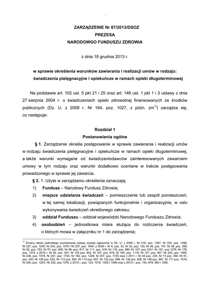 . ZARZĄDZENIE Nr 87/2013/DSOZ PREZESA NARODOWGO FUNDUSZU ZDROWIA z dnia 18 grudnia 2013 r. w sprawie określenia warunków zawierania i realizacji umów w rodzaju: świadczenia pielęgnacyjne i opiekuńcze w ramach opieki długoterminowej Na podstawie art. 102 ust. 5 pkt 21 i 25 oraz art. 146 ust. 1 pkt 1 i 3 ustawy z dnia 27 sierpnia 2004 r. o świadczeniach opieki zdrowotnej finansowanych ze środków publicznych (Dz. U. z 2008 r. Nr 164, poz. 1027, z późn. zm1)) zarządza się, co następuje: Rozdział 1 Postanowienia ogólne § 1. Zarządzenie określa postępowanie w sprawie zawierania i realizacji umów w rodzaju świadczenia pielęgnacyjne i opiekuńcze w ramach opieki długoterminowej, a także warunki wymagane od świadczeniodawców zainteresowanych zawarciem umowy w tym rodzaju oraz warunki dodatkowo oceniane w trakcie postępowania prowadzonego w sprawie jej zawarcia. § 2. 1. Użyte w zarządzeniu określenia oznaczają: 1) Fundusz – Narodowy Fundusz Zdrowia; 2) miejsce udzielania świadczeń – pomieszczenie lub zespół pomieszczeń, w tej samej lokalizacji, powiązanych funkcjonalnie i organizacyjnie, w celu wykonywania świadczeń określonego zakresu; 3) oddział Funduszu – oddział wojewódzki Narodowego Funduszu Zdrowia; 4) osobodzień – jednostkowa miara służąca do rozliczenia świadczeń, o których mowa w załączniku nr 1 do zarządzenia; 1) Zmiany tekstu jednolitego wymienionej ustawy zostały ogłoszone w Dz. U. z 2008 r. Nr 216, poz. 1367, Nr 225, poz. 1486, Nr 227, poz. 1505, Nr 234, poz. 1570 i Nr 237, poz. 1654 ,z 2009 r. Nr 6, poz. 33, Nr 22, poz. 120, Nr 26, poz. 157, Nr 38, poz. 299, Nr 92, poz. 753, Nr 97, poz. 800, Nr 98, poz. 817, Nr 111, poz. 918, Nr 118, poz. 989, Nr 157, poz.1241, Nr 161, poz.1278, Nr 178, poz. 1374, z 2010 r. Nr 50, poz. 301, Nr 125 poz. 842, Nr 107, poz. 679, Nr 165, poz. 1116, Nr 127, poz. 857, Nr 225, poz. 1465, Nr 238, poz. 1578, Nr 257, poz. 1723, Nr 182, poz. 1228. Nr 257, poz. 1725 oraz z 2011 r. Nr 45 poz. 235, Nr 73 poz. 390, Nr 81, poz. 440, Nr 106 poz. 622, Nr 112 poz. 654, Nr 113 poz. 657, Nr 122 poz. 696, Nr 138 poz. 808, Nr 149 poz. 887, Nr 171 poz. 1016, Nr 205, poz. 1203 i Nr 232, poz.1378, z 2012 r. poz. 123, 1016, 1342 i 1548 oraz z 2013 r. poz. 154, 879, 983 i 1290. 5) przepustka – okresowe przebywanie świadczeniobiorcy poza zakładem opiekuńczym, bez potrzeby wypisywania go z zakładu; 6) rozporządzenie – rozporządzenie Ministra Zdrowia z dnia 22 listopada 2013 r. w sprawie pielęgnacyjnych świadczeń i opiekuńczych gwarantowanych w ramach z zakresu opieki świadczeń długoterminowej (Dz.U. poz. 1480); 7) skala Barthel – skala oceny poziomu samodzielności świadczeniobiorcy, o której mowa § 5 ust. 1 rozporządzenia, określona w załączniku nr 2, stanowiącym wzór karty oceny świadczeniobiorcy kierowanego do zakładu opiekuńczego/przebywającego w zakładzie opiekuńczym; 8) świadczenie wykonywane w warunkach domowych – świadczenie gwarantowane, o którym mowa w § 6 rozporządzenia, udzielane w miejscu zamieszkania lub czasowego pobytu świadczeniobiorcy; w tym, w przypadku pielęgniarskiej opieki długoterminowej domowej, także w domach pomocy społecznej; 9) ustawa – ustawę z dnia 27 sierpnia 2004 r. o świadczeniach opieki zdrowotnej finansowanych ze środków publicznych. 2. Określenia inne niż wymienione w ust. 1, użyte w zarządzeniu, mają znaczenie nadane im w przepisach odrębnych, w tym w szczególności w rozporządzeniu Ministra Zdrowia z dnia 6 maja 2008 r. w sprawie ogólnych warunków umów o udzielanie świadczeń opieki zdrowotnej (Dz. U. Nr 81, poz. 484) oraz w rozporządzeniu. Rozdział 2 Cel postępowania i przedmiot umowy § 3. Celem postępowania, o którym mowa w § 1 jest wyłonienie podmiotów, które będą udzielały świadczeń pielęgnacyjnych i opiekuńczych w ramach opieki długoterminowej. § 4. 1. Przedmiot umowy o udzielanie świadczeń opieki zdrowotnej, o których mowa w§ 3, stanowi w rozporządzeniu, realizacja udzielanych świadczeń gwarantowanych, świadczeniobiorcom przez o których mowa świadczeniodawcę w warunkach stacjonarnych lub domowych, w zakresach określonych w załączniku nr 1 do zarządzenia, finansowanych przez Fundusz. 2. Odpowiednio do przedmiotu umowy, jednostki rozliczeniowe dla poszczególnych zakresów świadczeń, określone są w załączniku nr 1 do zarządzenia. 2 3. Wzór umowy o udzielanie świadczeń, o której mowa w ust. 1, stanowi załącznik nr 2 do zarządzenia. 4. Odstępstwa od wzoru umowy wymagają pisemnej zgody Prezesa Funduszu. § 5. Świadczeniodawca biorący udział w postępowaniu w sprawie zawarcia umowy, o której mowa w § 4, obowiązany jest spełniać wymagania określone w załączniku nr 3 do zarządzenia oraz przepisach odrębnych. § 6. Zgodnie ze Wspólnym Słownikiem Zamówień, określonym w rozporządzeniu WE nr 2195/2002 Parlamentu Europejskiego i Rady z dnia 5 listopada 2002 r. w sprawie Wspólnego Słownika Zamówień (CPV) - (Dz. Urz. WE L 340 z 16.12.2002, str. 1 i n., z późn. zm.2)) oraz zgodnie z art. 141 ust. 4 ustawy, przedmiotem umów objęte są następujące nazwy i kody: 1) 85110000-3 – Usługi szpitalne i podobne; 2) 85141210-4 – Usługi leczenia medycznego świadczone w warunkach domowych; 3) 85144000-0 – Usługi placówek opieki zdrowotnej zapewniających zakwaterowanie; 4) 85141200-1 – Usługi świadczone przez pielęgniarki. Rozdział 3 Zasady postępowania oraz wymagania wobec świadczeniodawców § 7. 1. Świadczenia w poszczególnych zakresach mogą być udzielane przez świadczeniodawcę z udziałem podwykonawców udzielających świadczeń na zlecenie świadczeniodawcy, wymienionych w „Wykazie podwykonawców”, stanowiącym załącznik nr 3 do umowy. 2. Świadczenia mogą być udzielane wyłącznie przez podwykonawcę spełniającego warunki określone w niniejszym zarządzeniu oraz przepisach odrębnych. 3. Umowa zawarta pomiędzy świad