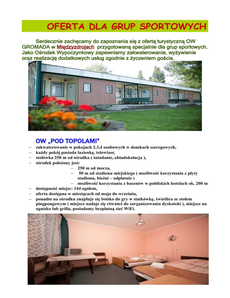 OFERTA DLA GRUP SPORTOWYCH Serdecznie zachęcamy do zapoznania się z ofertą turystyczną OW GROMADA w Międzyzdrojach przygotowaną specjalnie dla grup sportowych. Jako Ośrodek Wypoczynkowy zapewniamy zakwaterowanie, wyżywienie oraz realizację dodatkowych usług zgodnie z życzeniem gościa. − − − − OW „POD TOPOLAMI” zakwaterowanie w pokojach 2,3,4 osobowych w domkach szeregowych, każdy pokój posiada łazienkę, telewizor, stołówka 250 m od ośrodka ( śniadanie, obiadokolacja ), ośrodek położony jest: − 250 m od morza, − 50 m od stadionu miejskiego ( możliwość korzystania z płyty stadionu, bieżni – odpłatnie ) − możliwość korzystania z basenów w pobliskich hotelach ok. 200 m − dostępność miejsc: 144 ogółem, − oferta dostępna w miesiącach od maja do września, − ponadto na ośrodku znajduje się boisko do gry w siatkówkę, świetlica ze stołem pingpongowym ( miejsce nadaje się również do zorganizowania dyskoteki ), miejsce na ognisko lub grilla, posiadamy bezpłatną sieć WiFi. Międzyzdroje stanowią idealne miejsce dla osób chcących spędzić aktywny wypoczynek. Dzięki powiększającej się bazie sportowo – rekreacyjnej, do czego możemy zaliczyć powstanie nowej hali sportowej przystosowanej do przeprowadzania treningów, zawodów oraz licznym trasom biegowym, Międzyzdroje stanowią doskonałą ofertę dla obozów sportowych. Poniżej przedstawiamy cennik: MIESIĄC MAJ CZERWIEC LIPIEC (01.07.-17.08.) SIERPIEŃ (18.08.-31.08.) WRZESIEŃ CENA NOCLEGU CENA NOCLEGU Z CENA NOCLEGU Z OD 1 OSOBY WYŻYWIENIEM 3 WYŻYWIENIEM 3 POSIŁKI ( 9-18 LAT ) POSIŁKI - DOROŚLI 30.00 40.00 52.00 40.00 30.00 65.00 75.00 87.00 75.00 65.00 70.00 80.00 92.00 80.00 70.00 Ceny bez prowizji / ceny obowiązują przy pobycie powyżej dwóch noclegów/ na każde 15 osób jedna osoba otrzymuje pobyt gratis:) Będąc w Międzyzdrojach warto zobaczyć i skorzystać z lokalnych atrakcji, jakimi są: − Muzeum Wolińskiego Parku Narodowego − Rezerwat Żubrów na terenie WPN − Wzgórze Gosań – najwyższe wzniesienie polskiego wybrzeża − Kawcza Góra – punkt widokowy − Muzeum Figur Woskowych − Planetarium − Kino „EVA” − Aleja Gwiazd przy Molo − Amfiteatr Proponujemy również pobliskie atrakcje: − Bunkier – Muzeum Broni V-3 – ekspozycja broni niemieckiej − Wzgórze Zielonka - Lubin − Jezioro Turkusowe KONTAKT: ul. Bohaterów Warszawy 2 72-500 Międzyzdroje 91-32-80-779 / 502 456 986 [email protected]