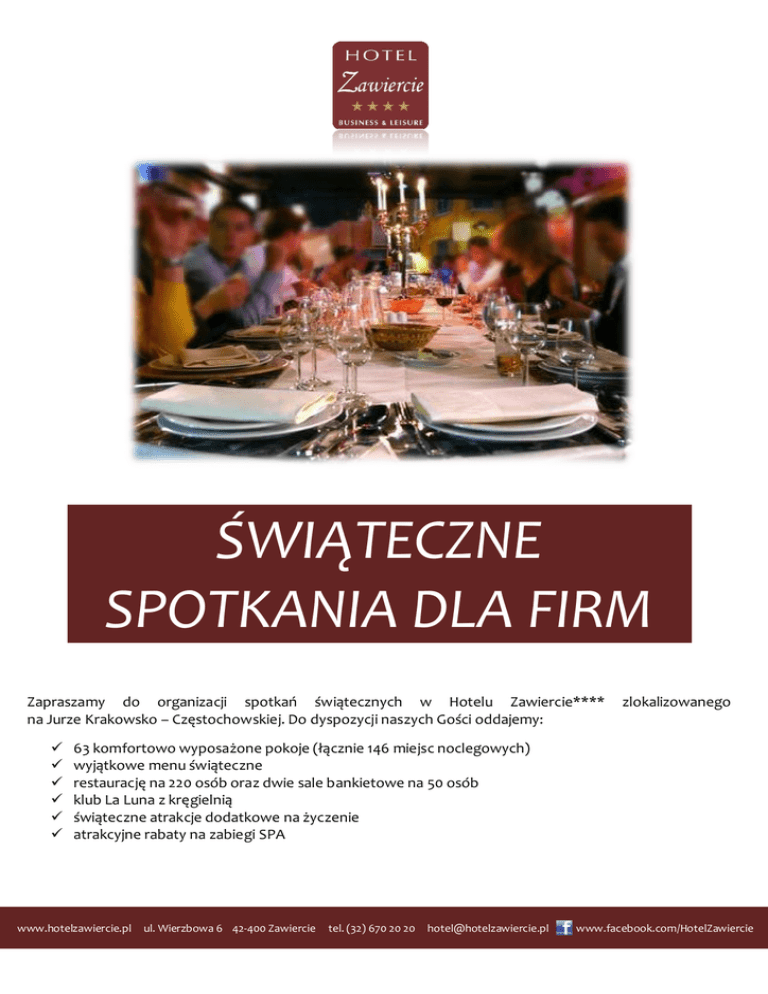ŚWIĄTECZNE SPOTKANIA DLA FIRM Zapraszamy do organizacji spotkań świątecznych w Hotelu Zawiercie**** na Jurze Krakowsko – Częstochowskiej. Do dyspozycji naszych Gości oddajemy: zlokalizowanego 63 komfortowo wyposażone pokoje (łącznie 146 miejsc noclegowych) wyjątkowe menu świąteczne restaurację na 220 osób oraz dwie sale bankietowe na 50 osób klub La Luna z kręgielnią świąteczne atrakcje dodatkowe na życzenie atrakcyjne rabaty na zabiegi SPA www.hotelzawiercie.pl ul. Wierzbowa 6 42-400 Zawiercie tel. (32) 670 20 20 [email protected] www.facebook.com/HotelZawiercie ŚWIĄTECZNA OBIADOKOLACJA ZESTAW I – 50zł/os. Zupa grzybowa z makaronem Tradycyjny karp panierowany podany na łazankach z kapustą i grzybami z sosem kaparowym Świąteczne makówki z chałką i mandarynkami Kompot z suszonych owoców ZESTAW II – 55zł/os. Wigilijny barszcz czerwony z uszkami jarskimi Filet z łososia pieczony na maśle koperkowo – czosnkowym z zapiekanymi ziemniakami i tradycyjną kapustą z grzybami Sernik z gorącym sosem malinowym Kompot z suszonych owoców ZESTAW III – 70zł/os. Tatar z łososia z grzankami podany Zupa z ryb z pulpecikami rybnymi i warzywami Dorsz smażony w sosie porowo - kurkowym na kapuście z grochem Tarta jabłkowa z sosem czekoladowym z aromatem piernika Kompot z suszonych owoców ZESTAW IV – 75zł/os. Filet z łososia marynowany w morskiej soli w aromacie cytrusów Wigilijny krem z kasztanów z borowikami Filet z karpia panierowany w migdałach z ziemniakami i kapustą z grzybami Panna cotta makowa Kompot z suszonych owoców www.hotelzawiercie.pl ul. Wierzbowa 6 42-400 Zawiercie tel. (32) 670 20 20 [email protected] www.facebook.com/HotelZawiercie BUFET ZIMNYCH PRZEKĄSEK PROPOZYCJA I – 50zł/os. PROPOZYCJA II – 70zł/os. Mięsa pieczone na różne sposoby z dipami Mięsa pieczone na różne sposoby z dipami Wędliny Wędliny Pasztety Deska serów Tymbaliki drobiowe Pasztety z żurawiną Polędwiczki wieprzowe z musem brokułowym Tymbaliki drobiowe Galantyna z ryb słodkowodnych z musem kaparowym Golonka w galarecie Chrusty drobiowe z sosem koniakowym Schab pieczony z szparagami w galarecie Śledź w pikantnej salsie Łosoś w galarecie z musem limonkowym Śledź w majonezie z avocado i melonem Roladki szynkowe z musem Sałatka włoska z makaronu pene z serem grana padano Chrust drobiowy z sosem koniakowym Sałatka ryżowa z tuńczykiem i zielonym groszkiem Śledź w oleju marynowany z korniszonami Babeczki na słono z trzema musami Śledź w pikantnej salsie Jajka z musem tatarskim Śledź w paprykach z drobinkami pieprzu zielonego Ćwiartki pomidora w sosie czosnkowym Sałatka z wędzonych udek Pieczywo,masło Sałatka rubinowa z matiasów Sałatka gyros Sałatka z pleśniowym serem na kruchych sałatach Babeczki na słono z różnymi musami Jajka z sosem tatarskim Ćwiartki pomidora w sosie czosnkowym Pieczywo, masło www.hotelzawiercie.pl ul. Wierzbowa 6 42-400 Zawiercie tel. (32) 670 20 20 [email protected] www.facebook.com/HotelZawiercie UROCZYSTA KOLACJA WIGILIJNA PROPOZYCJA I – 79zł/os. PROPOZYCJA II – 99zł/os. Zupa Barszcz czerwony z uszkami Zupa Zupa grzybowa z łazankami II danie Karp panierowany na kapuście z grochem i opiekanymi ziemniakami II danie Łosoś grillowany na plackach z sałatką vingrette Na półmiskach do dania głównego Pierogi ruskie Pierogi z kapustą i grzybami Na półmiskach do dania głównego Pierogi ruskie Pierogi z kapustą i grzybami Deser Panna cotta makowa z mandarynką Deser Makówki Kompot z suszonych owoców (dzbanki) Kompot z suszonych owoców (dzbanki) Napoje gorące (bufet) Kawa/herbata Napoje gorące (bufet) Kawa/herbata Napoje zimne 1l/os. Soki w dzbankach Woda min. w dzbankach Napoje zimne 1l/os. Soki w dzbankach Woda min. w dzbankach Zimna płyta Karp po żydowsku Ryba po grecku Śledzik w śmietanie z cebulką Śledzik w salsie pomidorowej Ryba opiekana w zalewie winno-octowej Łosoś marynowany w białym winie z grzankami Sałatka rubinowa Sałatka jarzynowa Pieczywo, masło Zimna płyta Karp po żydowsku Ryba po grecku Śledzik w śmietanie z cebulką Śledzik w salsie pomidorowej Ryba opiekana w zalewie winno-octowej Łosoś marynowany w białym winie z grzankami Sałatka rubinowa Sałatka jarzynowa Pieczywo, masło www.hotelzawiercie.pl ul. Wierzbowa 6 42-400 Zawiercie tel. (32) 670 20 20 [email protected] www.facebook.com/HotelZawiercie