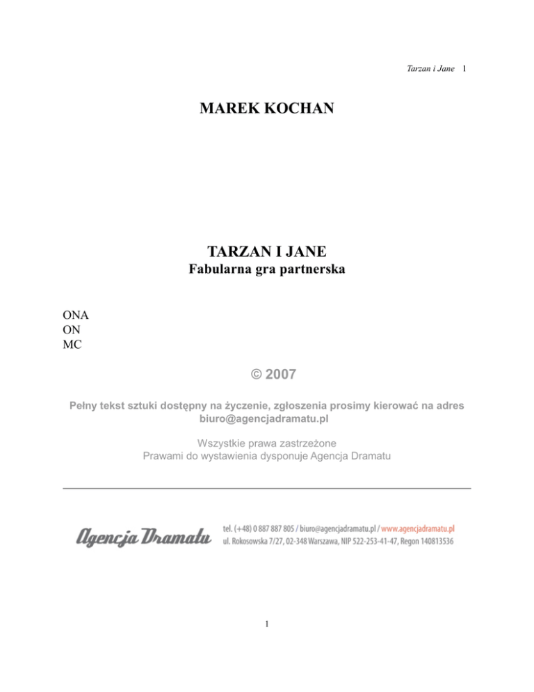 Tarzan i Jane 1 MAREK KOCHAN TARZAN I JANE Fabularna gra partnerska ONA ON MC © 2007 Pełny tekst sztuki dostępny na życzenie, zgłoszenia prosimy kierować na adres [email protected] Wszystkie prawa zastrzeżone Prawami do wystawienia dysponuje Agencja Dramatu 1 Tarzan i Jane 2 I. ON ONA ON ONA ON ONA ON ONA ON ONA ON ONA ON ONA ON Wchodzisz? Wchodzę. Stoimy przed drzwiami. Dlaczego jest ciemno? Ktoś ukradł żarówkę. Wymacaj klamkę. Jest przed tobą. Mam. Jest szorstka. Ciepła. To źle? Myślałam, że będzie gładka i zimna. Tu są wszędzie takie plastikowe klamki. Ładnie pachnie. Kawa. Przed wyjściem robiłem kawę. Masz tu światło? Jeszcze nie zapalajmy. Czego się spodziewasz? Prawie wcale ciebie nie znam. Zapalam światło. II. ONA Jak tu jest? ON Przecież widzisz. ONA Mam jeszcze zamknięte oczy. Opowiedz mi. ON To kawalerka w bloku. A raczej suszarnia przerobiona na kawalerkę. Grzyb na ścianie. Pęknięta szyba. Szafa z niedomykającymi się drzwiami. ONA Widok z okna? ON Bloki, takie same jak ten. Na parapecie dużo starych gazet. Kuchnia we wnęce. Na podłodze materac przykryty kocem w szkocką kratę. ONA Otwieram oczy. ON I co? ONA Jeszcze nie wiem. Pokażesz mi swoje książki? ON Tu nie ma żadnych książek. ONA A gdzie są? Musisz mieć książki. Podobno pracujesz na uczelni. ON Czytam w bibliotece. Tu mam niewiele. Jedno pudło w szafie. ONA Co teraz robimy? MC To zależy od was. ON To zależy od nas. 2 Tarzan i Jane 3 ONA Będziemy rozmawiali, a potem usiądziemy na tym materacu, a potem się na nim położymy, a potem. MC Nie. Nie tym razem. ON Nie. Jeszcze nie teraz. ONA Dlaczego? MC Takie są reguły. ON Usiądź na łóżku. Nie ma krzeseł. Ale mam ekspres do kawy. To jedyna sensowna rzecz w tym mieszkaniu. Chcesz kawy? Kupiłem też wino. ONA Możemy pójść do mnie. Mama wraca dziś późno. ON Nie podoba ci się tu? ONA Podoba. ON Mogłabyś tu mieszkać? ONA To by zależało od ciebie. ON Musiałbym wszystko pozmieniać? Kupić doniczki z kwiatami i kolorowe zasłonki. I dywan z IKEI. ONA Zależy, czy by nam się układało. ON A jak myślisz? ONA Nie wiem. ON Straszny syf, co? ONA Zrób kawę, jeśli chcesz. ON Zostaniesz tu? ONA Jeszcze nie wiem. ON Spotkasz się ze mną jutro? Nie znikniesz? ONA Co z tą kawą? ON Robię. Smakuje ci? ONA Jest naprawdę świetna. Jaka to kawa? ON Najlepsza jaką można dostać. Czekoladowa. ONA Moja mama lubi dobrą herbatę. Ma w szafce ze trzydzieści pudełek. Raz na dwa lata leci do Indii i przywozi sobie zapas. Albo prosi kogoś, żeby jej przywiózł. ON Co robi twoja matka? ONA Zawsze to, co wypada robić na danym etapie życia. ON A ojciec? ONA Inaczej. Chce być zawsze etap wcześniej. Albo dwa. ON Żyje? ONA Mieszka za granicą. Porozmawiajmy o czymś innym. ON O czym? 3 Tarzan i Jane 4 ONA Zaproponuj coś. Jestem twoim gościem. ON Filmy na DVD. Płyty. Luneta. ONA Jakie płyty? ON Zbieram muzykę sakralną z całego świata. Czy wiesz, że w średniowieczu istniała pokrewna tradycja pie... ONA Tak? ON ..śni religijnych w Europie i w Indiach. Mam płytę, która pokazuje głębokie podobieństwa między nimi. Mogę ci zaraz puścić. ONA A luneta? ON Bardzo przybliża. Nocą widać przez nią gwiazdy. ONA Pokaż. ON Ale używam jej do podglądania ludzi. W bloku naprzeciwko jest trzysta mieszkań. Z tej odległości mogę zobaczyć co oglądają w telewizji. ONA Ale nie usłyszysz o czym rozmawiają. ON Przecież to widać. III. ON I co? Śpi? ONA Nie wiem. W każdym razie ma zgaszone światło. ON Zamknij dokładnie drzwi. ONA Zamknęłam. ON Może powinniśmy porozmawiać we trójkę. ONA Raz ci się wydaje, że ona jest małą dziewczynką, a raz myślisz, że jest całkiem dorosła. ON A co ty myślisz? ONA Jest dzieckiem, ale chce, żebyśmy traktowali ją jak dorosłą. ON Ty jej kupiłaś ten biustonosz, czy ona sama. ONA Skąd wiesz, że ma biustonosz? ON Co za pytanie? Przecież to widać gołym okiem. ONA Gołym! Czy ty... ON Chcesz wiedzieć czy ją dotykałem. ONA Tak. ON Myślisz, że jestem zwierzęciem? ONA Tak czy nie? ON Oczywiście, że nie. To znaczy nie w tym sensie. Siada mi na kolanach, przytulam ją. To jest dziecko. Niepotrzebnie na nią napadłaś. 4 Tarzan i Jane 5 ONA Ja napadłam? ON Ty. To przez ciebie się zdenerwowała. ONA Ale ze mną chciała po tym rozmawiać a z tobą nie. ON Bo stanąłem po twojej stronie. Uważa, że ją zdradziłem. ONA A ty uważasz, że to w porządku, że powinna się malować i w ogóle. ON To były takie dziecinne wygłupy. ONA Skąd jej to przyszło do głowy, że siedzi ci na kolanach jakaś młoda dziewczyna. ON Ta młoda dziewczyna to ona. Nie pamiętasz? Zawsze siadała mi na kolanach. ONA Ale teraz usiadła inaczej. Jakbyś był jej chłopakiem. ON Jestem za stary na jej chłopaka. ONA Właśnie. ON Zrozum, ona się bawi, przymierza. ONA Skąd to wzięła? ON Z ulicy. Z filmu. Ze szkoły. Zewsząd. ONA Co zamierzasz z tym zrobić? ON Nic. Wszystko jest w porządku. ONA Tak ci się tylko wydaje. ON To udawajmy, że ona ma ciągle pięć lat. Wtedy wszystko będzie dobrze. ONA Przestań. Weź te ręce. ON Widzisz. Jestem takim zboczeńcem, że dobieram się nawet do ciebie. ONA Nie żartuj sobie z tego. ON Kawał zboka ze mnie. To twoja wina. ONA Jak to? ON Że po tylu latach ciągle. ONA Uspokój się. ON Zobacz co się stało. Już nie ma wyjścia. ONA Zasłoń zasłony. Wszystko widać. ON Chodźmy lepiej do sypialni. ONA Tak. IV. ONA ON ONA ON To wcale nie było śmieszne. A co by było śmieszne? Temat nie jest do śmiechu. A jak mam ci to wytłumaczyć. 5 Tarzan i Jane 6 ONA Powiedz prawdę. ON To była prawda. Co mam jeszcze mówić? ONA A te zdjęcia? ON Tańczyliśmy razem, to wszystko. ONA Kto to jest? ON Nawet nie wiem jak ma na imię. Płynęła tym samym promem. ONA Czemu z nią tańczyłeś. ON Byliśmy we czterech. Sami faceci. Wolałabyś, żebym tańczył z facetem? ONA Tak, ale z takim, którego znam. ON Pod k