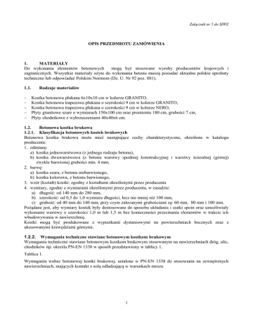 Załącznik nr 5 do SIWZ OPIS PRZEDMIOTU ZAMÓWIENIA 1. MATERIAŁY Do wykonania elementów betonowych mogą być stosowane wyroby producentów krajowych i zagranicznych. Wszystkie materiały użyte do wykonania betonu muszą posiadać aktualne polskie aprobaty techniczne lub odpowiadać Polskim Normom (Dz. U. Nr 92 poz. 881). 1.1. Rodzaje materiałów Kostka betonowa płukana 6x10x10 cm w kolorze GRANITO, Kostka betonowa trapezowa płukana o szerokości 9 cm w kolorze GRANITO, Kostka betonowa trapezowa płukana o szerokości 9 cm w kolorze NERO, Płyty granitowe szare o wymiarach 150x100 cm oraz promieniu 180 cm, grubości 7 cm, Płyty chodnikowe z wybrzuszeniami 40x40x6 cm. 1.2. Betonowa kostka brukowa 1.2.1. Klasyfikacja betonowych kostek brukowych Betonowa kostka brukowa może mieć następujące cechy charakterystyczne, określone w katalogu producenta: 1. odmianę: a) kostka jednowarstwowa (z jednego rodzaju betonu), b) kostka dwuwarstwowa (z betonu warstwy spodniej konstrukcyjnej i warstwy ścieralnej (górnej) zwykle barwionej grubości min. 4 mm, 2. barwę: a) kostka szara, z betonu niebarwionego, b) kostka kolorowa, z betonu barwionego, 3. wzór (kształt) kostki: zgodny z kształtami określonymi przez producenta 4. wymiary, zgodne z wymiarami określonymi przez producenta, w zasadzie: a) długość: od 140 mm do 280 mm, b) szerokość: od 0,5 do 1,0 wymiaru długości, lecz nie mniej niż 100 mm, c) grubość: od 40 mm do 140 mm, przy czym zalecanymi grubościami są: 60 mm, 80 mm i 100 mm. Pożądane jest, aby wymiary kostek były dostosowane do sposobu układania i siatki spoin oraz umożliwiały wykonanie warstwy o szerokości 1,0 m lub 1,5 m bez konieczności przecinania elementów w trakcie ich wbudowywania w nawierzchnię. Kostki mogą być produkowane z wypustkami dystansowymi na powierzchniach bocznych oraz z ukosowanymi krawędziami górnymi. 1.2.2. Wymagania techniczne stawiane betonowym kostkom brukowym Wymagania techniczne stawiane betonowym kostkom brukowym stosowanym na nawierzchniach dróg, ulic, chodników itp. określa PN-EN 1338 w sposób przedstawiony w tablicy 1. Tablica 1. Wymagania wobec betonowej kostki brukowej, ustalone w PN-EN 1338 do stosowania na zewnętrznych nawierzchniach, mających kontakt z solą odladzającą w warunkach mrozu 1 Lp. 1 Załącznik normy Cecha Wymaganie Kształt i wymiary 1.1 Dopuszczalne odchyłki w mm od zadeklarowanych wymiarów kostki, grubości < 100 mm ≥ 100 mm C Długość szerokość grubość Różnica pomiędzy dwoma pomiarami grubości tej samej kostki, powinna być ±2 ±2 ±3 ≤ 3 mm ±3 ±3 ±4 1.2 Odchyłki płaskości i pofalowania (jeśli maksymalne wymiary kostki > 300 mm), przy długości pomiarowej 300 mm 400 mm C Maksymalna (w mm) 2 wypukłość wklęsłość 1,5 2,0 1,0 1,5 Właściwości fizyczne i mechaniczne 2.1 Odporność na zamrażanie/rozmrażanie z udziałem soli odladzających (wg klasy 3, zał. D) D Ubytek masy po badaniu: wartość średnia ≤ 1,0 kg/m 2, przy czym każdy pojedynczy wynik < 1,5 kg/m2 2.2 Wytrzymałość rozciąganie rozłupywaniu F Wytrzymałość charakterystyczna T ≥ 3,6 MPa. Każdy pojedynczy wynik ≥ 2,9 MPa i nie powinien wykazywać obciążenia niszczącego mniejszego niż 250 N/mm długości rozłupania F Kostki mają zadowalającą trwałość (wytrzymałość) jeśli spełnione są wymagania punktu 2.2 oraz istnieje normalna konserwacja GiH Pomiar wykonany na tarczy na przy 2.3 Trwałość (ze względu na wytrzymałość) 2.4 Odporność na ścieranie (wg klasy 3 znaczenia H normy) szerokiej ściernej, wg zał. G normy – badanie podstawowe ≤ 23 mm 2.5 Odporność na poślizg/poślizgnięcie 3 Böhmego, wg zał. H normy – badanie alternatywne ≤20 000mm3/5000 mm2 I a) jeśli górna powierzchnia kostki nie była szlifowana lub polerowana – zadowalająca odporność, b) jeśli wyjątkowo wymaga się podania wartości odporności na poślizg/poślizgnięcie – należy zadeklarować minimalną jej wartość pomierzoną wg zał. I normy (wahadłowym przyrządem do badania tarcia). J a) górna powierzchnia kostki nie powinna mieć rys i odprysków, Aspekty wizualne 3.1 Wygląd 2 b) nie dopuszcza się rozwarstwień w dwuwarstwowych, c) ewentualne wykwity nie są uważane za istotne 3.2 Tekstura J 3.3 Zabarwienie (barwiona może być warstwa ścieralna lub cały element) kostkach a) kostki z powierzchnią o specjalnej teksturze – producent powinien opisać rodzaj tekstury, b) tekstura lub zabarwienie kostki powinny być porównane z próbką producenta, zatwierdzoną przez odbiorcę, c) ewentualne różnice w jednolitości tekstury lub zabarwienia, spowodowane nieuniknionymi zmianami we właściwościach surowców i zmianach warunków twardnienia nie są uważane za istotne. W przypadku zastosowań kostki na powierzchniach innych niż przewidziano w tablicy 1 (np. na nawierzchniach wewnętrznych nie narażonych na kontakt z solą odladzającą), wymagania wobec kostki należy odpowiednio dostosować do ustaleń PN-EN-1338. Kostki kolorowe powinny być barwione substancjami odpornymi na działanie czynników atmosferycznych, światła (w tym promieniowania UV) i silnych alkaliów (m.in. cementu, który przy wypełnieniu spoin zaprawą cementowo-piaskową nie może odbarwiać kostek). Zaleca się stosowanie środków stabilnie barwiących zaczyn cementowy w kostce, np. tlenki żelaza, tlenek chromu, tlenek tytanu, tlenek kobaltowoglinowy (nie należy stosować do barwienia: sadz i barwników organicznych). Uwaga: Naloty wapienne (wykwity w postaci białych plam) mogą pojawić się na powierzchni kostek w początkowym okresie eksploatacji. Powstają one w wyniku naturalnych procesów fizykochemicznych występujących w betonie i zanikają w trakcie użytkowania w okresie do 2-3 lat. 1.3. Płyty chodnikowe kamienne (granitowe) 1.3.1. Rodzaje materiału kamiennego do wytwarzania płyt Płyty chodnikowe kamienne mogą być wykonywane z granitu, sjenitu, piaskowca lu