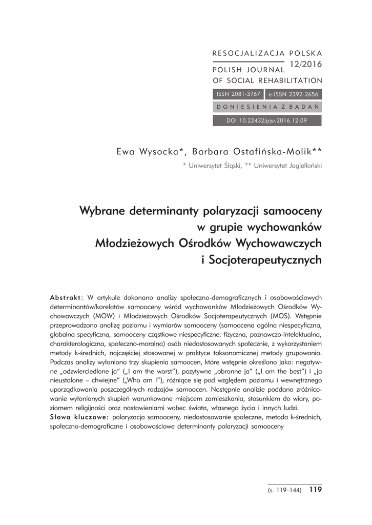R E S O C J A L I Z A C J A P O L SK A POLISH JOURNAL 12/2016 OF SOCIAL REHABILITATION ISSN 2081-3767 e-ISSN 2392-2656 D O N I E S I E N I A Z B A D A Ń DOI 10.22432/pjsr.2016.12.09 Ewa Wysocka*, Barbara Ostafińska-Molik** * Uniwersytet Śląski, ** Uniwersytet Jagielloński Wybrane determinanty polaryzacji samooceny w grupie wychowanków Młodzieżowych Ośrodków Wychowawczych i Socjoterapeutycznych Abstrakt: W artykule dokonano analizy społeczno-demograficznych i osobowościowych determinantów/korelatów samooceny wśród wychowanków Młodzieżowych Ośrodków Wychowawczych (MOW) i Młodzieżowych Ośrodków Socjoterapeutycznych (MOS). Wstępnie przeprowadzono analizę poziomu i wymiarów samooceny (samoocena ogólna niespecyficzna, globalna specyficzna, samooceny cząstkowe niespecyficzne: fizyczna, poznawczo-intelektualna, charakterologiczna, społeczno-moralna) osób niedostosowanych społecznie, z wykorzystaniem metody k-średnich, najczęściej stosowanej w praktyce taksonomicznej metody grupowania. Podczas analizy wyłoniono trzy skupienia samoocen, które wstępnie określono jako: negatywne „odzwierciedlone ja” („I am the worst”), pozytywne „obronne ja” („I am the best”) i „ja nieustalone – chwiejne” („Who am I”), różniące się pod względem poziomu i wewnętrznego uporządkowania poszczególnych rodzajów samoocen. Następnie analizie poddano zróżnicowanie wyłonionych skupień warunkowane miejscem zamieszkania, stosunkiem do wiary, poziomem religijności oraz nastawieniami wobec świata, własnego życia i innych ludzi. Słowa kluczowe: polaryzacja samooceny, niedostosowanie społeczne, metoda k-średnich, społeczno-demograficzne i osobowościowe determinanty polaryzacji samooceny (s. 119–144) 119 Ewa Wysocka, Barbara Ostafińska-Molik- Wprowadzenie Psychologia poznawcza wiąże regulację zachowania człowieka z procesami zachodzącymi w świadomości człowieka. Także w ostatnich latach w resocjalizacji mechanizmy niedostosowania społecznego łączy się często z obrazem siebie (self-concept), obrazem świata i własnego życia, co analizowane jest w kontekście zniekształceń poznawczych traktowanych jako mechanizmy nieprzystosowawcze (Mudrecka 2015; Opora 2009, 2011; Wysocka, Ostafińska-Molik 2014). Znaczenie samooceny dla funkcjonowania psychospołecznego, czyli regulacji zachowań ludzkich, wciąż jednak nie jest do końca ustalone, gdyż uzyskiwane wyniki są niejednoznaczne w kontekście opisu i wyjaśniania zaburzeń adaptacyjnych. Dlatego też autorki artykułu dokonały analizy polaryzacji samooceny wśród osób niedostosowanych społecznie1, wykorzystując specyficzną metodę pozwalającą ujawnić jednorodne kategorie osób przejawiających określony sposób funkcjonowania wyznaczany obrazem siebie (metoda k-średnich). Ujawnione polaryzacje samooceny (trzy grupy jednostek jednorodnych, a jednocześnie grupy różniące się między sobą) zostały już opisane, natomiast w tym artykule dokonano analizy pod kątem cech (społeczno-demograficznych i osobowościowych) charakterystycznych dla wyłonionych trzech grup, spolaryzowanych pod względem samooceny. Zdaniem autorek, to niewielki, ale może istotny krok, w procesie budowania modeli niedostosowania społecznego, obejmujących różne wyznaczniki i mechanizmy zaburzeń adaptacji. Samoocena i jej wybrane determinanty – analiza teoretyczna i wyniki badań Samoocena jest względnie stałą cechą, która określa stan aktualny lub motyw pobudzający jednostkę do działania w danym kierunku (proces samoregulacji), co dokonuje się zgodnie z jej potrzebami i potencjalnie służy jej rozwojowi. Proces ten wyznacza mechanizm dążenia do zachowania pozytywnego obrazu siebie, pozytywnej samooceny, czy poczucia własnej wartości. Potrzeba hubrystyczna (Kozielecki 1987, 1988) jest – zgodnie z wynikami różnych badań – potrzebą dominującą, bardziej istotną niż inne potrzeby. Wyniki badań wskazują, że poczucie własnej wartości czy samoocena to ważniejsze regulatory zachowań niż potrzeby fizjologiczne, seksualne, społeczne lub nawet materialne (Leary, Downs 1 Bardziej szczegółowo kwestie polaryzacji samooceny, z prezentacją metody k-średnich zastosowanej do wyłonienia grup jednorodnych pod względem poziomu różnych typów samooceny, zaprezentowano w innym artykule: E. Wysocka, B. Ostafińska-Molik (w druku). 120 (s. 119–144) Wybrane determinanty polaryzacji samooceny w grupie wychowanków… 1995, s. 123–144; Bushman i in. 2011, s. 993–1010), co w ponowoczesnym społeczeństwie o orientacji konsumpcyjnej ma szczególne znaczenie. Wiedza o sobie (samowiedza) oraz sposób wartościowania różnych elementów „ja”, określają i wyznaczają zdolność jednostki do integrowania własnych przekonań na temat otaczającego świata, relacji łączących ludzi oraz możliwości organizowania własnego życia wedle osobistych standardów i zakładanych celów. Doświadczenia z samym sobą, przeżywane emocje, a w rezultacie sposób reagowania na różne sytuacje życiowe (trudne), decydują o podejmowanej przez jednostkę aktywności życiowej, która może mieć charakter prorozwojowy, adaptacyjny vs antyrozwojowy, dezadaptacyjny. Samoocena jest niewątpliwie istotnym czynnikiem regulacji zachowania się człowieka, jednak zależnie od jej „jakości” (pozytywna, negatywna, zawyżona, zaniżona, adekwatna i nieadekwatna), sposób regulacji zachowań jest odmienny i może prowadzić do różnych rezultatów (pozytywna adaptacja vs nieprzystosowanie). Samoocenę definiuje się różnie, ale zawsze wiąże się ją z kategorią „Ja”. Można zatem mówić, że samoocena stanowi: a) te elementy „Ja”, które zostały wyodrębnione ze względu na treść i przyjętą perspektywę czasową; wówczas analizuje się ją w kategoriach rozbieżności między „Ja realnym” (jaki jestem), „Ja idealnym” (jaki chciałbym być) i „Ja powin