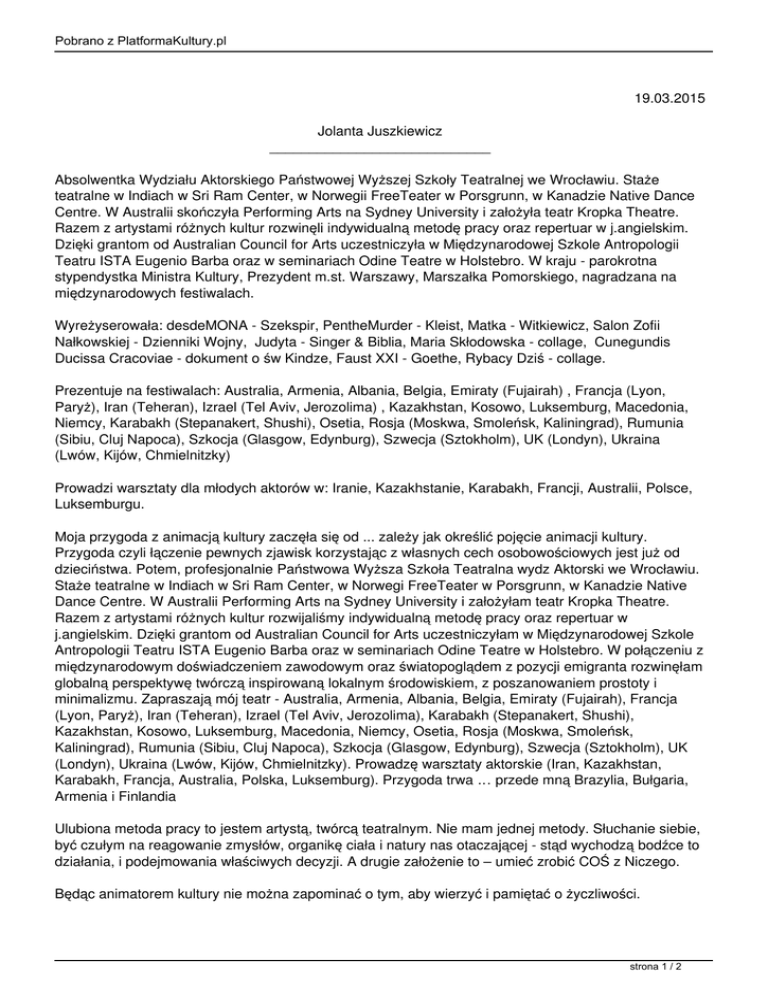 Pobrano z PlatformaKultury.pl 19.03.2015 Jolanta Juszkiewicz ____________________________ Absolwentka Wydziału Aktorskiego Państwowej Wyższej Szkoły Teatralnej we Wrocławiu. Staże teatralne w Indiach w Sri Ram Center, w Norwegii FreeTeater w Porsgrunn, w Kanadzie Native Dance Centre. W Australii skończyła Performing Arts na Sydney University i założyła teatr Kropka Theatre. Razem z artystami różnych kultur rozwinęli indywidualną metodę pracy oraz repertuar w j.angielskim. Dzięki grantom od Australian Council for Arts uczestniczyła w Międzynarodowej Szkole Antropologii Teatru ISTA Eugenio Barba oraz w seminariach Odine Teatre w Holstebro. W kraju - parokrotna stypendystka Ministra Kultury, Prezydent m.st. Warszawy, Marszałka Pomorskiego, nagradzana na międzynarodowych festiwalach. Wyreżyserowała: desdeMONA - Szekspir, PentheMurder - Kleist, Matka - Witkiewicz, Salon Zofii Nałkowskiej - Dzienniki Wojny, Judyta - Singer & Biblia, Maria Skłodowska - collage, Cunegundis Ducissa Cracoviae - dokument o św Kindze, Faust XXI - Goethe, Rybacy Dziś - collage. Prezentuje na festiwalach: Australia, Armenia, Albania, Belgia, Emiraty (Fujairah) , Francja (Lyon, Paryż), Iran (Teheran), Izrael (Tel Aviv, Jerozolima) , Kazakhstan, Kosowo, Luksemburg, Macedonia, Niemcy, Karabakh (Stepanakert, Shushi), Osetia, Rosja (Moskwa, Smoleńsk, Kaliningrad), Rumunia (Sibiu, Cluj Napoca), Szkocja (Glasgow, Edynburg), Szwecja (Sztokholm), UK (Londyn), Ukraina (Lwów, Kijów, Chmielnitzky) Prowadzi warsztaty dla młodych aktorów w: Iranie, Kazakhstanie, Karabakh, Francji, Australii, Polsce, Luksemburgu. Moja przygoda z animacją kultury zaczęła się od ... zależy jak określić pojęcie animacji kultury. Przygoda czyli łączenie pewnych zjawisk korzystając z własnych cech osobowościowych jest już od dzieciństwa. Potem, profesjonalnie Państwowa Wyższa Szkoła Teatralna wydz Aktorski we Wrocławiu. Staże teatralne w Indiach w Sri Ram Center, w Norwegi FreeTeater w Porsgrunn, w Kanadzie Native Dance Centre. W Australii Performing Arts na Sydney University i założyłam teatr Kropka Theatre. Razem z artystami różnych kultur rozwijaliśmy indywidualną metodę pracy oraz repertuar w j.angielskim. Dzięki grantom od Australian Council for Arts uczestniczyłam w Międzynarodowej Szkole Antropologii Teatru ISTA Eugenio Barba oraz w seminariach Odine Teatre w Holstebro. W połączeniu z międzynarodowym doświadczeniem zawodowym oraz światopoglądem z pozycji emigranta rozwinęłam globalną perspektywę twórczą inspirowaną lokalnym środowiskiem, z poszanowaniem prostoty i minimalizmu. Zapraszają mój teatr - Australia, Armenia, Albania, Belgia, Emiraty (Fujairah), Francja (Lyon, Paryż), Iran (Teheran), Izrael (Tel Aviv, Jerozolima), Karabakh (Stepanakert, Shushi), Kazakhstan, Kosowo, Luksemburg, Macedonia, Niemcy, Osetia, Rosja (Moskwa, Smoleńsk, Kaliningrad), Rumunia (Sibiu, Cluj Napoca), Szkocja (Glasgow, Edynburg), Szwecja (Sztokholm), UK (Londyn), Ukraina (Lwów, Kijów, Chmielnitzky). Prowadzę warsztaty aktorskie (Iran, Kazakhstan, Karabakh, Francja, Australia, Polska, Luksemburg). Przygoda trwa … przede mną Brazylia, Bułgaria, Armenia i Finlandia Ulubiona metoda pracy to jestem artystą, twórcą teatralnym. Nie mam jednej metody. Słuchanie siebie, być czułym na reagowanie zmysłów, organikę ciała i natury nas otaczającej - stąd wychodzą bodźce to działania, i podejmowania właściwych decyzji. A drugie założenie to – umieć zrobić COŚ z Niczego. Będąc animatorem kultury nie można zapominać o tym, aby wierzyć i pamiętać o życzliwości. strona 1 / 2 Pobrano z PlatformaKultury.pl Reprezentantka projektu "Cunegundis Ducissa Cracoviae"na Ogólnopolskiej Giełdzie Projektów 2014 strona 2 / 2