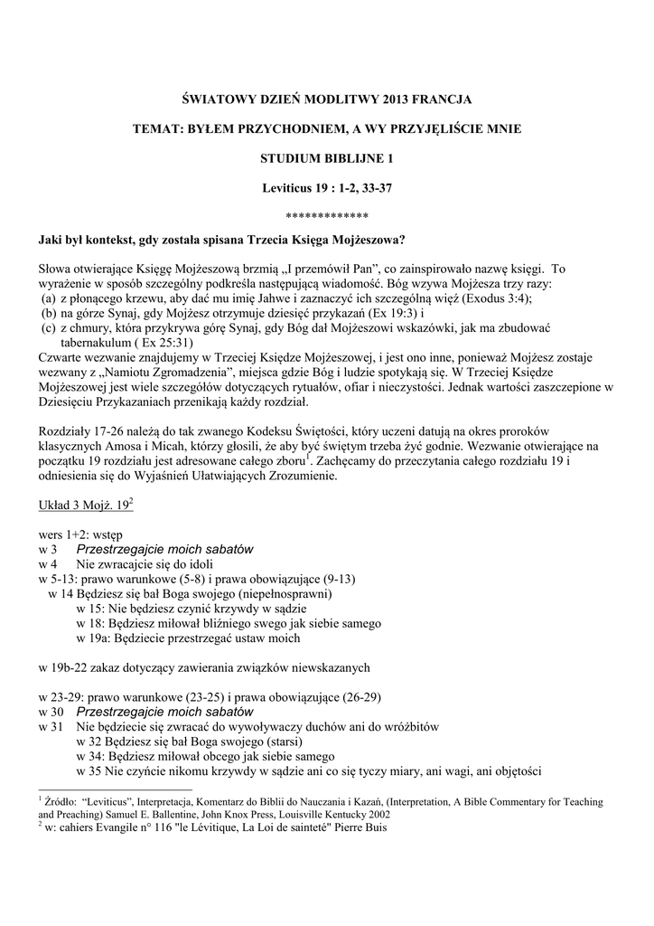 ŚWIATOWY DZIEŃ MODLITWY 2013 FRANCJA TEMAT: BYŁEM PRZYCHODNIEM, A WY PRZYJĘLIŚCIE MNIE STUDIUM BIBLIJNE 1 Leviticus 19 : 1-2, 33-37 ************* Jaki był kontekst, gdy została spisana Trzecia Księga Mojżeszowa? Słowa otwierające Księgę Mojżeszową brzmią „I przemówił Pan”, co zainspirowało nazwę księgi. To wyrażenie w sposób szczególny podkreśla następującą wiadomość. Bóg wzywa Mojżesza trzy razy: (a) z płonącego krzewu, aby dać mu imię Jahwe i zaznaczyć ich szczególną więź (Exodus 3:4); (b) na górze Synaj, gdy Mojżesz otrzymuje dziesięć przykazań (Ex 19:3) i (c) z chmury, która przykrywa górę Synaj, gdy Bóg dał Mojżeszowi wskazówki, jak ma zbudować tabernakulum ( Ex 25:31) Czwarte wezwanie znajdujemy w Trzeciej Księdze Mojżeszowej, i jest ono inne, ponieważ Mojżesz zostaje wezwany z „Namiotu Zgromadzenia”, miejsca gdzie Bóg i ludzie spotykają się. W Trzeciej Księdze Mojżeszowej jest wiele szczegółów dotyczących rytuałów, ofiar i nieczystości. Jednak wartości zaszczepione w Dziesięciu Przykazaniach przenikają każdy rozdział. Rozdziały 17-26 należą do tak zwanego Kodeksu Świętości, który uczeni datują na okres proroków klasycznych Amosa i Micah, którzy głosili, że aby być świętym trzeba żyć godnie. Wezwanie otwierające na początku 19 rozdziału jest adresowane całego zboru1. Zachęcamy do przeczytania całego rozdziału 19 i odniesienia się do Wyjaśnień Ułatwiających Zrozumienie. Układ 3 Mojż. 192 wers 1+2: wstęp w 3 Przestrzegajcie moich sabatów w 4 Nie zwracajcie się do idoli w 5-13: prawo warunkowe (5-8) i prawa obowiązujące (9-13) w 14 Będziesz się bał Boga swojego (niepełnosprawni) w 15: Nie będziesz czynić krzywdy w sądzie w 18: Będziesz miłował bliźniego swego jak siebie samego w 19a: Będziecie przestrzegać ustaw moich w 19b-22 zakaz dotyczący zawierania związków niewskazanych w 23-29: prawo warunkowe (23-25) i prawa obowiązujące (26-29) w 30 Przestrzegajcie moich sabatów w 31 Nie będziecie się zwracać do wywoływaczy duchów ani do wróżbitów w 32 Będziesz się bał Boga swojego (starsi) w 34: Będziesz miłował obcego jak siebie samego w 35 Nie czyńcie nikomu krzywdy w sądzie ani co się tyczy miary, ani wagi, ani objętości 1 Żródło: “Leviticus”, Interpretacja, Komentarz do Biblii do Nauczania i Kazań, (Interpretation, A Bible Commentary for Teaching and Preaching) Samuel E. Ballentine, John Knox Press, Louisville Kentucky 2002 2 w: cahiers Evangile n° 116 "le Lévitique, La Loi de sainteté" Pierre Buis w 37: Będziecie przestrzegać ustaw moich Krok 1 Interaktywne studia, które pomogą zrozumieć tekst i jego kontekst A. Zwróćmy uwagę na powtarzane zdanie w tekście, które mogłoby być litanią (w dłuższej lub krótszej formie). Ta fraza pozwala nam wyróżnić poszczególne tematu: zanotujmy je. B. Czy te tematy przypominają nam o innych kodeksach3? C. Zidentyfikuj wszystkie osoby, wymieniane w przykazaniach w 3 Mojż 19. D. Jakie miejsce i status dają im te prawa? E. Tekst przedstawia wewnętrzną symetrię. Czy analizowaliśmy to? 4 F. wers 34 odpowiada wersowi 18: jaki wniosek możemy wyciągnąć? G. Jaką wizję ludzkości i jej relacji z Bogiem możemy otrzymać na podstawie tekstu? Krok 2 Jaki jest mój własny kontekst i jak on wzmacnia moją wiarę? A. Co w moim życiu oznacza prośba „aby być świętym?” B. Jakie są duchowe podstawy dla mojego spotkania z obcym? C. Czy przynależność do Chrystusa poprzez łaskę prowadzi mnie do kochania wszystkich ludzi? Krok 3 Jaki jest obecny kontekst społeczny? A. Co znaczy nie wyzyskiwać obcokrajowców? B. Jak my obecnie witamy imigrantów w naszym kraju? Posłuchajcie opowieści kilku emigrantów mieszkających we Francji: Kobieta I Nazywam się Khadidja i jestem z Maroko. Przyjechałam do Francji na podstawie wizy turystycznej. Mieszkam u mojej siostry. Ponieważ nie otrzymałam pozwolenia na pracę, pracuję nielegalnie w prywatnym domu za marne wynagrodzenie. W każdej chwili mogę być odesłana do kraju, z powrotem do skrajnej biedy. Kobieta 2 Nazywam się Zaira i 10 miesięcy temu przyjechałam z Czeczenii z czwórką moich dzieci. Zakwaterowano nas w hotelu opłacanym przez państwo. Pewnego dnia wyrzucono nas wszystkich. Wraz z trzema innymi rodzinami, czternastoma dziećmi i dwiema kobietami w ciąży nie mieliśmy, dokąd pójść. Nasze pokoje nie zostały opłacone z powodu złej koordynacji administracyjno politycznej. Po spędzeniu jednej nocy na dworze dzięki pomocy organizacji chrześcijańskiej otrzymaliśmy tymczasowe zakwaterowanie. Ale co nas czeka za dwa miesiące? Kobieta 3 Mam na imię Sabina i jestem z Nepalu. Spotkałam Francuza mieszkającego i pracującego w Nepalu. Pobraliśmy się we Francuskim Konsulacie w Katmandu. Gdy przyjechałam do Francji, nie miałam prawa żyć legalnie z moim mężem, ponieważ nie otrzymałam jeszcze pozwolenia na pobyt. 3 W Biblii jest kilka wersji ,,dziesięciu przykazań”. - Dt 5 Piąta Księga Mojżeszowa (przed wygnaniem, VII w. p.n.e.) -Ex. 20 ( przekształcony tekst V Mojż, koniec VI w. p.n.e.) - 3 Mojż 19 (V w.) Porównując je, zwróćmy uwagę na różnice (3 Mojż. 19 wprowadza ideę etyki społecznej ) 4 Poniżej Wyjaśnienia Ułatwiające Zrozumienie Kobieta 4 Mam na imię Celine i jestem dyrektorem szkoły podstawowej. Pewnego dnia w listopadzie dzieci bawiły się na podwórku szkolnym, gdy przyjechała policja i aresztowali 4 dzieci z rodziny z Kosowa. Zostali zabrani wraz z rodzicami do centrum zatrzymań. Potem, przed samymi Świętami Bożego Narodzenia, zostali deportowani. Te dzieci nie będą miały możliwości kontynuowania nauki, jak ich koledzy szkolni, którzy do dziś, podobnie jak ja, są wstrząśnięci widokiem, jakiego byliśmy świadkami. C. Jak możemy działać w naszych kościołach zgodnie z zasadami etyki, aby służyć wszystkim ludziom? D. Jeżeli oświadcz