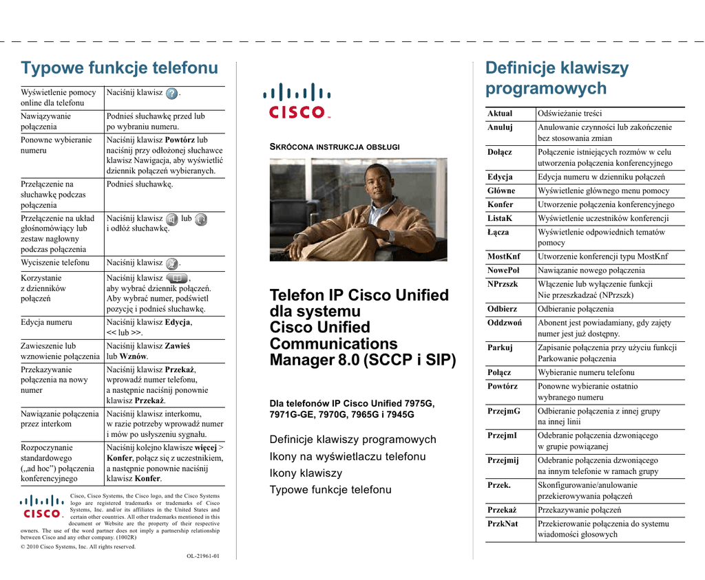 Typowe funkcje telefonu Wyświetlenie pomocy online dla telefonu Naciśnij klawisz ? . Nawiązywanie połączenia Podnieś słuchawkę przed lub po wybraniu numeru. Ponowne wybieranie numeru Naciśnij klawisz Powtórz lub naciśnij przy odłożonej słuchawce klawisz Nawigacja, aby wyświetlić dziennik połączeń wybieranych. Przełączenie na słuchawkę podczas połączenia Podnieś słuchawkę. Przełączenie na układ głośnomówiący lub zestaw nagłowny podczas połączenia Naciśnij klawisz i odłóż słuchawkę. Wyciszenie telefonu Naciśnij klawisz Korzystanie z dzienników połączeń Naciśnij klawisz , aby wybrać dziennik połączeń. Aby wybrać numer, podświetl pozycję i podnieś słuchawkę. Edycja numeru Naciśnij klawisz Edycja, << lub >>. Odświeżanie treści Anuluj Anulowanie czynności lub zakończenie bez stosowania zmian Dołącz Połączenie istniejących rozmów w celu utworzenia połączenia konferencyjnego Edycja Edycja numeru w dzienniku połączeń Główne Wyświetlenie głównego menu pomocy Konfer Utworzenie połączenia konferencyjnego ListaK Wyświetlenie uczestników konferencji Łącza Wyświetlenie odpowiednich tematów pomocy MostKnf Utworzenie konferencji typu MostKnf NowePoł Nawiązanie nowego połączenia NPrzszk Włączenie lub wyłączenie funkcji Nie przeszkadzać (NPrzszk) Odbierz Odbieranie połączenia Oddzwoń Abonent jest powiadamiany, gdy zajęty numer jest już dostępny. Parkuj Zapisanie połączenia przy użyciu funkcji Parkowanie połączenia Połącz Wybieranie numeru telefonu Powtórz Dla telefonów IP Cisco Unified 7975G, 7971G-GE, 7970G, 7965G i 7945G Ponowne wybieranie ostatnio wybranego numeru PrzejmG Odbieranie połączenia z innej grupy na innej linii Definicje klawiszy programowych PrzejmI Ikony na wyświetlaczu telefonu Odebranie połączenia dzwoniącego w grupie powiązanej Przejmij Odebranie połączenia dzwoniącego na innym telefonie w ramach grupy Przek. Skonfigurowanie/anulowanie przekierowywania połączeń Przekaż Przekazywanie połączeń PrzkNat Przekierowanie połączenia do systemu wiadomości głosowych SKRÓCONA INSTRUKCJA OBSŁUGI . Naciśnij klawisz Przekaż, wprowadź numer telefonu, a następnie naciśnij ponownie klawisz Przekaż. Nawiązanie połączenia Naciśnij klawisz interkomu, przez interkom w razie potrzeby wprowadź numer i mów po usłyszeniu sygnału. Rozpoczynanie standardowego („ad hoc”) połączenia konferencyjnego Aktual lub Zawieszenie lub Naciśnij klawisz Zawieś wznowienie połączenia lub Wznów. Przekazywanie połączenia na nowy numer Definicje klawiszy programowych Naciśnij kolejno klawisze więcej > Konfer, połącz się z uczestnikiem, a następnie ponownie naciśnij klawisz Konfer. Cisco, Cisco Systems, the Cisco logo, and the Cisco Systems logo are registered trademarks or trademarks of Cisco Systems, Inc. and/or its affiliates in the United States and certain other countries. All other trademarks mentioned in this document or Website are the property of their respective owners. The use of the word partner does not imply a partnership relationship between Cisco and any other company. (1002R) © 2010 Cisco Systems, Inc. All rights reserved. OL-21961-01 Telefon IP Cisco Unified dla systemu Cisco Unified Communications Manager 8.0 (SCCP i SIP) Ikony klawiszy Typowe funkcje telefonu Ikony na wyświetlaczu telefonu QRT Przesyłanie problemów z połączeniem do administratora systemu Rozłącz Rozłączenie bieżącego połączenia lub bieżącego połączenia przez interkom SkrWybier Wybieranie numeru przy użyciu numeru szybkiego wybierania Szczegóły (tylko SCCP) Otwarcie rekordu Szczegóły dla połączenia konferencyjnego w dziennikach Połączenia nieodebrane oraz Połączenia odebrane Usuń Usuwanie znaków z prawej strony kursora podczas korzystania z funkcji Edycja Usuń Usunięcie uczestnika konferencji UsuńOst Usunięcie uczestnika ostatnio dołączonego do konferencji Wideo (tylko SCCP) Wybranie trybu wideo Więcej Wyświetlenie dodatkowych klawiszy programowych Wstecz Powrót do poprzedniego tematu pomocy Wtrąć Dodawanie się do połączenia na linii wspólnej Monitorowana linia BLF jest w użyciu Wtrąć Dołączanie do połączenia na linii wspólnej i utworzenie konferencji Monitorowana linia BLF jest wolna Wiadomości Wybranie pozycji menu lub połączenia Monitorowana linia BLF dzwoni (Przejmij BLF) Usługi Wybierz Wyczyść Usuwanie rekordów lub ustawień Wyczyść Przywrócenie ustawień domyślnych Wyjście Powrót do poprzedniego widoku Wyszukaj Wyszukiwanie pozycji w książce telefonicznej Wznów Wznowienie zawieszonego połączenia Zamknij Zamknięcie bieżącego okna Zapisz Zapisanie wybranych ustawień << Usuwanie wprowadzonych znaków >> Przesuwanie kursora po wprowadzonych znakach Układ głośnomówiący w użyciu Włączony przekaz wideo (tylko SCCP) Przekierowywanie połączeń włączone Funkcja przypisana do klawisza Połączenie zawieszone; zdalne połączenie zawieszone Przenoszenie przypisane do klawisza Zawieszenie przypisane do klawisza Trwające połączenie Konferencja przypisana do klawisza Połączenie przychodzące Słuchawka podniesiona Przekazywanie przypisane do klawisza Słuchawka odłożona Adres URL usługi telefonicznej przypisany do klawisza Linia wspólna w użyciu Adres URL gotowy do edycji (tylko SIP) Wiadomość oczekująca Wybrana opcja Połączenie uwierzytelnione Funkcja włączona Połączenie szyfrowane Szybkie wybieranie, dziennik połączeń lub książka telefoniczna (stan linii nieznany) Linia w trybie Nie przeszkadzać (funkcja BLF) Wolna linia interkomu Jednokierunkowe połączenie przez interkom Dwukierunkowe połączenie przez interkom Słuchawka w użyciu Zestaw nagłowny w użyciu Ikony klawiszy ? Pomoc Książki telefoniczne Ustawienia Głośność Głośnik Wycisz Zestaw nagłowny