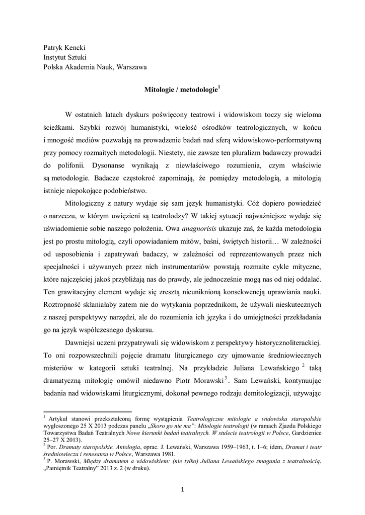 Patryk Kencki Instytut Sztuki Polska Akademia Nauk, Warszawa Mitologie / metodologie1 W ostatnich latach dyskurs poświęcony teatrowi i widowiskom toczy się wieloma ścieżkami. Szybki rozwój humanistyki, wielość ośrodków teatrologicznych, w końcu i mnogość mediów pozwalają na prowadzenie badań nad sferą widowiskowo-performatywną przy pomocy rozmaitych metodologii. Niestety, nie zawsze ten pluralizm badawczy prowadzi do polifonii. Dysonanse wynikają z niewłaściwego rozumienia, czym właściwie są metodologie. Badacze częstokroć zapominają, że pomiędzy metodologią, a mitologią istnieje niepokojące podobieństwo. Mitologiczny z natury wydaje się sam język humanistyki. Cóż dopiero powiedzieć o narzeczu, w którym uwięzieni są teatrolodzy? W takiej sytuacji najważniejsze wydaje się uświadomienie sobie naszego położenia. Owa anagnorisis ukazuje zaś, że każda metodologia jest po prostu mitologią, czyli opowiadaniem mitów, baśni, świętych historii… W zależności od usposobienia i zapatrywań badaczy, w zależności od reprezentowanych przez nich specjalności i używanych przez nich instrumentariów powstają rozmaite cykle mityczne, które najczęściej jakoś przybliżają nas do prawdy, ale jednocześnie mogą nas od niej oddalać. Ten grawitacyjny element wydaje się zresztą nieuniknioną konsekwencją uprawiania nauki. Roztropność skłaniałaby zatem nie do wytykania poprzednikom, że używali nieskutecznych z naszej perspektywy narzędzi, ale do rozumienia ich języka i do umiejętności przekładania go na język współczesnego dyskursu. Dawniejsi uczeni przypatrywali się widowiskom z perspektywy historycznoliterackiej. To oni rozpowszechnili pojęcie dramatu liturgicznego czy ujmowanie średniowiecznych misteriów w kategorii sztuki teatralnej. Na przykładzie Juliana Lewańskiego 2 taką dramatyczną mitologię omówił niedawno Piotr Morawski 3 . Sam Lewański, kontynuując badania nad widowiskami liturgicznymi, dokonał pewnego rodzaju demitologizacji, używając 1 Artykuł stanowi przekształconą formę wystąpienia Teatrologiczne mitologie a widowiska staropolskie wygłoszonego 25 X 2013 podczas panelu „Skoro go nie ma”: Mitologie teatrologii (w ramach Zjazdu Polskiego Towarzystwa Badań Teatralnych Nowe kierunki badań teatralnych. W stulecie teatrologii w Polsce, Gardzienice 25–27 X 2013). 2 Por. Dramaty staropolskie. Antologia, oprac. J. Lewański, Warszawa 1959–1963, t. 1–6; idem, Dramat i teatr średniowiecza i renesansu w Polsce, Warszawa 1981. 3 P. Morawski, Między dramatem a widowiskiem: (nie tylko) Juliana Lewańskiego zmagania z teatralnością, „Pamiętnik Teatralny” 2013 z. 2 (w druku). 1 w tytule swojej ostatniej książki pojęcia: dramatyzacja 4 . Jakkolwiek termin ten ma mniej restrykcyjny charakter, to jednak zdaje się wskazywać, że właśnie dramat stanowi punkt odniesienia (w konsekwencji więc wzór, wokół którego koncentrują się dramatyzacje). Swoje mity stworzyli także historycy teatru. Widowiskowy charakter mają rozważania Jacka Lipińskiego nad aktorskim kształtem renesansowych przedstawień 5 . Nie dość, że zawarte w jego książce wywody są zupełnie spekulatywne, to należy wątpić, czy część z analizowanych przez niego dramatów była w ogóle w dobie renesansu wystawiana. Jak więc prawidłowo odczytać zapisane przez Lipińskiego mity? Należy przenieść ciężar z wyobrażeń o mniemanych spektaklach na przyglądanie się, jak na zachowane dramaty wpływały rozmaite konwencje sceniczne, z którymi stykali się dramatopisarze. Potrafił to dostrzec Grzegorz Sinko, który, recenzując rozprawę Lipińskiego, napisał, że rzecz nie jest w tym, czy było tak, jak pisze autor, ale że tak być mogło6. Nadmierne przywiązanie do modelu teatru w kształcie z XIX i XX stulecia 7 przyczyniło się do traktowania widowisk staropolskich jako prehistorii sztuki teatralnej (a więc okresu z natury mitycznego). Takie spojrzenie dostrzegamy chociażby u Zbigniewa Raszewskiego repertuarowe 8 . Ale właściwie dlaczego jako model teatru mamy traktować tylko przedsiębiorstwa o charakterze zawodowym? Przecież obok bogów olimpijskich mitologia przedstawia nam dzieje pomniejszych bóstw lokalnych. Ujęcie zastosowane przez wybitnych historyków teatru przypomina nam więc mitologię w opracowaniu dostojnych tragików. W najpopularniejszej publikacji Raszewskiego znajdujemy interesujący mit teatrogeniczny (narodziny europejskiego teatru w środowisku liturgicznym) 9, który poddałem komentarzowi w trakcie zeszłorocznej konferencji Raszewski dzisiaj czytany10. Dokładniejsze przyjrzenie się monumentowi (średniowieczny teatr religijny) opisywanemu przez uczonego pozwala nam dojrzeć, że nie jest on wyciosany z monolitu, ale przypomina raczej kopiec usypany z rozmaitych kamieni. 4 J. Lewański, Łacińskie dramatyzacje Wielkiego Tygodnia XI–XVI wieku, Lublin 2000. J. Lipiński, Sztuka aktorska w Polsce. 1500–1633, Warszawa 1974. 6 G. Sinko, recenzja przywołanej książki Lipińskiego, „Pamiętnik Teatralny” 1978 z. 3, s. 473–475. 7 A zatem takiego, który Dariusz Kosiński określa jako „Teatr Kulturalnego Miasta”, por. idem, Teatra polskie. Historie, Warszawa 2010. 8 Z. Raszewski, Z tradycji teatralnych Pomorza, Wielkopolski i Śląska, Wrocław 1955. 9 Odwołując się do wystawień Visitatio sepulchri napisał: „Od tych słów, na poły mówionych, na poły śpiewanych, zgodnie z prastarym obyczajem, wywodzącym się jeszcze ze starożytności, zaczął się teatr chrześcijański” (Z. Raszewski, Krótka historia teatru polskiego, Warszawa 1977). 10 P. Kencki, Raszewski staropolski, [w:] Raszewski dzisiaj czytany (w druku). 5 2 W opozycji do Raszewskiego mitologię słowiańskich widowisk stworzył Leszek Kolankiewicz. Opowieść zawarł w wymierzonym przeciwko tamtemu badaczowi eseju Kropelka brandy ze Stonehenge11, który następnie przerobił na ni