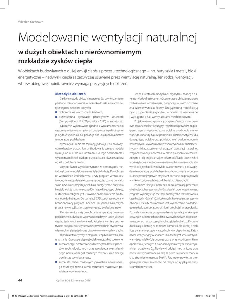 Wiedza fachowa Modelowanie wentylacji naturalnej w dużych obiektach o nierównomiernym rozkładzie zysków ciepła W obiektach budowlanych o dużej emisji ciepła z procesu technologicznego − np. huty szkła i metali, bloki energetyczne − nadwyżki ciepła są zazwyczaj usuwane przez wentylację naturalną. Ten rodzaj wentylacji, wbrew obiegowej opinii, również wymaga precyzyjnych obliczeń. Metodyka obliczeń Są dwie metody obliczania parametrów powietrza – temperatury i różnicy ciśnienia w stosunku do ciśnienia atmosferycznego na zewnątrz budynku: ■■ obliczenia na wartościach średnich, ■■ przestrzenna symulacja przepływów strumieni (Computational Fluid Dynamics – CFD) w kubaturze. Obliczenia wykonywane zgodnie z wzorami mechaniki wyporu grawitacyjnego są stosunkowo proste. Wyniki otrzymuje się dość szybko, ale nie pokazują one lokalnych maksimów temperatury pod dachem. Symulacja CFD nie ma tej wady, jednak jest nieporównywalnie bardziej pracochłonna. Zbudowanie samego modelu zajmuje od kilku do kilkunastu dni. Do tego dochodzi czas wykonania obliczeń każdego przypadku, co również zabiera od kilku do kilkunastu dni. Aby porównać wyniki otrzymane za pomocą obu metod, wykonano modelowanie wentylacji dla huty. Do obliczeń na wartościach średnich został użyty program Ventos. Jest to obecnie najbardziej efektywne narzędzie. Używa go większość inżynierów, projektujących bloki energetyczne, huty szkła i metali, a także spalarnie odpadów i wszelkiego typu obiekty, w których niezbędne jest usuwanie nadmiaru ciepła emitowanego do kubatury. Do symulacji CFD został zastosowany licencjonowany program Phoenics Flair jeden z najlepszych programów w tej klasie, stosowany przez profesjonalistów. Program Ventos służy do obliczania temperatury powietrza pod dachem budynku po wprowadzeniu danych takich jak: zyski ciepła z technologii emitowane do kubatury, wymiary geometryczne budynku oraz usytuowanie i powierzchnie otworów nawiewnych w elewacjach oraz otworów wywiewnych w dachu. U podstaw teoretycznych programu leżą dwa równania, które w stanie równowagi cieplnej obiektu muszą być spełnione: ■■ suma energii dostarczanej do wnętrza hali (z procesów technologicznych oraz powietrza wentylacyjnego nawiewanego) musi być równa sumie energii powietrza wywiewanego, ■■ suma strumieni masowych powietrza nawiewanego musi być równa sumie strumieni masowych powietrza wywiewanego. 44 Jedną z istotnych modyfikacji algorytmu znanego z literatury było drastyczne skrócenie czasu obliczeń poprzez zastosowanie wcześniejszej prognozy, w jakim obszarze znajdzie się wynik końcowy. Drugą istotną modyfikacją było uzupełnienie algorytmu o powietrze nawiewane i wyciągane z hali wentylatorami mechanicznymi. Projektowanie za pomocą programu Ventos ma w pewnym sensie charakter iteracyjny. Projektant wprowadza do programu wymiary geometryczne obiektu, zyski ciepła emitowane do kubatury hali, współczynniki charakterystyczne dla danego typu obiektu oraz powierzchnie i poziom otworów nawiewnych i wywiewnych ze współczynnikami charakterystycznymi dla zastosowanych urządzeń wentylacji naturalnej. Program wykonuje obliczenia w czasie praktycznie niezauważalnym, a rolą projektanta jest taka modyfikacja powierzchni lub/i usytuowania otworów nawiewnych i wywiewnych, aby wynik kolejnych obliczeń był do zaakceptowania pod względem temperatury pod dachem i rozkładu ciśnienia w budynku. Przy pewnej wprawie projektant dochodzi do pożądanych wyników końcowych już po kilku takich „iteracjach”. Phoenics Flair jest narzędziem do symulacji procesów obejmujących przepływ płynów, ciepła i przenoszenia masy. Program wykorzystuje metody numeryczne rozwiązywania cząstkowych równań różniczkowych, które opisują przepływ płynów. Dzięki temu możliwe jest wyznaczenie dokładnego rozkładu temperatury, ciśnień i prędkości w przepływie. Pozwala również na przeprowadzenie symulacji w skomplikowanych kubaturach o zróżnicowanych zyskach ciepła rozmieszczonych w poszczególnych częściach obiektu. Program dzieli całą kubaturę na mniejsze komórki i dla każdej z nich liczy parametry przepływających płynów, ciepła i masy. Każdy otwór wentylacyjny w ścianach i na dachu jest scharakteryzowany jego wielkością geometryczną oraz współczynnikiem oporów miejscowych ξ oraz aerodynamicznym współczynnikiem przepływu CV0. Nawiewy i odciągi mechaniczne oraz powietrze wypuszczane na halę są przedstawione w modelu jako strumienie masowe [kg/h]. Parametry powietrza program przelicza w zależności od temperatury jaką ma dany strumień powietrza. cyrkulacje 32 – marzec 2016 44-48-WIEDZA-Modelowanie-Kontrymowicz-Magdziarz-2-Cyrk-32-2016.indd 44 2/20/16 4:17:24 PM Wiedza fachowa Rys. 1. Model zespołu budynków huty Klient Numer projektu Obiekt Obszar wentylacji Uwagi Data Obliczenia wykonał Temperatura zewnętrzna Profil temperatury Rys. 2. Źródła ciepła wewnątrz budynków Klient Numer projektu Obiekt Obszar wentylacji Uwagi Data Obliczenia wykonał 2015-16 Cały kompleks_normalna praca Lato +32 19-06-2015 Bohdan Kontrymowicz +32 Brak profilu Raport nr 13 Temperatura zewnętrzna Profil temperatury Wymiary główne Długość pomieszczenia Szerokość pomieszczenia Powierzchnia pomieszczenia Maksymalna wysokość budynku (kalenica) Średnia wysokość poniszczenia h Kubatura hali Stopień zabudowy pomne iszczenia Kubatura netto l 276 b 81,00 A 22 316 h 63,00 av 57,00 VR 1 271 984 VB 0,65 VRN 445 194 Dane meteorologiczne Temperatura powietrza nawiewanego Średnia prędkość wiatru Strumień cieplny od urządzeń technologicznych Stopień obciążenia cieplnego pomieszczeń Strumienie cieplne od zysków (Ew. strat) zewn. Całkowity strumień cieplny Wewn. Ciepło właściwe wzgl kubatury netto (powietrza) te U Q’ μT Q’A Q’g Q’i Temperatury/krotność wymian powietrza Temperatura pod dach