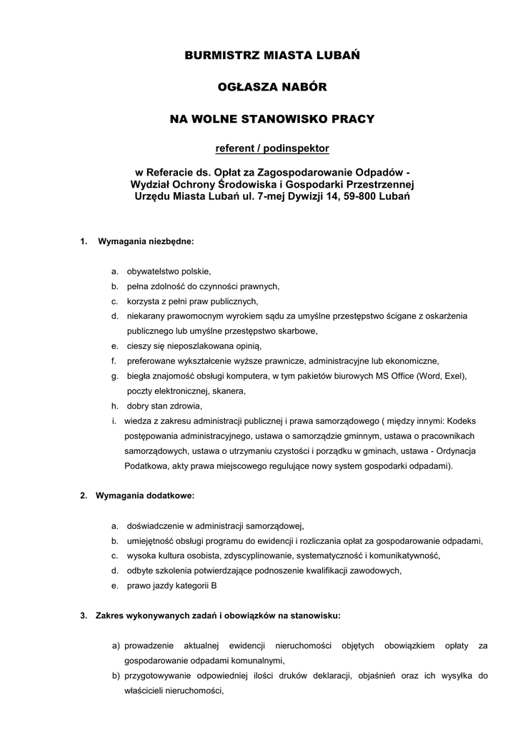 BURMISTRZ MIASTA LUBAŃ OGŁASZA NABÓR NA WOLNE STANOWISKO PRACY referent / podinspektor w Referacie ds. Opłat za Zagospodarowanie Odpadów Wydział Ochrony Środowiska i Gospodarki Przestrzennej Urzędu Miasta Lubań ul. 7-mej Dywizji 14, 59-800 Lubań 1. Wymagania niezbędne: a. obywatelstwo polskie, b. pełna zdolność do czynności prawnych, c. korzysta z pełni praw publicznych, d. niekarany prawomocnym wyrokiem sądu za umyślne przestępstwo ścigane z oskarżenia publicznego lub umyślne przestępstwo skarbowe, e. cieszy się nieposzlakowana opinią, f. preferowane wykształcenie wyższe prawnicze, administracyjne lub ekonomiczne, g. biegła znajomość obsługi komputera, w tym pakietów biurowych MS Office (Word, Exel), poczty elektronicznej, skanera, h. dobry stan zdrowia, i. wiedza z zakresu administracji publicznej i prawa samorządowego ( między innymi: Kodeks postępowania administracyjnego, ustawa o samorządzie gminnym, ustawa o pracownikach samorządowych, ustawa o utrzymaniu czystości i porządku w gminach, ustawa - Ordynacja Podatkowa, akty prawa miejscowego regulujące nowy system gospodarki odpadami). 2. Wymagania dodatkowe: a. doświadczenie w administracji samorządowej, b. umiejętność obsługi programu do ewidencji i rozliczania opłat za gospodarowanie odpadami, c. wysoka kultura osobista, zdyscyplinowanie, systematyczność i komunikatywność, d. odbyte szkolenia potwierdzające podnoszenie kwalifikacji zawodowych, e. prawo jazdy kategorii B 3. Zakres wykonywanych zadań i obowiązków na stanowisku: a) prowadzenie aktualnej ewidencji nieruchomości objętych obowiązkiem opłaty za gospodarowanie odpadami komunalnymi, b) przygotowywanie odpowiedniej ilości druków deklaracji, objaśnień oraz ich wysyłka do właścicieli nieruchomości, c) informowanie właścicieli nieruchomości o sposobie wypełniania deklaracji, d) przygotowywanie na stronę internetową miasta informacji związanych z nowym systemem gospodarki odpadami: - weryfikacja deklaracji o wysokości opłaty za gospodarowanie odpadami komunalnymi, o których mowa w art. 6m ustawy z dnia 13 września 1996 r. o utrzymaniu czystości i porządku w gminach (Dz. U. z 2013 r., poz. 1399 z zm.), e) określanie w drodze decyzji wysokości opłaty za gospodarowanie odpadami komunalnymi w razie nie złożenia przez właściciela nieruchomości deklaracji o wysokości tej opłaty albo powstania uzasadnionych wątpliwości, co do danych zawartych w złożonej przez niego deklaracji, na zasadach określonych w art. 6o ustawy o utrzymaniu czystości i porządku w gminach, f) zobowiązywanie podmiotów prowadzących działalność w zakresie odbierania odpadów komunalnych od właścicieli nieruchomości, prowadzących regionalne instalacje do przetwarzania odpadów komunalnych lub innych posiadaczy odpadów do okazania dokumentów sporządzanych potwierdzających osiągnięcie na potrzeby określonych ewidencji poziomów odpadów recyklingu, oraz dokumentów przygotowania do ponownego użycia i odzysku innymi metodami oraz ograniczenia masy odpadów komunalnych ulegających biodegradacji przekazywanych do składowania w celu weryfikacji danych zawartych w sprawozdaniach, o których mowa w art. 9n ust. 1 ustawy o utrzymaniu czystości i porządku w gminach, g) wydawanie decyzji na podstawie art. 5 ust. 7 w związku z art. 5 ust. 1 pkt 1 ustawy o utrzymaniu czystości i porządku w gminach nakazujących wykonanie obowiązku wyposażania nieruchomości w pojemniki służące do zbierania odpadów komunalnych oraz utrzymywania tych pojemników w odpowiednim stanie sanitarnym, porządkowym i technicznym, h) dokonywanie czynności sprawdzających, o których mowa w art. 272 ustawy z dnia 29 sierpnia 1997 r. – Ordynacja podatkowa (Dz. U. z 2012 r., poz. 749 ze zm.), mających na celu, - sprawdzanie terminowości składania deklaracji, - stwierdzanie formalnej poprawności deklaracji, - ustalanie stanu faktycznego w zakresie niezbędnym do stwierdzenia zgodności z przedstawionymi dokumentami, i) dokonywanie oględzin nieruchomości, za zgodą właściciela nieruchomości, jeżeli jest to niezbędne do zweryfikowania zgodności stanu faktycznego z danymi wynikającymi z deklaracji złożonej przez właściciela nieruchomości, j) współpraca ze Strażą Miejską w zakresie kontroli realizacji obowiązków właścicieli nieruchomości wynikających z ustawy o utrzymaniu czystości i porządku w gminach oraz aktów prawa miejscowego, k) przekazywanie firmie transportującej odpady tzw. operatorowi, - wykazu nieruchomości, z których należy odebrać odpady, - wykazu zamówionych pojemników na odpady, według złożonych deklaracji, l) współpraca z Referatem ds. Podatków i Opłat w celu przekazywania informacji o naliczonych opłatach oraz przekazywania danych niezbędnych do kontroli wpływu opłat, a także naliczania odsetek, egzekucji opłat, itp., m) wykonywanie innych zadań Referatu, wynikających z Regulaminu Organizacyjnego Urzędu Miasta Lubań. 4. Informacje o warunkach pracy na stanowisku referent / podinspektor w Referacie ds. Opłat za Zagospodarowanie Odpadów: a. zatrudnienie od dnia 16.03.2015 r. w pełnym wymiarze czasu pracy, b. zatrudnienie po raz pierwszy następuje na czas określony nie dłuższy niż 6 miesięcy, w ramach którego pracownik odbywa służbę przygotowawczą, c. osoba ubiegająca się o przyjęcie na stanowisko podinspektora podlega obowiązkowym badaniom lekarskim, d. praca w równoważnym czasie pracy, przeciętnie 40 godzin w przeciętnie 5-dniowym tygodniu pracy, w 4-miesięcznym okresie rozliczeniowym, e. praca będzie wykonywana w Referacie ds. Opłat za Zagospodarowanie Odpadów, w Urzędzie Miasta Lubań przy ul. 7-mej Dywizji 14 w Lubaniu. 5. W miesiącu styczniu 2015 r. wskaźnik zatrudnienia osób niepełnosprawnych w Urzędzie Miasta Lubań, w rozumieniu przepisów o rehabilitacji zawodowej i społecznej oraz zatrudnieniu osób niepełnosprawnych nie wyn