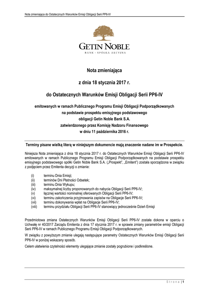Nota zmieniająca do Ostatecznych Warunków Emisji Obligacji Serii PP6-IV Nota zmieniająca z dnia 18 stycznia 2017 r. do Ostatecznych Warunków Emisji Obligacji Serii PP6-IV emitowanych w ramach Publicznego Programu Emisji Obligacji Podporządkowanych na podstawie prospektu emisyjnego podstawowego obligacji Getin Noble Bank S.A. zatwierdzonego przez Komisję Nadzoru Finansowego w dniu 11 października 2016 r. Terminy pisane wielką literą w niniejszym dokumencie mają znaczenie nadane im w Prospekcie. Niniejsza Nota zmieniająca z dnia 18 stycznia 2017 r. do Ostatecznych Warunków Emisji Obligacji Serii PP6-IV emitowanych w ramach Publicznego Programu Emisji Obligacji Podporządkowanych na podstawie prospektu emisyjnego podstawowego spółki Getin Noble Bank S.A. („Prospekt”, „Emitent”) została sporządzona w związku z podjęciem przez Emitenta decyzji o zmianie: (i) (ii) (iii) (iv) (v) (vi) (vii) (viii) terminu Dnia Emisji; terminów Dni Płatności Odsetek; terminu Dnia Wykupu; maksymalnej liczby proponowanych do nabycia Obligacji Serii PP6-IV; łącznej wartości nominalnej oferowanych Obligacji Serii PP6-IV; terminu zakończenia przyjmowania zapisów na Obligacje Serii PP6-IV; terminu dokonywania wpłat na Obligacje Serii PP6-IV; terminu przydziału Obligacji Serii PP6-IV stanowiący jednocześnie Dzień Emisji Przedmiotowa zmiana Ostatecznych Warunków Emisji Obligacji Serii PP6-IV została dokona w oparciu o Uchwałę nr 40/2017 Zarządu Emitenta z dnia 17 stycznia 2017 r. w sprawie zmiany parametrów emisji Obligacji Serii PP6-IV w ramach Publicznego Programu Emisji Obligacji Podporządkowanych. W związku z powyższym zmianie ulegają następujące parametry Ostatecznych Warunków Emisji Obligacji Serii PP6-IV w poniżej wskazany sposób. Celem ułatwienia czytelności elementy ulegające zmianie zostały pogrubione i podkreślone. S t r o n a |1 Nota zmieniająca do Ostatecznych Warunków Emisji Obligacji Serii PP6-IV Wybrane dotychczasowe Ostateczne Warunki Emisji Obligacji Serii PP6-IV podlegające zmianie 2. Dzień Emisji: 3. Dni Płatności Odsetek: 25 stycznia 2017 25 lipca 2017; 25 stycznia 2018; 25 lipca 2018; 25 stycznia 2019; 25 lipca 2019; 27 stycznia 2020; 27 lipca 2020; 25 stycznia 2021; 26 lipca 2021; 25 stycznia 2022; 25 lipca 2022; 25 stycznia 2023; 25 lipca 2023; 25 stycznia 2024. 4. Dzień Wykupu: 25 stycznia 2024 5. Maksymalna liczba Obligacji proponowanych do nabycia w serii: do 40.000 sztuk 6. Łączna wartość nominalna serii: nie więcej niż 40.000.000,00 PLN (słownie: czterdzieści milionów złotych) (…) 16. Termin zakończenia przyjmowania zapisów na Obligacje Serii PP6-IV: 20 stycznia 2017 17. Termin dokonywania wpłat na Obligacje Serii PP6-IV: 20 stycznia 2017 Termin przydziału Obligacji Serii PP6-IV stanowiący jednocześnie Dzień Emisji: 25 stycznia 2017 18. W przypadku zapisu złożonego przez Internet lub telefon zapis taki musi być opłacony najpóźniej w chwili składania tego zapisu Wybrane Ostateczne Warunki Emisji Obligacji Serii PP6-IV po dokonaniu zmiany 2. Dzień Emisji: 3. Dni Płatności Odsetek: 31 stycznia 2017 31 lipca 2017; 31 stycznia 2018; 31 lipca 2018; 31 stycznia 2019; 31 lipca 2019; 31 stycznia 2020; 31 lipca 2020; 1 lutego 2021; 2 sierpnia 2021; 31 stycznia 2022; 1 sierpnia 2022; 31 stycznia 2023; 31 lipca 2023; 31 stycznia 2024. S t r o n a |2 Nota zmieniająca do Ostatecznych Warunków Emisji Obligacji Serii PP6-IV 4. Dzień Wykupu: 31 stycznia 2024 5. Maksymalna liczba Obligacji proponowanych do nabycia w serii: do 42.000 sztuk 6. Łączna wartość nominalna serii: nie więcej niż 42.000.000,00 PLN (słownie: czterdzieści dwa miliony złotych) (…) 16. Termin zakończenia przyjmowania zapisów na Obligacje Serii PP6-IV: 26 stycznia 2017 17. Termin dokonywania wpłat na Obligacje Serii PP6-IV: 26 stycznia 2017 Termin przydziału Obligacji Serii PP6-IV stanowiący jednocześnie Dzień Emisji: 31 stycznia 2017 18. W przypadku zapisu złożonego przez Internet lub telefon zapis taki musi być opłacony najpóźniej w chwili składania tego zapisu S t r o n a |3