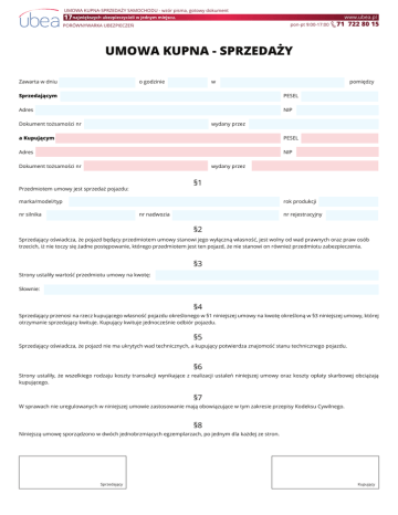 UMOWA KUPNA-SPRZEDAŻY SAMOCHODU - wzór pisma, gotowy dokument 17 największych ubezpieczycieli w jednym miejscu. www.ubea.pl pon-pt 9:00-17:00 PORÓWNYWARKA UBEZPIECZEŃ 71 722 80 15 UMOWA KUPNA - SPRZEDAŻY Zawarta w dniu o godzinie w pomiędzy Sprzedającym PESEL Adres NIP Dokument tożsamości nr wydany przez a Kupującym PESEL Adres NIP Dokument tożsamości nr wydany przez §1 Przedmiotem umowy jest sprzedaż pojazdu: marka/model/typ rok produkcji nr silnika nr nadwozia nr rejestracyjny §2 Sprzedający oświadcza, że pojazd będący przedmiotem umowy stanowi jego wyłączną własność, jest wolny od wad prawnych oraz praw osób trzecich, iż nie toczy się żadne postępowanie, którego przedmiotem jest ten pojazd, że nie stanowi on również przedmiotu zabezpieczenia. §3 Strony ustaliły wartość przedmiotu umowy na kwotę: Słownie: §4 Sprzedający przenosi na rzecz kupującego własność pojazdu określonego w §1 niniejszej umowy na kwotę określoną w §3 niniejszej umowy, której otrzymanie sprzedający kwituje. Kupujący kwituje jednocześnie odbiór pojazdu. §5 Sprzedający oświadcza, że pojazd nie ma ukrytych wad technicznych, a kupujący potwierdza znajomość stanu technicznego pojazdu. §6 Strony ustaliły, że wszelkiego rodzaju koszty transakcji wynikające z realizacji ustaleń niniejszej umowy oraz koszty opłaty skarbowej obciążają kupującego. §7 W sprawach nie uregulowanych w niniejszej umowie zastosowanie mają obowiązujące w tym zakresie przepisy Kodeksu Cywilnego. §8 Niniejszą umowę sporządzono w dwóch jednobrzmiących egzemplarzach, po jednym dla każdej ze stron. Sprzedający Kupujący