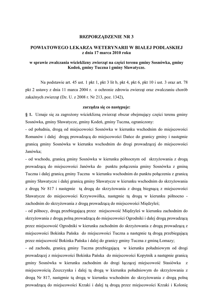R0ZPORZĄDZENIE NR 3 POWIATOWEGO LEKARZA WETERYNARII W BIAŁEJ PODLASKIEJ z dnia 17 marca 2010 roku w sprawie zwalczania wścieklizny zwierząt na części terenu gminy Sosnówka, gminy Kodeń, gminy Tuczna i gminy Sławatycze. Na podstawie art. 45 ust. 1 pkt 1, pkt 3 lit b, pkt 4, pkt 6, pkt 10 i ust. 3 oraz art. 78 pkt 2 ustawy z dnia 11 marca 2004 r. o ochronie zdrowia zwierząt oraz zwalczaniu chorób zakaźnych zwierząt (Dz. U. z 2008 r. Nr 213, poz. 1342), zarządza się co następuje: § 1. Uznaje się za zagrożony wścieklizną zwierząt obszar obejmujący części terenu gminy Sosnówka, gminy Sławatycze, gminy Kodeń, gminy Tuczna, ograniczony: - od południa, drogą od miejscowości Sosnówka w kierunku wschodnim do miejscowości Romanów i dalej drogą prowadzącą do miejscowości Dańce do granicy gminy i następnie granicą gminy Sosnówka w kierunku wschodnim do drogi prowadzącej do miejscowości Janówka; - od wschodu, granicą gminy Sosnówka w kierunku północnym od skrzyżowania z drogą prowadzącą do miejscowości Janówka do punktu połączenia gminy Sosnówka z gminą Tuczna i dalej granicą gminy Tuczna w kierunku wschodnim do punktu połączenia z granicą gminy Sławatycze i dalej granicą gminy Sławatycze w kierunku wschodnim do skrzyżowania z drogą Nr 817 i następnie tą drogą do skrzyżowania z drogą biegnącą z miejscowości Sławatycze do miejscowości Krzywowólka, następnie tą drogą w kierunku północno zachodnim do skrzyżowania z drogą prowadzącą do miejscowości Międzyleś; - od północy, drogą przebiegającą przez miejscowość Międzyleś w kierunku zachodnim do skrzyżowania z drogą polną prowadzącą do miejscowości Ogrodniki i dalej drogą prowadzącą przez miejscowość Ogrodniki w kierunku zachodnim do skrzyżowania z drogą prowadzącą z miejscowości Bokinka Pańska do miejscowości Tuczna a następnie tą drogą przebiegającą przez miejscowość Bokinka Pańska i dalej do granicy gminy Tuczna z gminą Łomazy; - od zachodu, granicą gminy Tuczna przebiegającą w kierunku południowym od drogi prowadzącej z miejscowości Bokinka Pańska do miejscowości Kopytnik a następnie granicą gminy Sosnówka w kierunku zachodnim do drogi łączącej miejscowość Stasiówka z miejscowością Żeszczynka i dalej tą drogą w kierunku południowym do skrzyżowania z drogą Nr 817, następnie tą drogą w kierunku wschodnim do skrzyżowania z drogą polną prowadzącą do miejscowości Krzaki i dalej tą drogą przez miejscowości Krzaki i Kolonię Sosnówka do skrzyżowania z drogą prowadzącą z miejscowości Przechód do miejscowości Sosnówka i tą drogą do skrzyżowania w miejscowości Sosnówka z drogą prowadzącą z miejscowości Rozwadówka Folwark do miejscowości Romanów. § 2. W okręgu zagrożonym, o którym mowa w § 1 wprowadza się zakazy i nakazy. 1. Zakazuje się: 1) urządzania polowań i odłowów zwierząt łownych, bytujących w skupiskach leśnych i na terenie upraw rolnych; 2) przewozu i wywozu psów i kotów oraz innych zwierząt wrażliwych na wściekliznę w charakterze zwierząt towarzyszących z terenu obszaru zagrożonego bez uzyskania uprzedniego zezwolenia Powiatowego Lekarza Weterynarii w Białej Podlaskiej. 2. Nakazuje się: 1) utrzymanie w obejściach psów na u więzi, zaś kotów w zamknięciu; 2) poddanie psów doszczepieniu ochronnemu przeciwko wściekliźnie; 3) sprawowanie nadzoru nad zwierzętami gospodarskimi i domowymi pozostawionymi w okólnikach i na wybiegach; 4) wywieszenie przez wójtów gmin położonych w obszarze zagrożonym przy drogach publicznych ogłoszenia o następującej treści: „UWAGA! WŚCIEKLIZNA ZWIERZĄT!”. § 3. 1. Zakazy i nakazy, o których mowa w § 2, obowiązują mieszkańców i osoby przebywające czasowo na danym terenie, a także właścicieli, użytkowników i zarządców gruntów, służbę leśną, zarządców i dzierżawców obwodów łowieckich. 2. Kto nie stosuje się do nakazów, zakazów wydanych w celu zwalczania choroby zakaźnej zwierząt, określonych w § 2, podlega grzywnie, karze ograniczenia wolności albo pozbawienia wolności do lat 3 § 4. Wójtowie Gmin Sosnówka, Sławatycze, Kodeń, Tuczna powiadomią ludność o zakazach i nakazach wynikających z niniejszego rozporządzenia. § 5. Rozporządzenie podlega podaniu do publicznej wiadomości w sposób zwyczajowo przyjęty. § 6. Rozporządzenie podlega ogłoszeniu w Dzienniku Urzędowym Województwa Lubelskiego. § 7. Rozporządzenie wchodzi w życie z dniem podania do publicznej wiadomości. Powiatowy Lekarz Weterynarii w Białej Podlaskiej Radomir Bańko