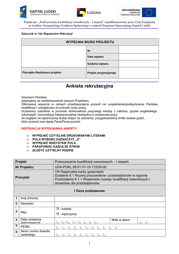 Projekt pn.: „Podwyższanie kwalifikacji zawodowych – I stopień” współfinansowany przez Unię Europejską ze środków Europejskiego Funduszu Społecznego w ramach Programu Operacyjnego Kapitał Ludzki Załącznik nr 1do Regulaminu Rekrutacji WYPEŁNIA BIURO PROJEKTU Nr Data wpływu Godzina wpływu Pieczątka Realizatora projektu Podpis przyjmującego Ankieta rekrutacyjna Szanowni Państwo, dziękujemy za zainteresowanie naszym Projektem. Oferowane wsparcie w ramach przedsięwzięcia pozwoli na uzupełnienie/podwyższenie Państwa kwalifikacji i umiejętności do potrzeb rynku pracy. Uczestnicy szkolenia w procesie doskonalenia pozyskają wiedzę z zakresu: języka angielskiego, informatyki i komunikacji interpersonalnej niezbędną w codziennej pracy. Ze względu na ograniczoną liczbę miejsc na szkolenie, przygotowaliśmy krótki zestaw pytań, który pozwoli nam lepiej Pana/Panią poznać. INSTRUKCJA WYPEŁNIANIA ANKIETY: • • • • • WYPEŁNIĆ CZYTELNIE DRUKOWANYMI LITERAMI POLA WYBORU ZAZNACZYĆ „X” WYPEŁNIĆ WSZYSTKIE POLA PARAFOWAĆ KAŻDĄ ZE STRON ZŁOŻYĆ CZYTELNY PODPIS Projekt Podwyższanie kwalifikacji zawodowych – I stopień Nr Projektu: UDA-POKL.08.01.01-10-172/09-00 VIII Regionalne kadry gospodarki Działanie 8.1 Rozwój pracowników i przedsiębiorstw w regionie Poddziałanie 8.1.1 Wspieranie rozwoju kwalifikacji zawodowych i doradztwo dla przedsiębiorstw Priorytet: I Dane podstawowe 1 Imię (imiona) 2 Nazwisko 3 Płeć 4 - kobieta Data urodzenia /dzień/miesiąc/rok/ 5 6 PESEL Seria i numer dowodu osobistego - mężczyzna Wiek w latach ∟ ∟ -∟ ∟- ∟ ∟ ∟ ∟ ∟ ∟ ∟ ∟ ∟ ∟ ∟ ∟ ∟ ∟ ∟ ∟ ∟ ∟ ∟ ∟ ∟ ∟ ∟ ∟ 1 ∟ ∟ Projekt pn.: „Podwyższanie kwalifikacji zawodowych – I stopień” współfinansowany przez Unię Europejską ze środków Europejskiego Funduszu Społecznego w ramach Programu Operacyjnego Kapitał Ludzki - brak - podstawowe - gimnazjalne 7 Wykształcenie - ponadgimnazjalne /wykształcenie średnie lub zasadnicze zawodowe/ - pomaturalne /wykształcenie na poziomie powyżej szkoły średniej, które jednocześnie nie jest wykształceniem wyższym/ - wyższe /uzyskany tytuł licencjata, magistra, inżyniera, doktora lub ukończone studia podyplomowe albo doktoranckie/ II Adres pobytu stałego lub tymczasowego 1 Ulica/Aleja/Osiedle 2 Nr domu 3 Nr lokalu 4 Nazwa miejscowości 5 Kod pocztowy 6 Poczta 7 Obszar 8 Powiat 9 Województwo ∟ ∟ ∟ ∟ ∟ ∟ ∟ ∟ ∟ ∟ -∟ ∟ ∟ miasto wieś III Adres korespondencyjny (proszę podać, jeśli jest inny niż adres zameldowania) 1 Ulica/Aleja/Osiedle 2 Nr domu 3 Nr lokalu 4 Nazwa miejscowości 5 Kod pocztowy 6 Poczta 7 Obszar 8 Powiat 9 Województwo 1 Telefon stacjonarny /z nr kierunkowym/ Telefon komórkowy ∟ ∟ ∟ ∟ ∟ ∟ ∟ ∟ ∟ ∟ -∟ ∟ ∟ miasto wieś IV Dane kontaktowe 2 3 Adres poczty elektronicznej 1 Pracująca osoba dorosła (powyżej 18 roku życia), wykonująca pracę na podstawie: (∟ ∟ ∟ ) ∟ ∟ ∟ ∟ ∟ ∟ ∟ ∟ ∟ ∟ ∟ ∟ ∟ ∟ ∟ ∟ V Status Uczestnika Projektu umowy o pracę spółdzielczej umowy o pracę powołania umowy o dzieło wyboru umowy zlecenia mianowania 2 Projekt pn.: „Podwyższanie kwalifikacji zawodowych – I stopień” współfinansowany przez Unię Europejską ze środków Europejskiego Funduszu Społecznego w ramach Programu Operacyjnego Kapitał Ludzki 2 Pracownik w gorszym położeniu TAK NIE VI Dane dotyczące miejsca pracy 1 2 3 4 Nazwa firmy/pracodawcy Adres firmy/pracodawcy Branża/sektor działalności Zatrudniony/a w*: mikroprzedsiębiorstwie * definicję mikro, małego i średniego przedsiębiorcy stanowi załącznik nr 3 małym przedsiębiorstwie średnim przedsiębiorstwie dużym przedsiębiorstwie finanse i księgowość 5 Obszar zatrudnienia: kadry i płace gospodarka magazynowa sprzedaż inne (jakie?): .......................................................................... VII Informacje dotyczące udziału w projekcie .............................................................................................. .............................................................................................. 1 Dlaczego chce Pan/i uzupełniać/podwyższać kwalifikacje i umiejętności poprzez udział w Projekcie? .............................................................................................. .............................................................................................. .............................................................................................. .............................................................................................. .............................................................................................. 2 3 Dlaczego chce Pan/i wziąć udział w szkoleniu w zakresie język angielski, informatyka, komunikacja interpersonalna? Poziom wiedzy z języka angielskiego .............................................................................................. .............................................................................................. .............................................................................................. .............................................................................................. .............................................................................................. a). nigdy się nie uczyłam / uczyłem 3 Projekt pn.: „Podwyższanie kwalifikacji zawodowych – I stopień” współfinansowany przez Unię Europejską ze środków Europejskiego Funduszu Społecznego w ramach Programu Operacyjnego Kapitał Ludzki b). uczyłam się / uczyłem się Liczba lat nauki: ............................................................................................... .......................................................................................................................... Swój poziom umiejętności obsłu