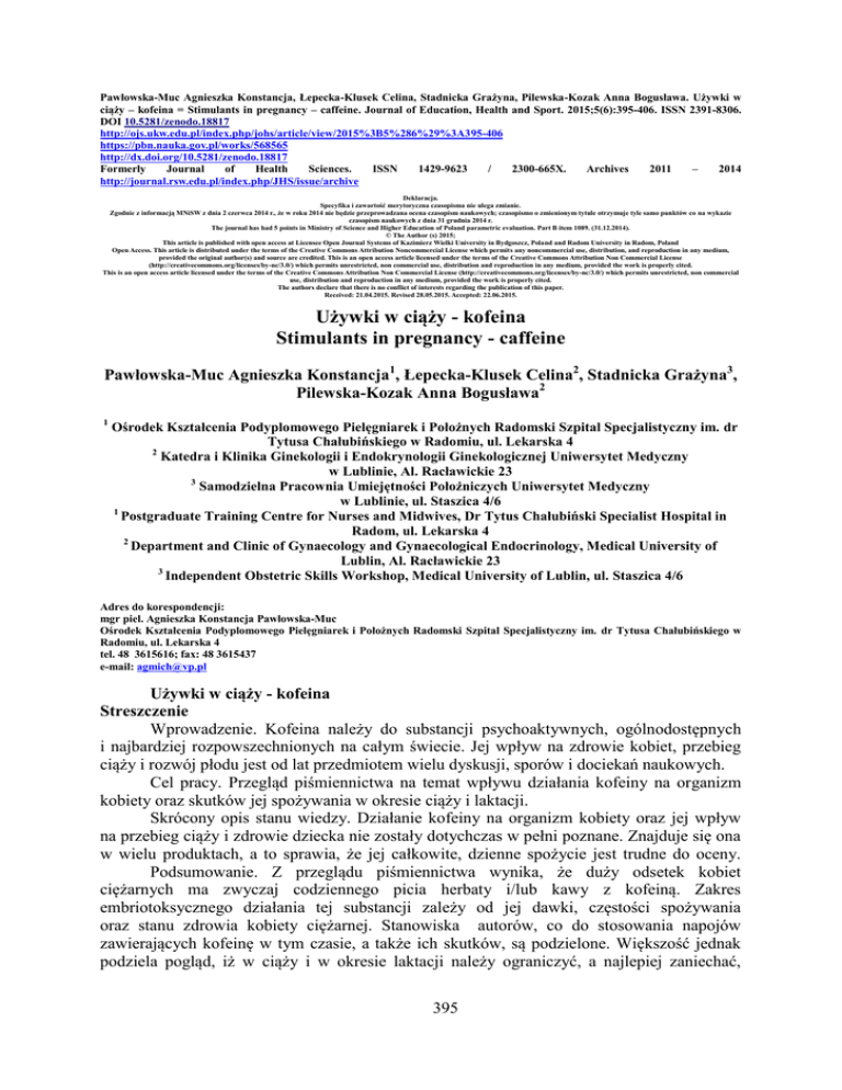 Pawłowska-Muc Agnieszka Konstancja, Łepecka-Klusek Celina, Stadnicka Grażyna, Pilewska-Kozak Anna Bogusława. Używki w ciąży – kofeina = Stimulants in pregnancy – caffeine. Journal of Education, Health and Sport. 2015;5(6):395-406. ISSN 2391-8306. DOI 10.5281/zenodo.18817 http://ojs.ukw.edu.pl/index.php/johs/article/view/2015%3B5%286%29%3A395-406 https://pbn.nauka.gov.pl/works/568565 http://dx.doi.org/10.5281/zenodo.18817 Formerly Journal of Health Sciences. ISSN 1429-9623 / 2300-665X. Archives 2011 – 2014 http://journal.rsw.edu.pl/index.php/JHS/issue/archive Deklaracja. Specyfika i zawartość merytoryczna czasopisma nie ulega zmianie. Zgodnie z informacją MNiSW z dnia 2 czerwca 2014 r., że w roku 2014 nie będzie przeprowadzana ocena czasopism naukowych; czasopismo o zmienionym tytule otrzymuje tyle samo punktów co na wykazie czasopism naukowych z dnia 31 grudnia 2014 r. The journal has had 5 points in Ministry of Science and Higher Education of Poland parametric evaluation. Part B item 1089. (31.12.2014). © The Author (s) 2015; This article is published with open access at Licensee Open Journal Systems of Kazimierz Wielki University in Bydgoszcz, Poland and Radom University in Radom, Poland Open Access. This article is distributed under the terms of the Creative Commons Attribution Noncommercial License which permits any noncommercial use, distribution, and reproduction in any medium, provided the original author(s) and source are credited. This is an open access article licensed under the terms of the Creative Commons Attribution Non Commercial License (http://creativecommons.org/licenses/by-nc/3.0/) which permits unrestricted, non commercial use, distribution and reproduction in any medium, provided the work is properly cited. This is an open access article licensed under the terms of the Creative Commons Attribution Non Commercial License (http://creativecommons.org/licenses/by-nc/3.0/) which permits unrestricted, non commercial use, distribution and reproduction in any medium, provided the work is properly cited. The authors declare that there is no conflict of interests regarding the publication of this paper. Received: 21.04.2015. Revised 28.05.2015. Accepted: 22.06.2015. Używki w ciąży - kofeina Stimulants in pregnancy - caffeine Pawłowska-Muc Agnieszka Konstancja1, Łepecka-Klusek Celina2, Stadnicka Grażyna3, Pilewska-Kozak Anna Bogusława2 1 Ośrodek Kształcenia Podyplomowego Pielęgniarek i Położnych Radomski Szpital Specjalistyczny im. dr Tytusa Chałubińskiego w Radomiu, ul. Lekarska 4 2 Katedra i Klinika Ginekologii i Endokrynologii Ginekologicznej Uniwersytet Medyczny w Lublinie, Al. Racławickie 23 3 Samodzielna Pracownia Umiejętności Położniczych Uniwersytet Medyczny w Lublinie, ul. Staszica 4/6 1 Postgraduate Training Centre for Nurses and Midwives, Dr Tytus Chałubiński Specialist Hospital in Radom, ul. Lekarska 4 2 Department and Clinic of Gynaecology and Gynaecological Endocrinology, Medical University of Lublin, Al. Racławickie 23 3 Independent Obstetric Skills Workshop, Medical University of Lublin, ul. Staszica 4/6 Adres do korespondencji: mgr piel. Agnieszka Konstancja Pawłowska-Muc Ośrodek Kształcenia Podyplomowego Pielęgniarek i Położnych Radomski Szpital Specjalistyczny im. dr Tytusa Chałubińskiego w Radomiu, ul. Lekarska 4 tel. 48 3615616; fax: 48 3615437 e-mail: [email protected] Używki w ciąży - kofeina Streszczenie Wprowadzenie. Kofeina należy do substancji psychoaktywnych, ogólnodostępnych i najbardziej rozpowszechnionych na całym świecie. Jej wpływ na zdrowie kobiet, przebieg ciąży i rozwój płodu jest od lat przedmiotem wielu dyskusji, sporów i dociekań naukowych. Cel pracy. Przegląd piśmiennictwa na temat wpływu działania kofeiny na organizm kobiety oraz skutków jej spożywania w okresie ciąży i laktacji. Skrócony opis stanu wiedzy. Działanie kofeiny na organizm kobiety oraz jej wpływ na przebieg ciąży i zdrowie dziecka nie zostały dotychczas w pełni poznane. Znajduje się ona w wielu produktach, a to sprawia, że jej całkowite, dzienne spożycie jest trudne do oceny. Podsumowanie. Z przeglądu piśmiennictwa wynika, że duży odsetek kobiet ciężarnych ma zwyczaj codziennego picia herbaty i/lub kawy z kofeiną. Zakres embriotoksycznego działania tej substancji zależy od jej dawki, częstości spożywania oraz stanu zdrowia kobiety ciężarnej. Stanowiska autorów, co do stosowania napojów zawierających kofeinę w tym czasie, a także ich skutków, są podzielone. Większość jednak podziela pogląd, iż w ciąży i w okresie laktacji należy ograniczyć, a najlepiej zaniechać, 395 spożywanie takich napojów. Zasadne jest zatem, aby działania promujące i wspierające zdrowy styl życia kobiet w wieku rozrodczym dotyczyły, między innymi, tej kwestii. Słowa kluczowe: kofeina, ciężarna, zdrowie, ciąża, płód. Stimulants in pregnancy - caffeine Summary Introduction. Caffeine belongs to the group of psychoactive substances, which are available to the public and widely propagated around the whole world. Its effect on women’s health, the course of pregnancy and the development of the foetus has been the subject of many discussions, arguments and scientific research for many years. Aim. The review of bibliography on the subject of the effects of caffeine on women’s organism and the results of its consumption during pregnancy and lactation. Brief description of the state of the art. The effects of caffeine on the organism of a woman and its influence on parturition and the health of the baby have not yet been fully identified. It can be found in many food products, which makes it hard to evaluate its total daily intake. Conclusion. The review of the bibliography indicates that a significant number of pregnant women habitually consumes tea and/or coffee containing caffeine every day. The scope of the embryotoxic effects of this substance depends on its dosage, the frequen