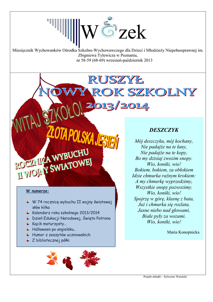 W zek Miesięcznik Wychowanków Ośrodka Szkolno-Wychowawczego dla Dzieci i Młodzieży Niepełnosprawnej im. Zbigniewa Tylewicza w Poznaniu, nr 58-59 (68-69) wrzesień-październik 2013 DESZCZYK W numerze: W 74 rocznicę wybuchu II wojny światowej słów kilka Kalendarz roku szkolnego 2013/2014 Dzień Edukacji Narodowej, Święto Patrona Kącik maturzysty… Halloween po angielsku… Humor z zeszytów uczniowskich Z bibliotecznej półki Mój deszczyku, mój kochany, Nie padajże na te łany, Nie padajże na te kopy, Bo my dzisiaj zwozim snopy. Wio, koniki, wio! Bokiem, bokiem, za obłokiem Idzie chmurka raźnym krokiem: A my chmurkę wyprzedzimy, Wszystkie snopy pozwozimy. Wio, koniki, wio! Spojrzę w górę, klasnę z bata, Już i chmurka się rozlata, Jasne niebo nad głowami, Białe pyły za wozami. Wio, koniki, wio! Maria Konopnicka Projekt okładki – Sylwester Warański RUSZYŁ NOWY ROK SZKOLNY 2013/2014… 2 września 2013 roku rozpoczął się nowy rok szkolny 2013/2014. Wielu z nas zastanawia się, co przyniesie kolejny etap nauki i szkolnego Ŝycia… Jednak wrzesień to nie tylko początek nowego roku szkolnego. To takŜe kolejne rocznice wybuchu II wojny światowej. Z kolei w październiku obchodzimy Dzień Edukacji Narodowej, a w naszym Ośrodku Dzień Patrona i Ślubowanie Pierwszoklasistów. Nie zapominajmy, Ŝe październik to równieŜ początek jesieni, a moŜe okaŜe się ona w tym roku najpiękniejsza, wyjątkowa? Te wszystkie wydarzenia i rocznice będą częścią naszego szkolnego Ŝycia, które – miejmy nadzieję – przyniesie przede wszystkim pozytywne dla nas efekty. Szczególnie gorąco witamy pierwszaków i wierzymy, Ŝe prędko zŜyją się z naszym Ośrodkiem. Wszystkim zaś Ŝyczymy dobrego roku szkolnego. Oby ten rok szkolny był wyjątkowy! W zek W 74 rocznicę wybuchu II wojny światowej słów kilka II wojna konflikt światowa zbrojny w – największy historii świata, trwający od 1 września 1939 do 2 września 1945 roku (w Europie do 8 maja 1945), obejmujący zasięgiem działań wojennych Europę, wschodnią wschodnią Azję, prawie i całą południowo- północną Afrykę, część Bliskiego Wschodu i wszystkie oceany. Niektóre epizody wojny rozgrywały się nawet w Arktyce i Ameryce Północnej. Poza większością państw europejskich i ich koloniami, brały w niej udział państwa Ameryki Północnej i Ameryki Południowej oraz Azji. Głównymi stronami konfliktu były państwa Osi i państwa koalicji antyhitlerowskiej (alianci). W wojnie uczestniczyło 1,7 mld ludzi, w tym 110 mln z bronią . Według różnych szacunków zginęło w niej od 50 do 78 milionów ludzi. Za datę rozpoczęcia wojny przyjmuje się 1 września 1939 roku – atak Niemiec na Polskę. 3 września przystąpiły do wojny Wielka Brytania i Francja (w piśmiennictwie zachodnim podaje się czasami tę drugą datę jako początek wojny światowej). Niektórzy historycy za początek wojny światowej uznają wojnę chińsko-japońską, rozpoczętą 7 lipca 1937 roku najazdem wojsk japońskich, jednakże aż do 1941 roku konflikt ten pozostawał lokalny. W historiografii radzieckiej istniało pojęcie Wielkiej Wojny Ojczyźnianej, rozpoczętej 22 czerwca 1941 roku atakiem niemieckim. Dla Amerykanów wojna rozpoczęła się 7 grudnia 1941 roku, wraz z japońskim atakiem na Pearl Harbor. Mateusz Lisiecki – źródła internetowe KALENDARZ ROKU SZKOLNEGO NAJWAśNIEJSZE WYDARZENIA 1. Rozpoczęcie rocznych zajęć dydaktycznowychowawczych 2 września 2013 r. 2. Zebranie Rodziców 28 września 2013 r. 3. Dzień Patrona 14 października 2013 r. 4. Koniec I semestru dla kl. 3 LO 6 grudnia 2013 r. 5. Zimowa przerwa świąteczna 23 - 31 grudnia 2013 r. 7. Koniec I semestru 31 stycznia 2014 r. 8. Ferie zimowe 3 - 16 lutego 2014 r. 9. Wiosenna przerwa świąteczna 17 - 22 kwietnia 2014 r. 10. Zakończenie zajęć w kl. 3 LO 25 kwietnia 2014 r. 11. Dzień wolny od zajęć 2 maja 2014 r. 5 maja 2014 r. - j. polski (pp) 12. Egzamin maturalny pisemny 6 maja 2014 r. - matematyka (pp) 7 maja 2014 r. - j. angielski (pp) 13. Egzamin maturalny ustny 5 - 30 maja 2014 r. 14. Zakończenie zajęć w kl. 3 ZSZ 13 czerwca 2014 r. 15. Dzień wolny od zajęć 20 czerwca 2014 r. 19. Zakończenie rocznych zajęć dydaktycznowychowawczych 27 czerwca 2014 r. 20. Ferie letnie 28 czerwca - 31 sierpnia 2014 r. Źródło – strona internetowa Ośrodka Dzień Edukacji Narodowej, Święto Patrona Uroczysta akademia z okazji Święta Edukacji Narodowej, Dnia Patrona oraz Ślubowania Uczniów Klas Pierwszych rozpoczęła się punktualnie o godzinie 10.00. W tym roku scena w auli przemieniła się w leszczyński Rynek z okresu okupacji, gdyŜ scenografia autorstwa Państwa Reszel miała nas przenieść w czasy, gdy Patron – Zbigniew Tylewicz pracował w księgarni Państwa Weirach w Lesznie (szczególne podziękowania dla Pani Iwony Cichowskiej i Pana Zygmunta Wawrzynowskiego, którzy udostępnili rekwizyty z epoki). Najpierw usłyszeliśmy piosenkę Mimozami jesień się zaczyna w wykonaniu Czesława Niemena – było to nawiązanie do Roku Juliana Tuwima (to on jest autorem wiersza). Jako konferansjerzy zaprezentowali się uczniowie: Magdalena Hajduk, Angelika Kucharzak, Zuzanna Pilarska i Marek Landzwojczak. Oprawę oraz prezentację multimedialną, towarzyszącą całej uroczystości przygotowała Pani Barbara Nowak. Po powitaniu przybyłych gości i wręczeniu kwiatów Pani Teresie Tylewicz – Ŝonie naszego Patrona (która w tym roku odwiedziła nas w towarzystwie córki i dwojga wnucząt), głos zabrała Pani Dyrektor Aleksandra Skorniak. Podziękowała wszystkim dotychczas uhonorowanym statuetką SOWY Przyjaciołom Ośrodka oraz zaprosiła do tego grona dr Ewę Sierakowską – Grottel, kierującą pracą Zespołu Poradni Specjalistycznych MEDYK w Poznaniu (za opiekę medyczną) oraz Pana Mariana Suchaneckiego, który odebrał statuetkę dla Centrum Sztuki Dziecka w Poznaniu (za wprowadzenie młodz