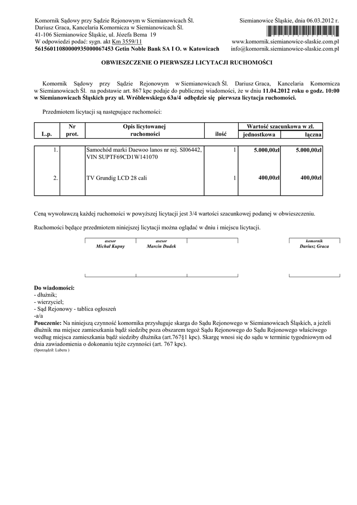 Komornik Sądowy przy Sądzie Rejonowym w Siemianowicach Śl. Dariusz Graca, Kancelaria Komornicza w Siemianowicach Śl. 41-106 Siemianowice Śląskie, ul. Józefa Bema 19 W odpowiedzi podać: sygn. akt Km 3559/11 56156011080000935000067453 Getin Noble Bank SA I O. w Katowicach Siemianowice Śląskie, dnia 06.03.2012 r. *0012030600133* www.komornik.siemianowice-slaskie.com.pl [email protected] OBWIESZCZENIE O PIERWSZEJ LICYTACJI RUCHOMOŚCI Komornik Sądowy przy Sądzie Rejonowym w Siemianowicach Śl. Dariusz Graca, Kancelaria Komornicza w Siemianowicach Śl. na podstawie art. 867 kpc podaje do publicznej wiadomości, że w dniu 11.04.2012 roku o godz. 10:00 w Siemianowicach Śląskich przy ul. Wróblewskiego 63a/4 odbędzie się pierwsza licytacja ruchomości. Przedmiotem licytacji są następujące ruchomości: Nr prot. L.p. Opis licytowanej ruchomości Wartość szacunkowa w zł. jednostkowa łączna ilość 1. Samochód marki Daewoo lanos nr rej. SI06442, VIN SUPTF69CD1W141070 1 5.000,00zł 5.000,00zł 2. TV Grundig LCD 28 cali 1 400,00zł 400,00zł Ceną wywoławczą każdej ruchomości w powyższej licytacji jest 3/4 wartości szacunkowej podanej w obwieszczeniu. Ruchomości będące przedmiotem niniejszej licytacji można oglądać w dniu i miejscu licytacji. asesor asesor komornik Michał Kupny Marcin Dudek Dariusz Graca Do wiadomości: - dłużnik; - wierzyciel; - Sąd Rejonowy - tablica ogłoszeń -a/a Pouczenie: Na niniejszą czynność komornika przysługuje skarga do Sądu Rejonowego w Siemianowicach Śląskich, a jeżeli dłużnik ma miejsce zamieszkania bądź siedzibę poza obszarem tegoż Sądu Rejonowego do Sądu Rejonowego właściwego według miejsca zamieszkania bądź siedziby dłużnika (art.767§1 kpc). Skargę wnosi się do sądu w terminie tygodniowym od dnia zawiadomienia o dokonaniu tejże czynności (art. 767 kpc). (Sporządził: Lubera )