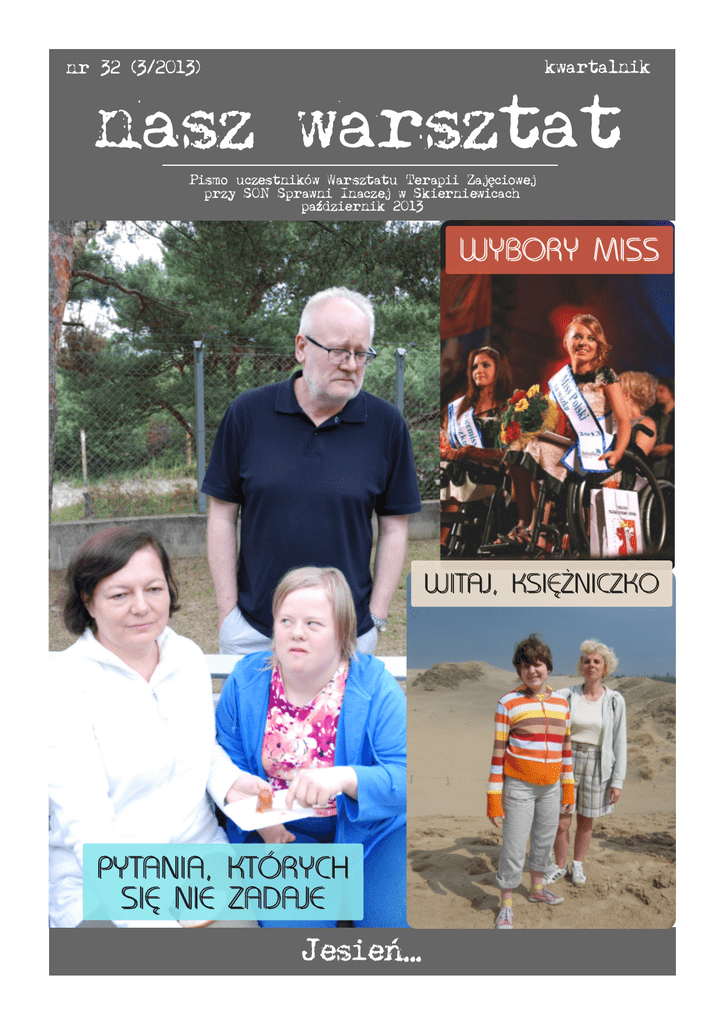kwartalnik nr 32 (3/2013) nasz warsztat Pismo uczestników Warsztatu Terapii przy SON Sprawni Zajęciowej Inaczej w Skierniewicach październik 2013 W Y B OR Y MI S S W I TA J , KS I Ę ŻN I CZKO PY TA N I A , KTÓR Y CH S I Ę N I E ZA D A J E Jesień... Redakcj a Skierniewice, ul. Waryńskiego 14, Tomasz S koneczny - specjalizuje się w wywiadach i komentowaniu wydarzeń społeczno-politycznych. e-mail: tomkony@wp. pl Agnieszka S komorow - daje się poznać jako świetna obserwatorka życia, kochająca podróże, wrażliwa na ludzi i przyrodę. e-mail: agnieszkaskomorow@o2. pl Roman Hańczuk - miłośnik wojskowości i historii, wprowadza w arkana sztuk wojennych, redaguje kącik kulinarny. e-mail: dzikirh@wp. pl Paweł Maj ewski - zajmuje się relacjonowaniem wydarzeń. e-mail: pmaj es@wp. pl Krzysztof S kowroński - współpracuje z kwartalnikiem, pisze relacje z wydarzeń e-mail: skowron@onet. eu Katarzyna Wesołowska - debiutuje w kwartalniku relacjami z wydarzeń e-mail: kasiawesolowska8 4@wp. pl Tomek Trębski - debiutuje w kwartalniku relacjami z wydarzeń Korespondenci: B ożena Lesiak - przeprowadza wywiady, pisze sprawozdania z codziennych wydarzeń i wspomnienia. e-mail: bonia_l@o2. pl B ogusław Puzio - tworzy dział humoru w kwartalniku, dba o uśmiech czytelników. Paulina Rohoza - zajmuje się relacjonowaniem życia e-mail: paulka1 47 @wp. pl Zenon S ynaj ewski - zajmuje się sprawozdaniami z codziennych wydarzeń. e-mail: synaj 7 7 @op. pl 2 Od redakcj i W poprzednim numerze naszego czasopisma poinformowaliśmy o zmianach w naszej redakcji związanych z odejściem czterech dziennikarzy do pracy w Spółdzielni Inwalidów Zakładzie Elementów Indukcyjnych w Skierniewicach. Okazuje się, że to nie koniec zmian w składzie redakcyjnym kwartalnika „Nasz Warsztat”. Z wielką przyjemnością pragniemy poinformować, że nasza koleżanka Bożena Lesiak podjęła od 20 sierpnia pracę w firmie Selen. Mamy nadzieję, że zostanie zatrudniona na stałe, czego życzymy z całego serca. Życzymy również pomyślności, satysfakcji i radości z pracy wśród życzliwych współpracowników, jak i dobrego wynagrodzenia. Serdecznie dziękujemy za dotychczasową pracę dziennikarską. Mamy nadzieję, że pozostaniesz, w miarę Twoich możliwości, w naszej warsztatowej redakcji. Jednocześnie gorąco pragniemy oficjalnie powitać wśród nas nowych dziennikarzy Pawła Majewskiego, Tomasza Trębskiego i Katarzynę Wesołowską. Życzymy, aby praca dziennikarska sprawiała Wam mnóstwo satysfakcji, a pisanie przynosiło wiele radości i stało się dla Was nową pasją. Serdecznie witamy w naszym gronie redakcyjnym. Redakcja kwartalnika Marzenie Śliwińskiej i Jej Rodzinie wyrazy głębokiego współczucia z powodu śmierci TE Ś C I A składają uczestnicy i pracownicy WTZ w Skierniewicach Milenie Ulanowskiej i Jej Rodzinie wyrazy głębokiego współczucia z powodu śmierci B AB CI składają uczestnicy i pracownicy WTZ w Skierniewicach Wsp ółp ra ca : Danuta Czerwińska, Artur Kozyra, Marzena Rafińska. S kła d i d ru k: pracownia komputerowa WTZ Skierniewice. Kwa rta l n i k " N a sz Wa rszta t" u ka zu j e si ę d zi ę ki wsp a rci u fi n a n sowe m u S towa rzysze n i a Ra d a P ol e k nasz warsztat 32 (3/2013) wywiad PYwywiad TANz Andrzejem IA KTSuchcickim ÓRYpomysłodawcą CH S IĘi koordynatorem NIE ZAprojektu D A JE STARAMY SIĘ MÓWIĆ O ZESPOLE DOWNA Andrzej Suchcicki jest członkiem i współzałożycielem Stowarzyszenia Rodzin i Opiekunów Osób z Zespołem Downa „Bardziej Kochani" w Warszawie, które powstało w 2001 r. Staramy się jak najwięcej mówić o zespole Downa społeczeństwu. – mówi Andrzej Suchcicki – Stąd nasza stosunkowo częsta obecność w mediach, działania promocyjne, wystawy, wreszcie ostatnio książki. Stowarzyszenie wydało w 201 3 r. książkę pt. „Pytania, których się nie zadaje”, w której dwunastu dziennikarzy przedstawiło w reportażach historie osób z zespołem Downa. Można przeczytać w nich o zatrudnieniu osób z zespołem Downa, o przyjaźniach, zauroczeniach, radościach, smutkach, troskach, zmartwieniach, problemach zarówno tych osób, jak i ich rodzin. Rodzice dzieci z zespołem Downa mogą znaleźć w stowarzyszeniu informacje, uspokojenie, rady, szkolenia. Tom a sz S kon e czn y: S towa rzysze n i e Rod zi n i O p i eku n ów O sób z Ze sp ołe m D own a „ B a rd zi e j Koch an i ” d zi a ła od roku 2 0 0 1 . J a k zrod zi ła si ę i d e a p owsta n i a stowa rzysze n i a ? An d rze j S u ch ci cki : Stowarzyszenie to była kontynuacja dużo wcześniejszych działań. Już w 1 996 roku powstała nieformalna grupa rodziców dzieci z zespołem Downa, bardzo małych dzieci – dodajmy. Grupa powstała z inicjatywy Ewy Danielewskiej, która na tablicy ogłoszeń w Ośrodku Wczesnej Interwencji, mieszczącym się przy ulicy Pilickiej w Warszawie, umieściła kartkę: Mam dziecko z zespołem Downa, jeśli też macie spotkajmy się, może coś zrobimy razem. Spotkaliśmy się i tak się zaczęło. Przez blisko 5 lat grupa działała na poły nieformalnie, choć teoretycznie byliśmy Sekcją Dziecięcą Warszawskiego Koła Polskiego Stowarzyszenia na Rzecz Osób z Upośledzeniem Umysłowym. Grupa rosła i rosła. Spotykaliśmy się w każdy ostatni poniedziałek miesiąca, na każde spotkanie zapraszaliśmy jakiegoś specjalistę, ale ważniejsze były nasze wzajemne rozmowy i dzielenie się doświadczeniami i przemyśleniami. Organizowaliśmy turnusy rehabilitacyjne. Jak dziś na to patrzę to pusty śmiech mnie ogarnia. Wyjeżdżaliśmy gdzieś w Polskę, braliśmy ze sobą kilku terapeutów i przez dwa tygodnie bie- fot.: Monika Bajkowska galiśmy od jednego do drugiego z dziećmi. Trzeba być bardzo, bardzo naiwnym by wierzyć, że przez dwa tygodnie dokona się rehabilitacyjnego cudu. Ale byliśmy młodzi i wierzyliśmy, że nam się uda. Dzisiaj młodzi rodzice też mają to samo przekonanie. Wysta