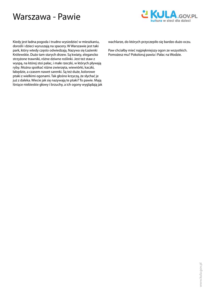 Warszawa - Pawie wachlarze, do których przyczepiło się bardzo dużo oczu. Paw chciałby mieć najpiękniejszy ogon ze wszystkich. Pomożesz mu? Pokoloruj pawia i Pałac na Wodzie. www.kula.gov.pl Kiedy jest ładna pogoda i trudno wysiedzieć w mieszkaniu, dorośli i dzieci wyruszają na spacery. W Warszawie jest taki park, który wtedy często odwiedzają. Nazywa się Łazienki Królewskie. Dużo tam starych drzew. Są kwiaty, elegancko strzyżone trawniki, różne dziwne roślinki. Jest też staw z wyspą, na której stoi pałac, i małe rzeczki, w których pływają ryby. Można spotkać różne zwierzęta, wiewiórki, kaczki, łabędzie, a czasem nawet sarenki. Są też duże, kolorowe ptaki z wielkimi ogonami. Tak głośno krzyczą, że słychać je już z daleka. Wiecie jak się nazywają te ptaki? To pawie. Mają lśniące niebieskie głowy i brzuchy, a ich ogony wyglądają jak www.kula.gov.pl www.kula.gov.pl www.kula.gov.pl 11 pawi wybrało się na spacer do miasta. Spróbuj je odnaleźć.