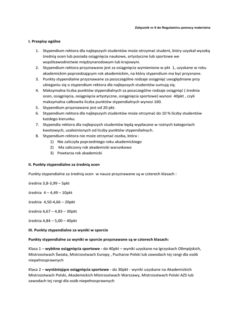 I. Przepisy ogólne 1. Stypendium rektora dla najlepszych studentów